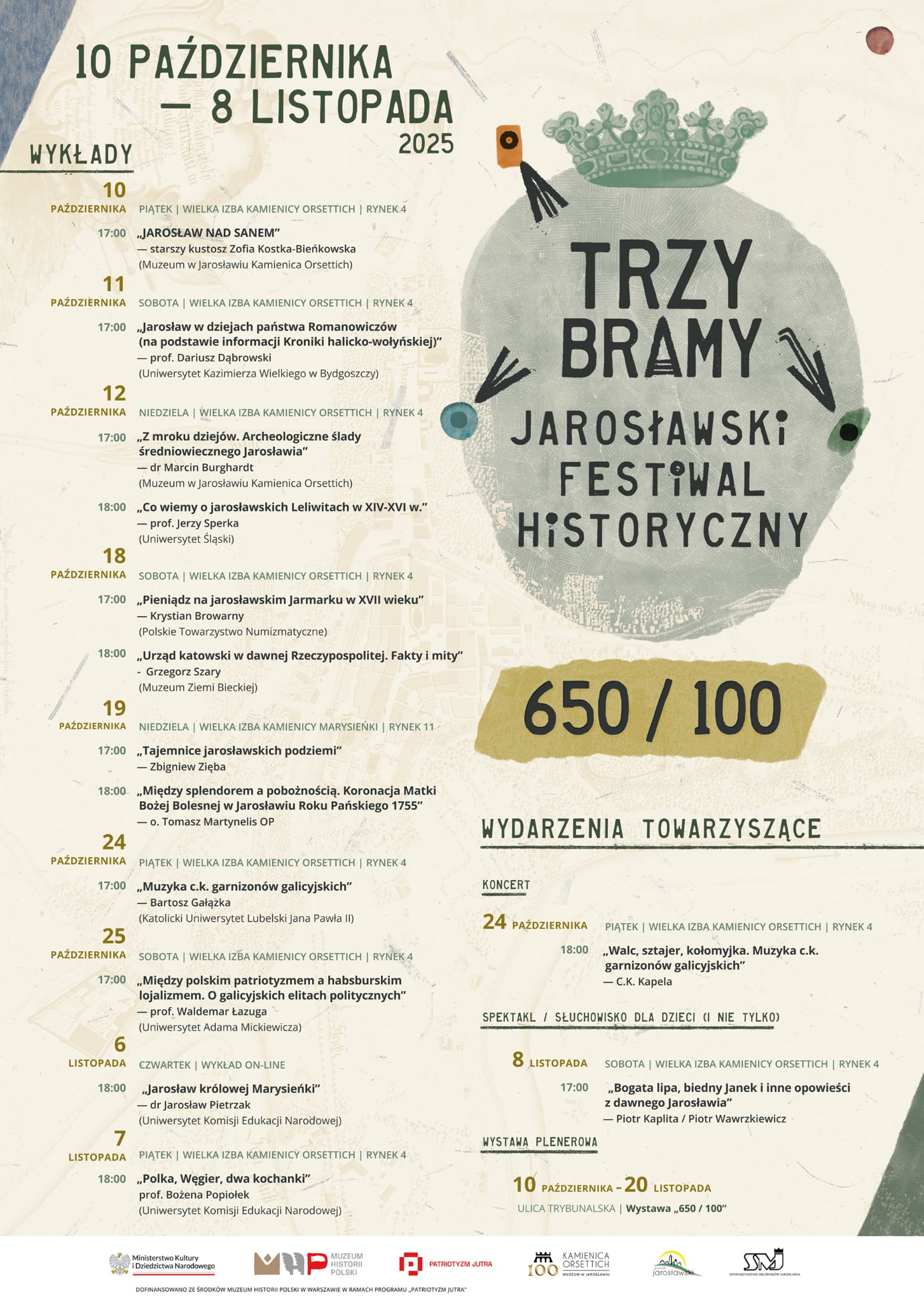 • RUSZA KOLEJNA EDYCJA JAROSŁAWSKIEGO FESTIWALU HISTORYCZNEGO TRZY BRAMY. 10 października, wykładem Zofii Kostki-Bieńkowskiej – starszej kustosz Muzeum w Jarosławiu Kamienica Orsettich – rozpocznie się czwarta edycja Jarosławskiego Festiwalu Historycznego „Trzy Bramy”. Jak mówi Konrad Sawiński, dyrektor jarosławskiego Muzeum: „Rok 2025 to rok wielkich rocznic w Polsce. Najbardziej dostojną z nich jest 1000-lecie koronacji Bolesława Chrobrego. „Swoje” rocznice świętujemy też jednak w Jarosławiu. Po pierwsze jest to 650. rocznica (ponownej) lokacji miasta na prawie magdeburskim. Dla nas w muzeum z kolei nie mniej ważna jest 100 rocznica powstania jarosławskiego muzeum”. Piotr Kaplita, kierownik działu Edukacji i Upowszechniania oraz koordynator projektu dodaje: „Pamiętając o tych ważnych dla miasta rocznicach, program tegorocznej edycji festiwalu Trzy Bramy kształtujemy nieco odmiennie od poprzednich. Nie skupiamy się na jednej, wybranej epoce z dziejów miasta. Chcemy raczej dotknąć wybranych punktów węzłowych, skupić się na zagadnieniach symbolicznych, takich, które wiążą się z najgłębszą warstwą tożsamości Jarosławia. Tematy to oczywiście nasz arbitralny wybór. Zapewne można było wybrać inne, a każdy z uczestników mógłby wybrać jeszcze inne. Liczymy tu zatem na ciekawą dyskusję”. W ramach Trzech Bram, pomiędzy 10 października a 8 listopada, odbędzie się 12 wykładów wygłoszonych przez lokalnych znawców historii, pasjonatów, ale też profesorów z różnych ośrodków uniwersyteckich w kraju. Nestorka jarosławskiej historii – Zofia Kostka-Bieńkowska opowie o roli rzeki San w dziejach miasta. W epokę średniowiecza zabiorą słuchaczy prof. Jerzy Sperka z Uniwersytetu Śląskiego, prof. Dariusz Dąbrowski z Uniwersytetu Kazimierza Wielkiego oraz dr Marcin Burghardt – archeolog z jarosławskiego Muzeum. O wybranych wątkach wiążących się ze złotym wiekiem Jarosławia w XVI i XVII wieku opowiedzą Krystian Browarny z Polskiego Towarzystwa Numizmatycznego, Zbigniew Zięba, Grzegorz Szary z Muzeum Ziemi Bieckiej i dr Jarosław Pietrzak z Uniwersytetu Komisji Edukacji Narodowej. W ciekawy wiek XVIII zabiorą nas prof. Bożena Popiołek z UKEN i o. Tomasz Martynelis OP. Natomiast o „okresie galicyjskim” posłuchamy na wykładach Bartosza Gałązki z Katolickiego Uniwersytetu Lubelskiego oraz prof. Waldemara Łazugi z Uniwersytetu Adama Mickiewicza. Jak wskazuje Piotr Kaplita, wykłady poruszać będą tematy na pierwszy rzut oka szczegółowe. Każdy z nich jednak stanowić będzie swego rodzaju soczewkę, ogniskującą szersze zagadnienie wiążące się z historią miasta. Jak co roku cyklowi wykładów towarzyszyć będą wydarzenia towarzyszące – podkreśla dyrektor Konrad Sawiński. Myślimy o nich jako o swego rodzaju bramach, przez które mamy dostęp do historii miasta inny niż poprzez klasyczny wykład. W tym roku będzie to koncert, wieczór opowieści oraz wystawa plenerowa. Szczegółowy program festiwalu znajduje się na afiszach, w folderach festiwalowych oraz na stronie internetowej Muzeum w Jarosławiu Kamienica Orsettich. Organizatorem festiwalu dofinansowano ze środków Muzeum Historii Polski w Warszawie w ramach programu „Patriotyzm Jutra”. tekst/zdjęcia Muzeum w Jarosławiu Kamienica Orsettich