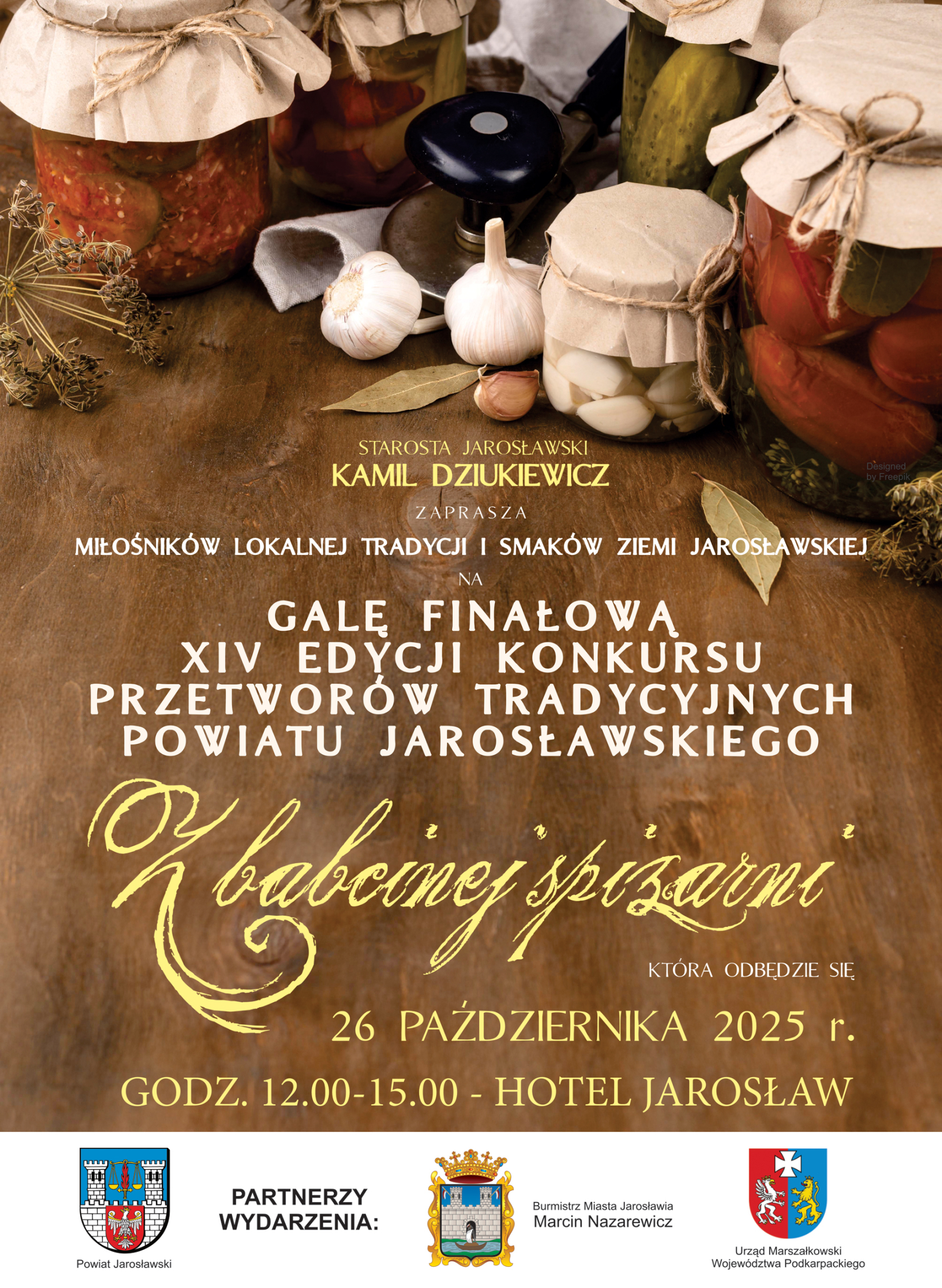 Wszystkich koneserów tradycyjnych – oczywiście podkarpackich! – wiktuałów zamkniętych w słoikach (i nie tylko) zapraszamy na Galę Finałową Konkursu „Z babcinej spiżarni”, która tym razem odbędzie się w samym sercu powiatu jarosławskiego – w jego stolicy, starym nadsańskim grodzie Jarosławiu – a dokładnie w hotelu Jarosław Weddings & Events przy ulicy Pruchnickiej 65.