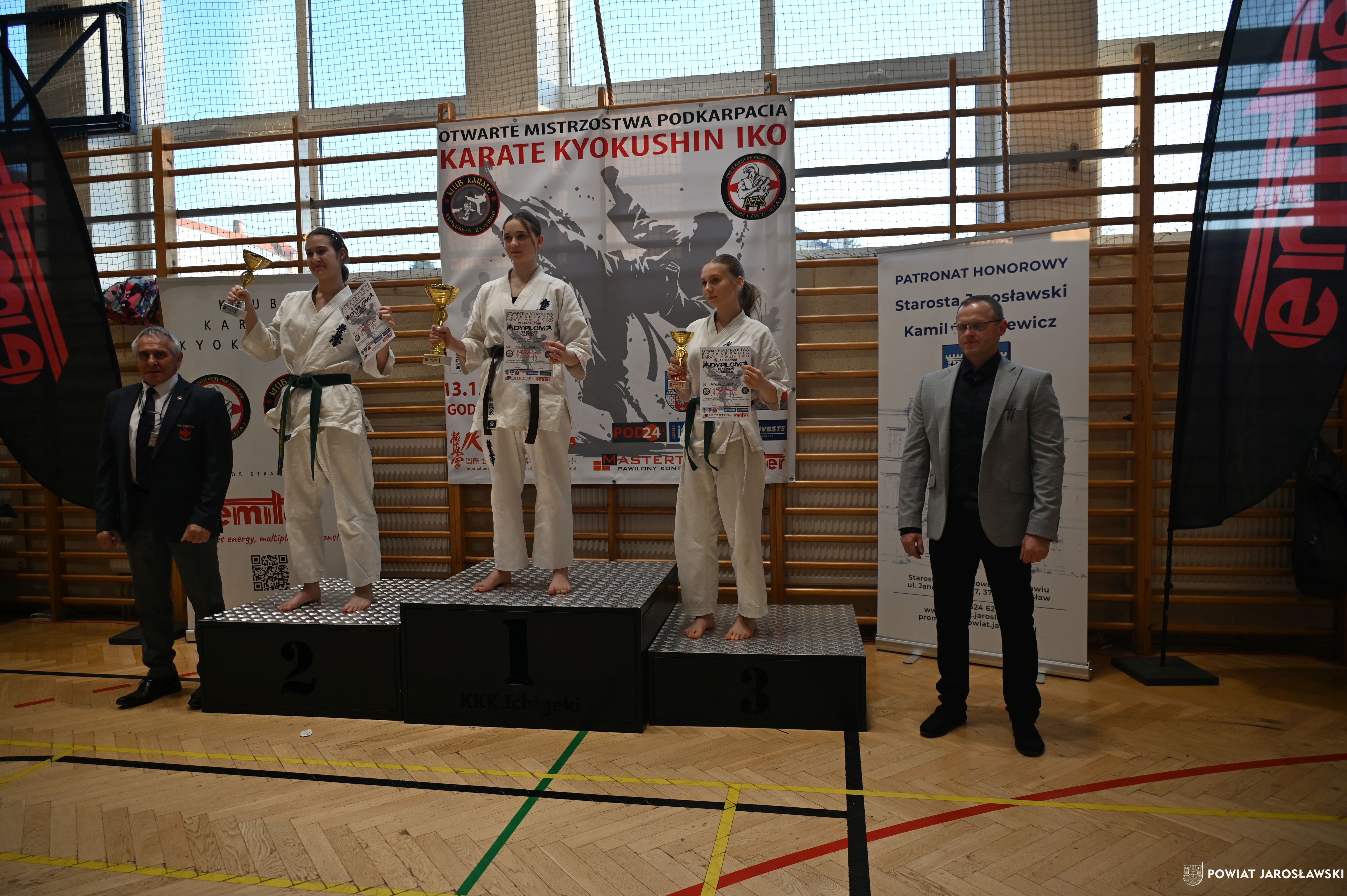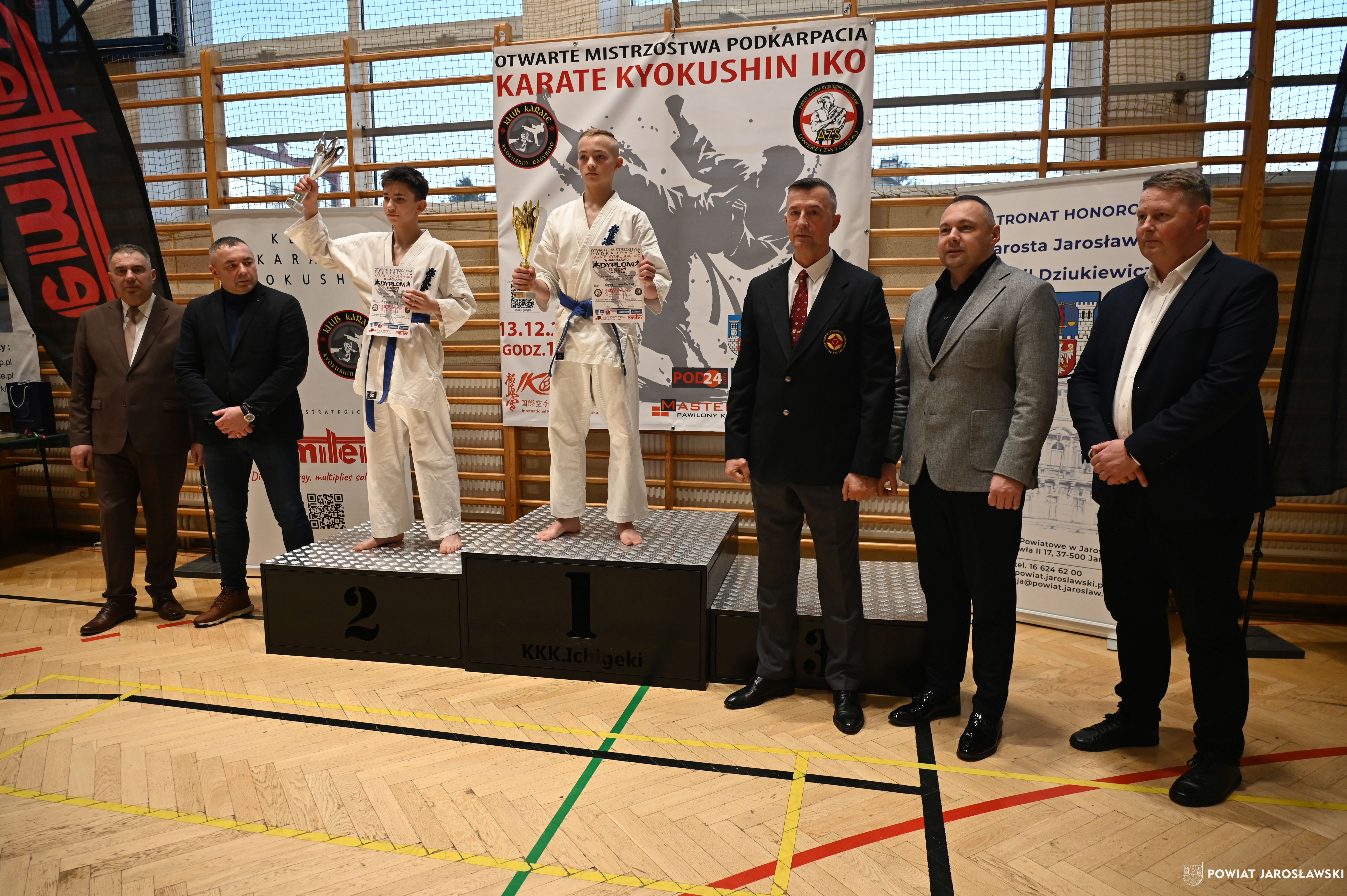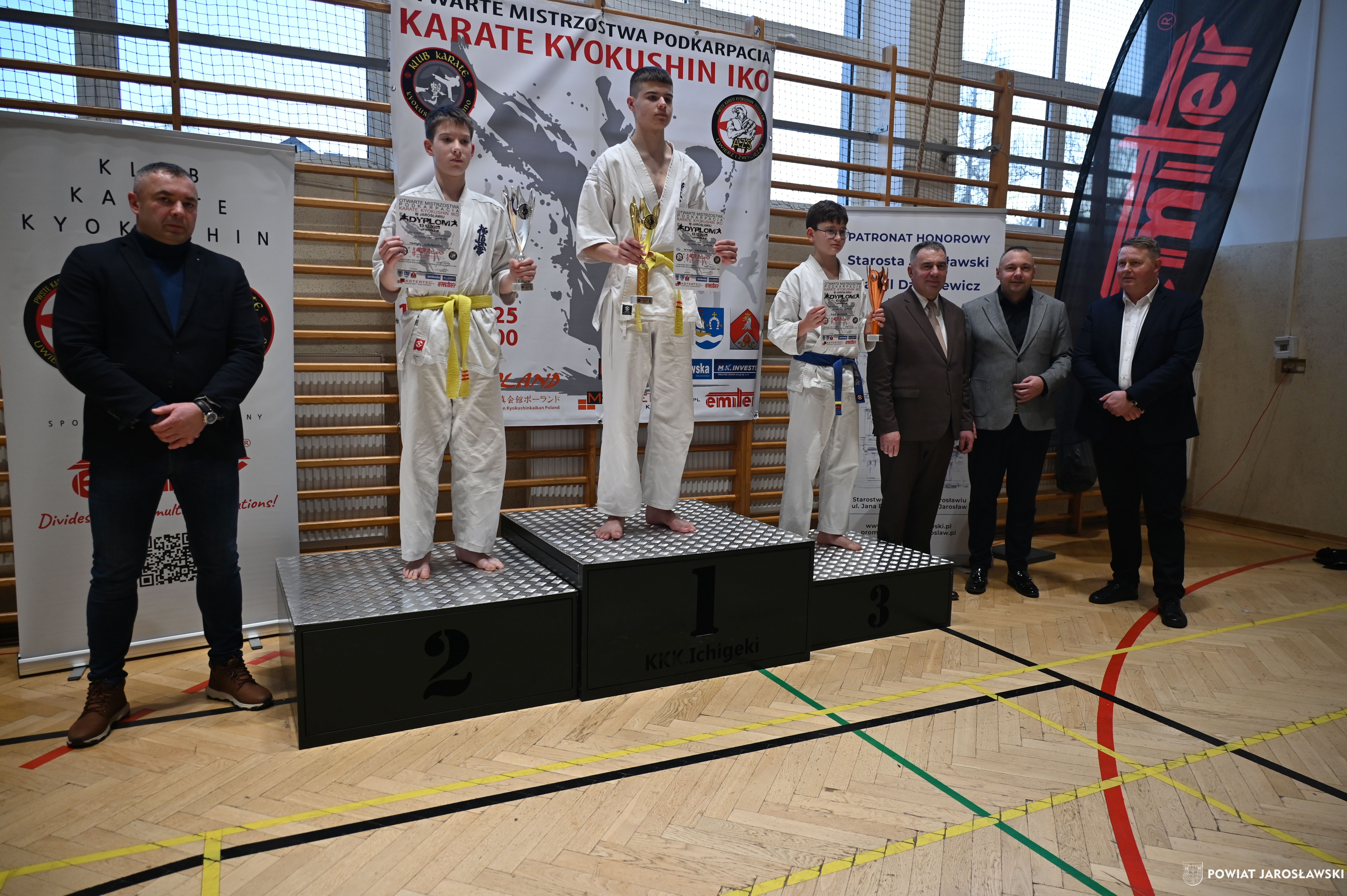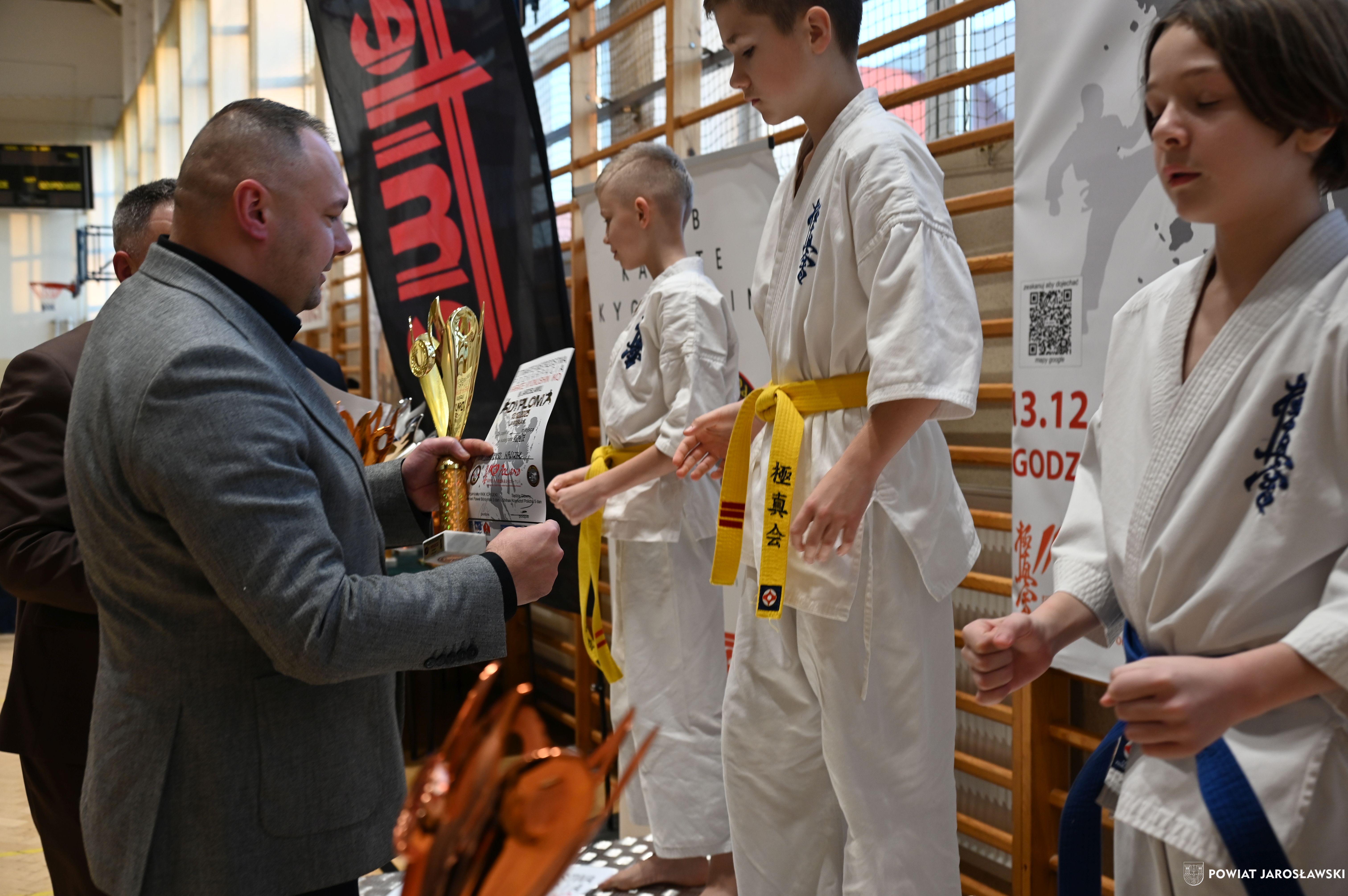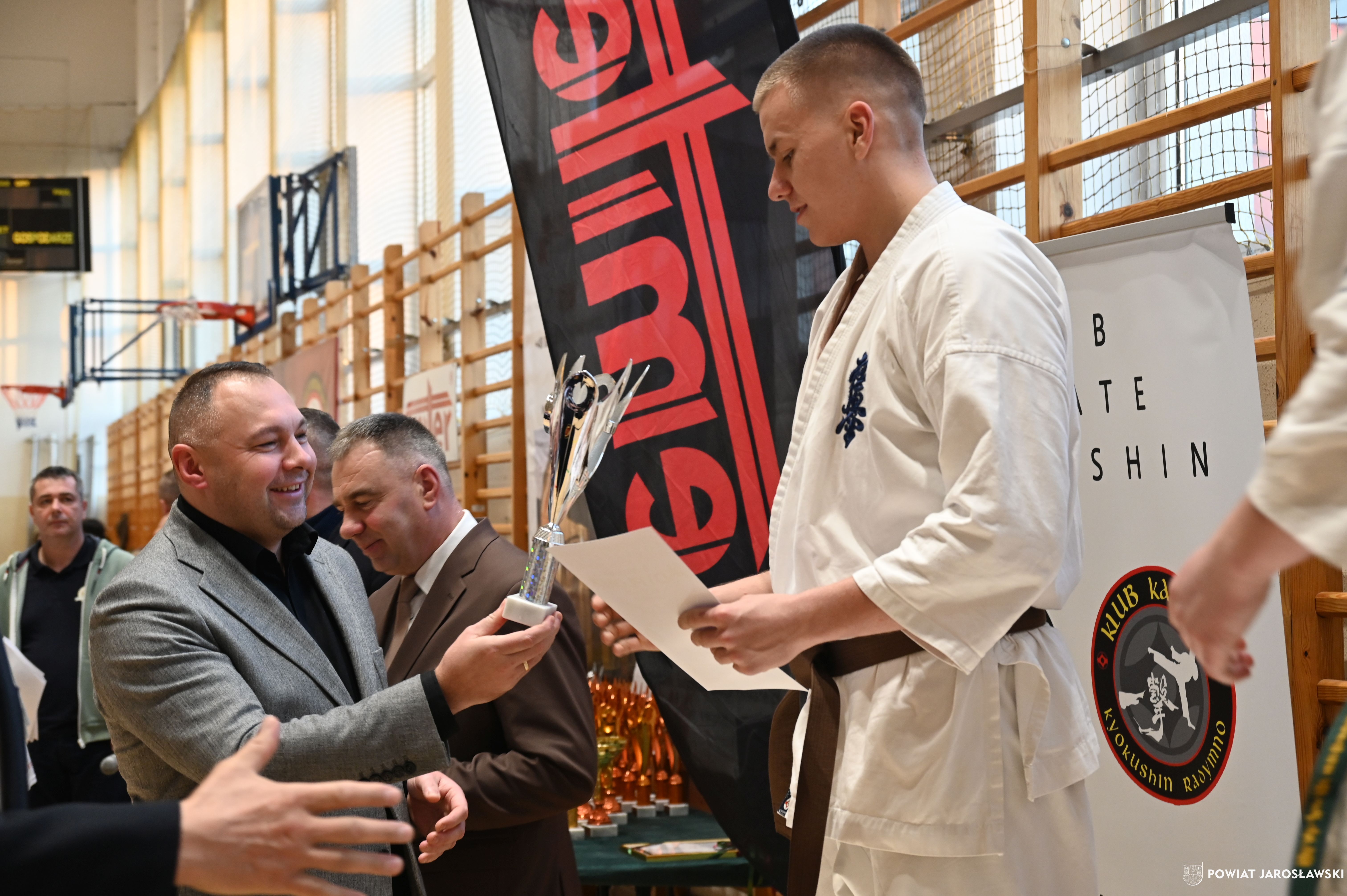 Słowa uznania i nagrody uczestnikom wręczył starosta jarosławski Kamil Dziukiewicz. Szczególne podziękowania przekazał na ręce Prezesa Klubu Karate Kyokushin "Ichigeki" Pawła Bórzyńskiego.