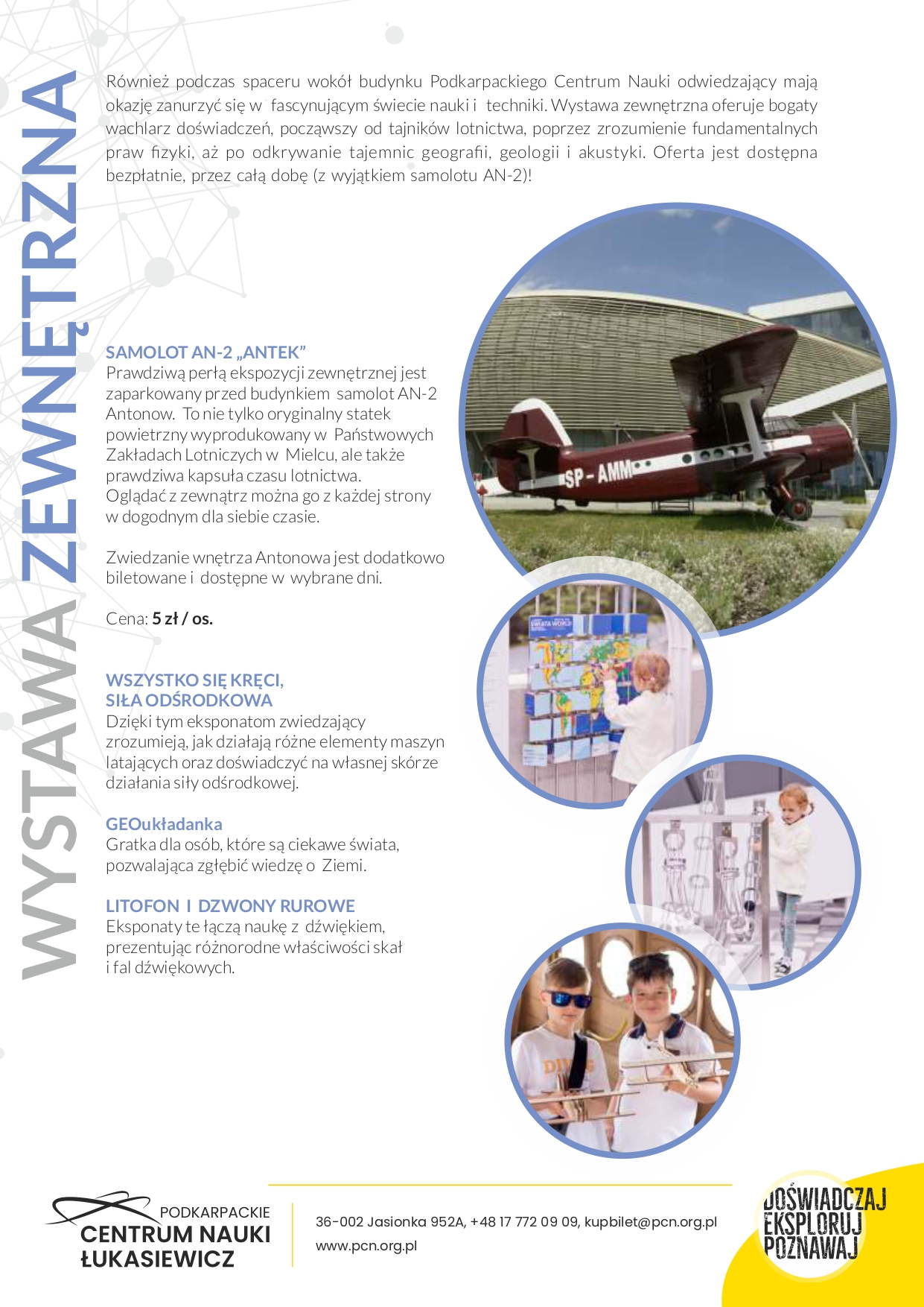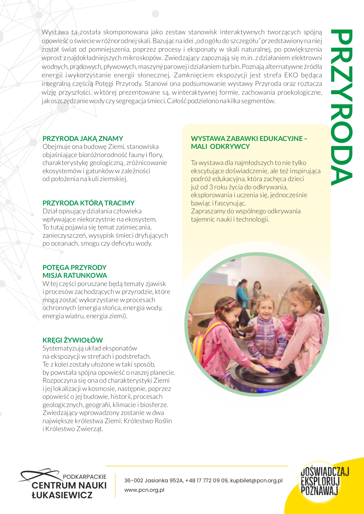 Ekspozycje oraz warsztaty oferowane przez PCN zafascynują przedszkolaków, uczniów szkół podstawowych, szkół średnich, a także dorosłych. Z naszej oferty korzystają zarówno 3-latki, jak i grupy senioralne. To przestrzeń stymulująca do zdobywania wiedzy i osobistego rozwoju w oparciu o samodzielne doświadczanie nauki, kontakt z dziedzictwem Podkarpacia oraz odkrywanie złożoności i współzależności pomiędzy światem naturalnym, człowiekiem w nim żyjącym, jak i osiągnięciami naszej cywilizacji.