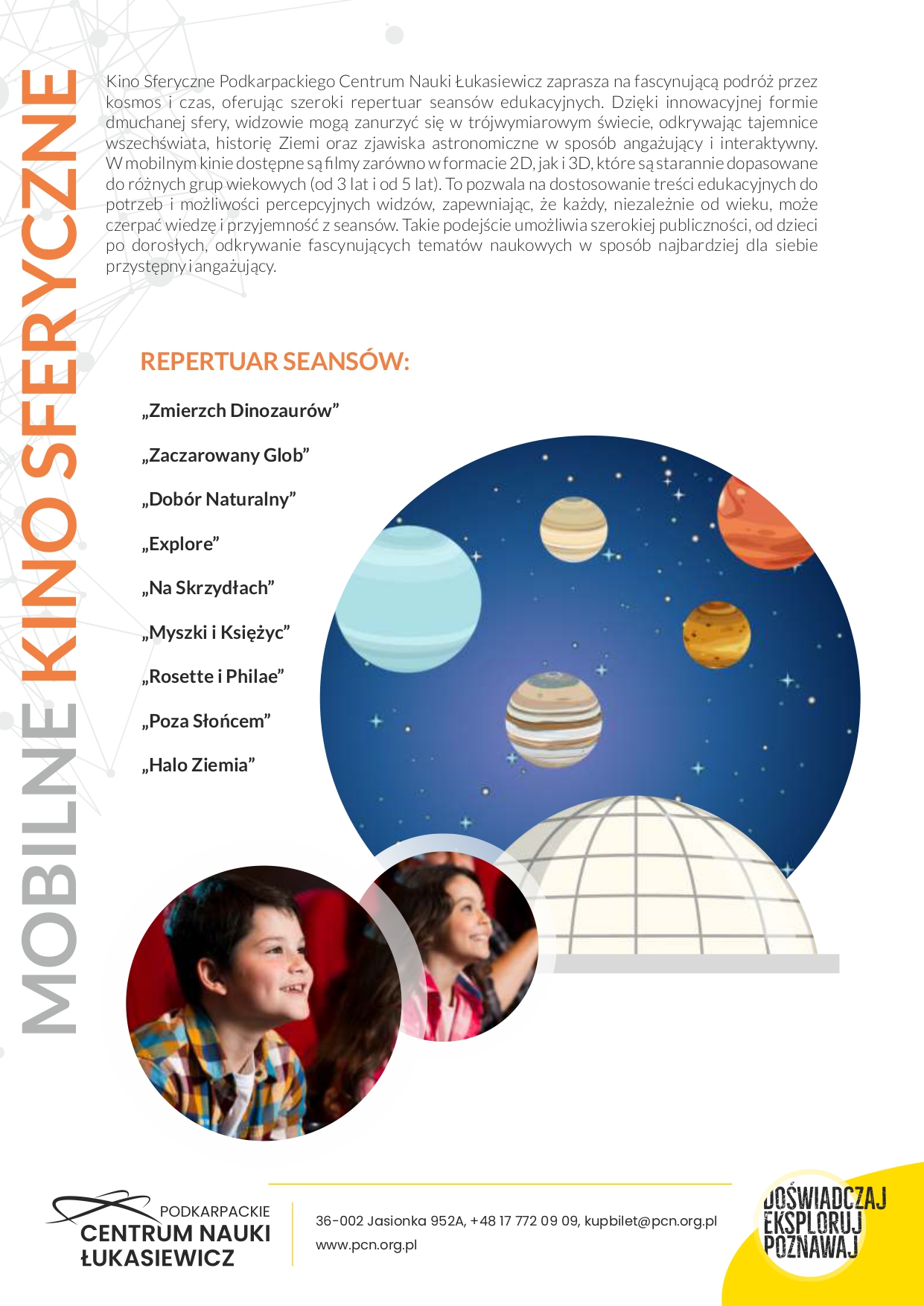 Jeśli reprezentujesz samorząd, szkołę, placówkę edukacji lub kultury, prowadzisz stowarzyszenie czy fundację, możesz zaprosić nas do siebie, gdzie doświadczeni animatorzy poprowadzą prezentacje z wykorzystaniem naszego mobilnego Planetarium lub Mobilnej Wystawy. W tym celu napisz na adres Ten adres pocztowy jest chroniony przed spamowaniem. Aby go zobaczyć, konieczne jest włączenie w przeglądarce obsługi JavaScript. lub Ten adres pocztowy jest chroniony przed spamowaniem. Aby go zobaczyć, konieczne jest włączenie w przeglądarce obsługi JavaScript. z opisem, gdzie i kiedy chcesz nas zaprosić, ile osób może wziąć w wydarzeniu, czy wydarzenie, które organizujesz jest bezpłatne dla jego uczestników.