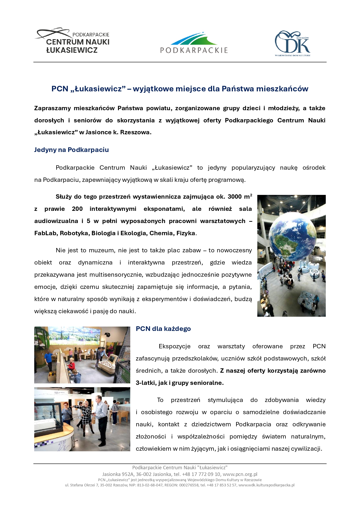 W imieniu Podkarpackiego Centrum Nauki "Łukasiewicz" zapraszamy mieszkańców powiatu, zorganizowane grupy dzieci i młodzieży, a także dorosłych i seniorów do skorzystania z wyjątkowej oferty Podkarpackiego Centrum Nauki "Łukasiewicz" w Jasionce k. Rzeszowa.