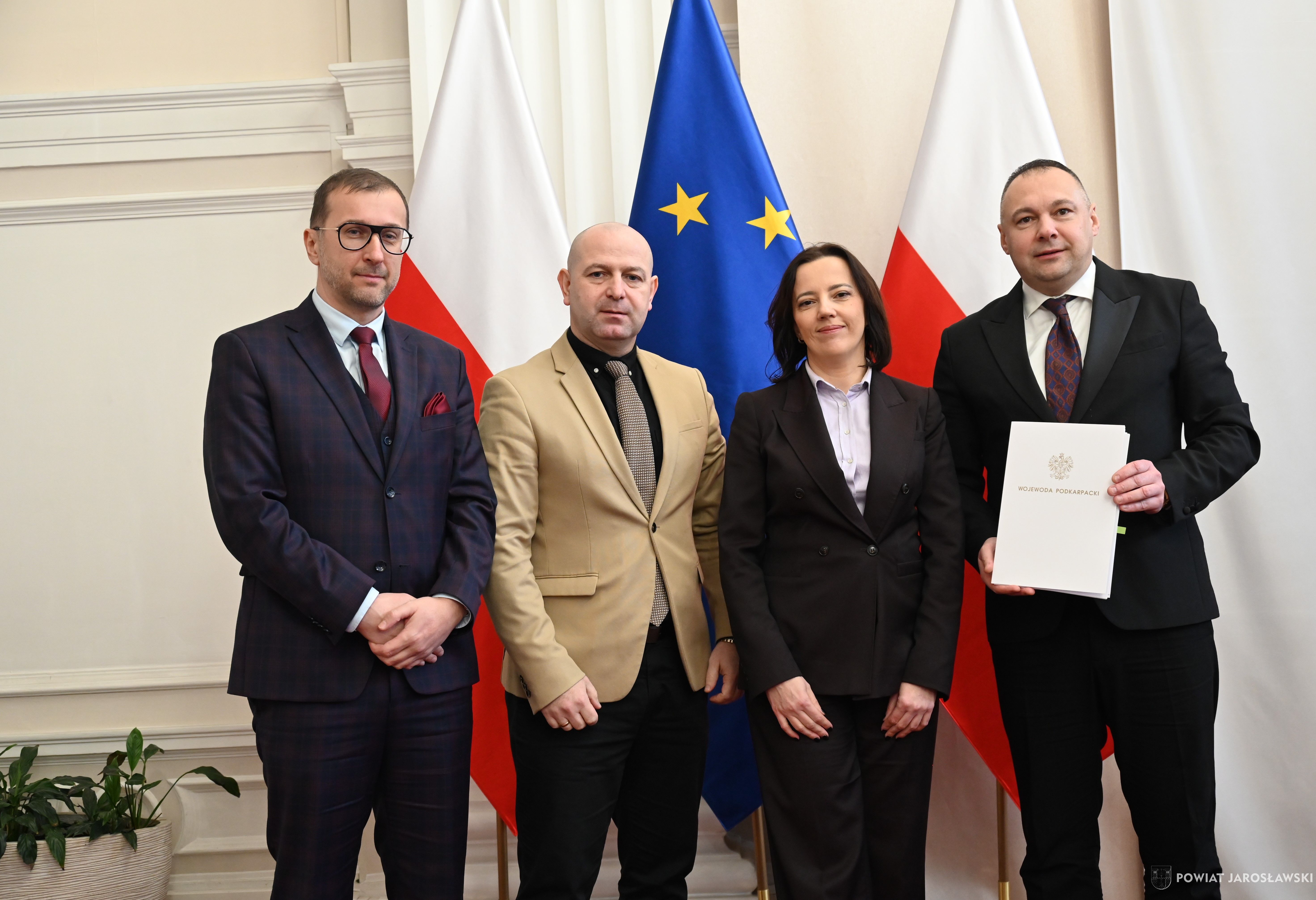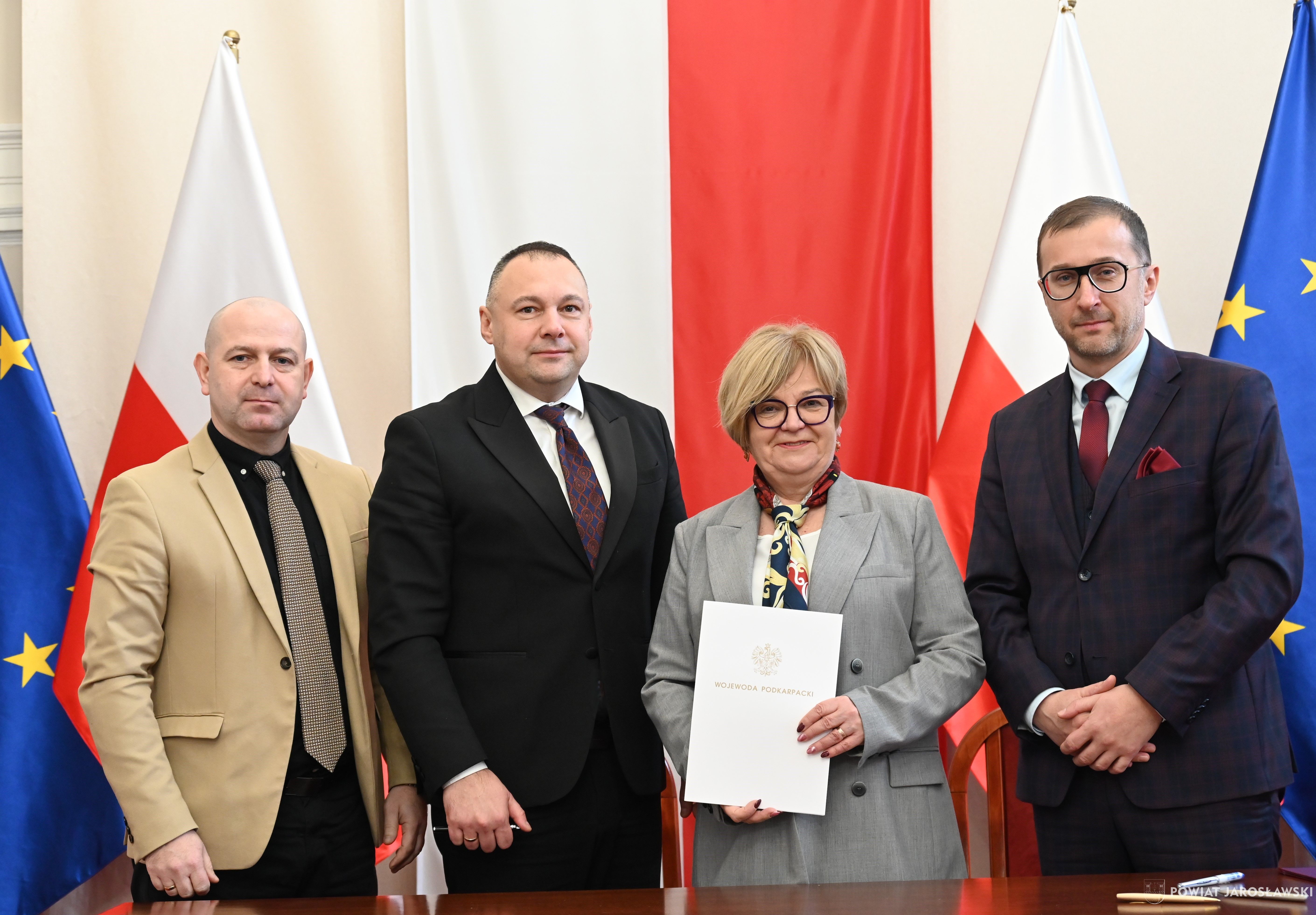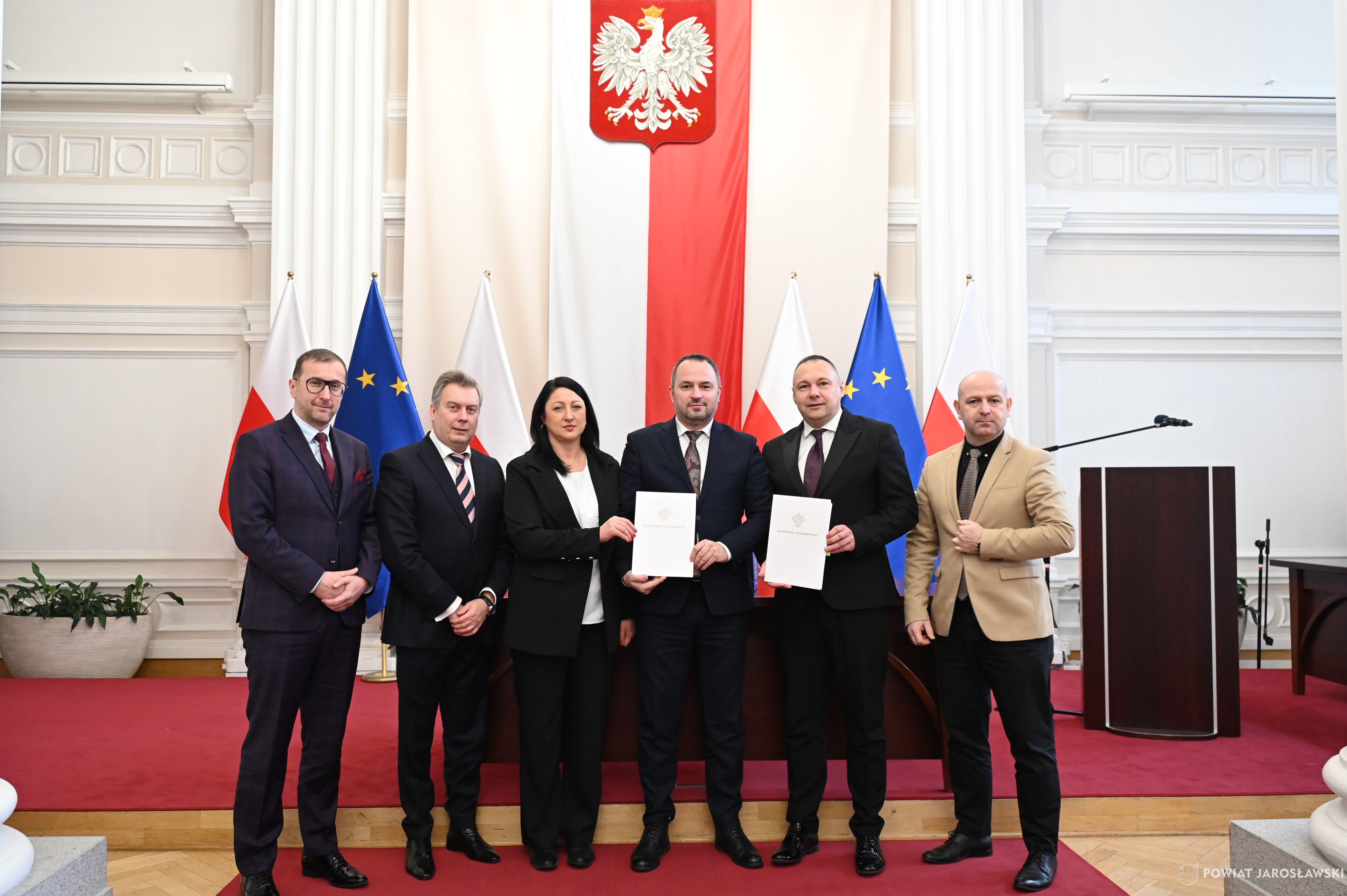Wczesnym przedpołudniem, 22 stycznia br., w sali kolumnowej Podkarpackiego Urzędu Wojewódzkiego, starosta jarosławski Kamil Dziukiewicz, a zarazem przewodniczący zarządu związku wspólnie z wicestarostą Krzysztofem Cebulakiem (wiceprzewodniczącym zarządu), w towarzystwie prezesa PKS Jarosław S.A. Tomasza Deca, podpisali z wojewodą podkarpackim Teresą Kubas-Hul umowę na dofinasowanie realizacji przewozów autobusowych o charakterze użyteczności publicznej.