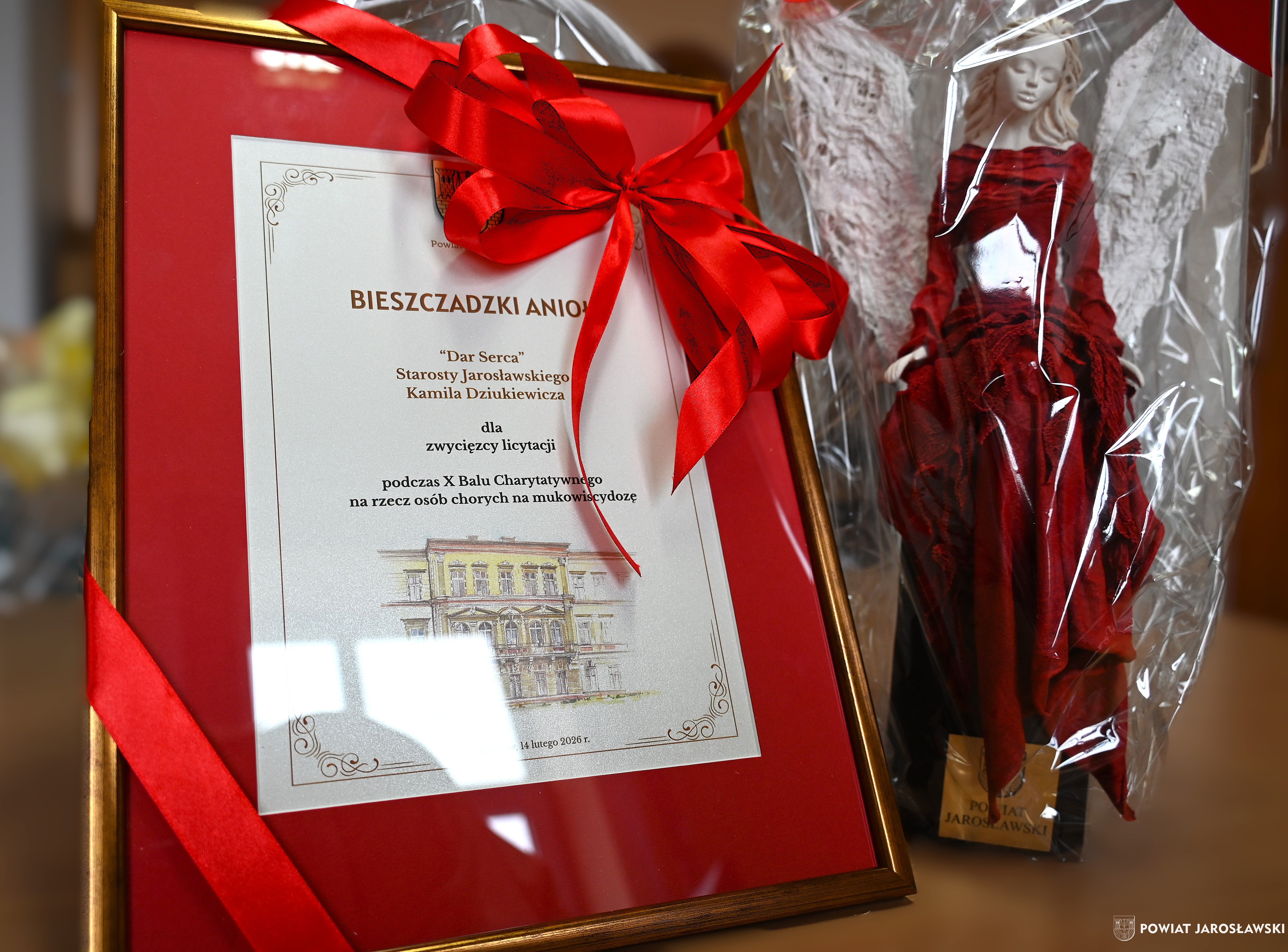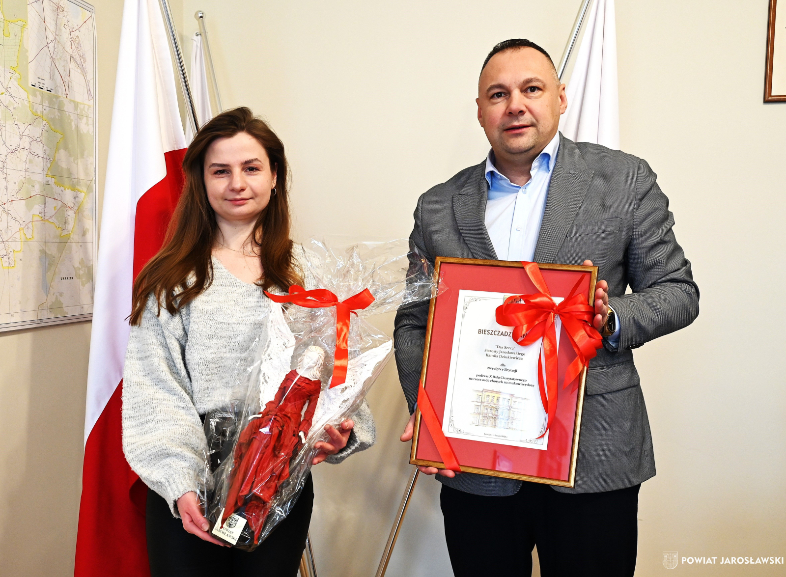 4 lutego br., Kamil Dziukiewicz Starosta Powiatu Jarosławskiego spotkał się z reprezentantką fundacji Pomocy Chorym na Mukowiscydozę Mukohelp Karoliną Berezą i przekazał niezwykły „dar serca” - Bieszczadzkiego Anioła – który zostanie wystawiony na licytację podczas X Balu Charytatywnego na rzecz podopiecznych fundacji.