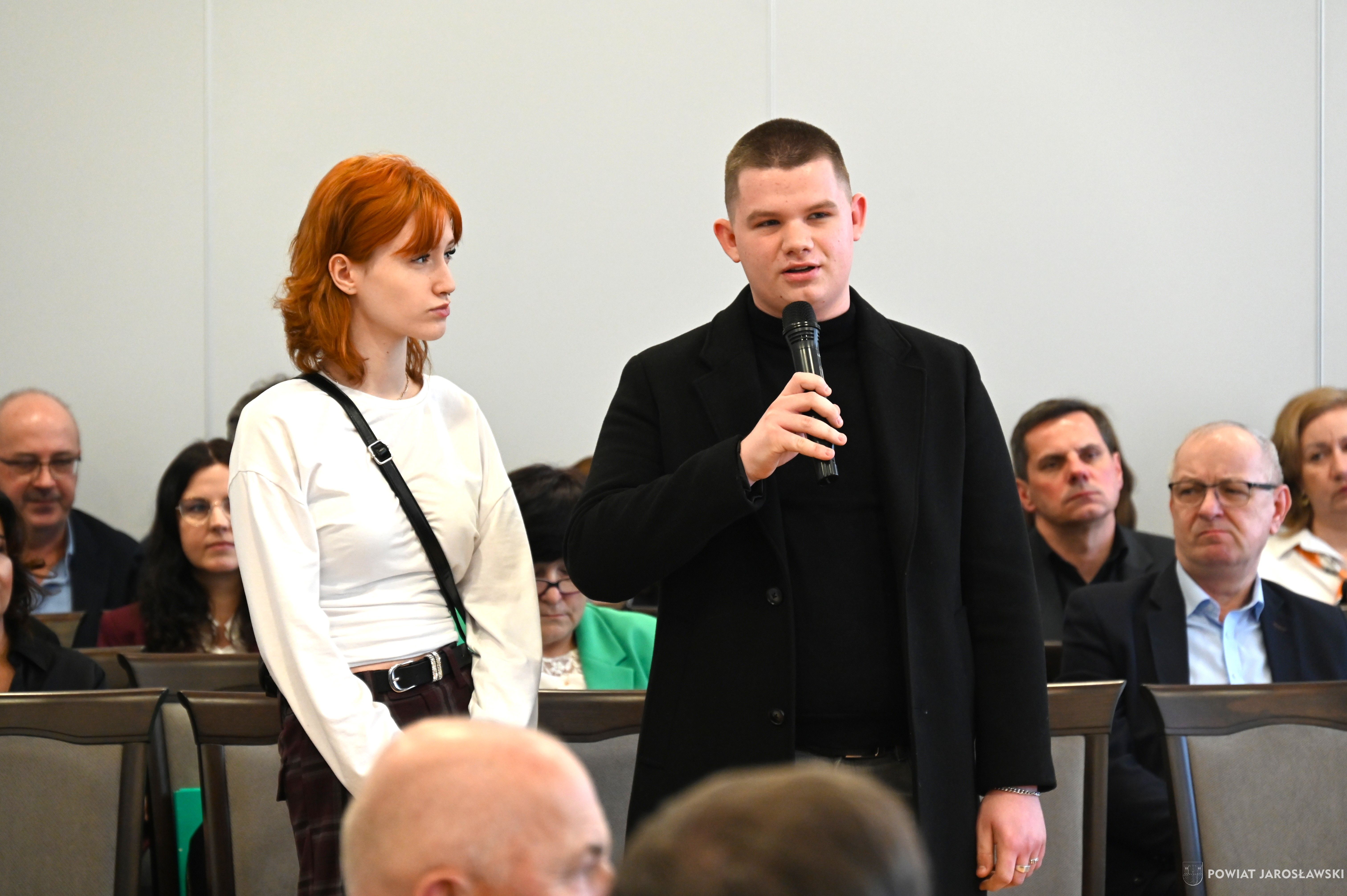 Sesja rozpoczęła się od miłego akcentu jakim była wizyta reprezentantów „Forum Liderów Młodzieży Powiatu Jarosławskiego”. Podziękowali oni za możliwość udziału w tym wyjątkowym dla nich wydarzeniu w czasie, którego mogli wymieniać się doświadczeniami, spostrzeżeniami na temat postaw obywatelskich i samorządności. Starosta jarosławski Kamil Dziukiewicz zaakcentował, iż powiat jarosławski jest otwarty na młodzieżowe inicjatywy i wyraził dalszą chęć współpracy. Przewodnicząca Rady Grażyna Strzelec wraz z Wiceprzewodniczącym Rady Tomaszem Kuleszą również wyrazili słowa uznania dla młodych, którzy z ogromnym zaangażowaniem włączyli się w organizację.