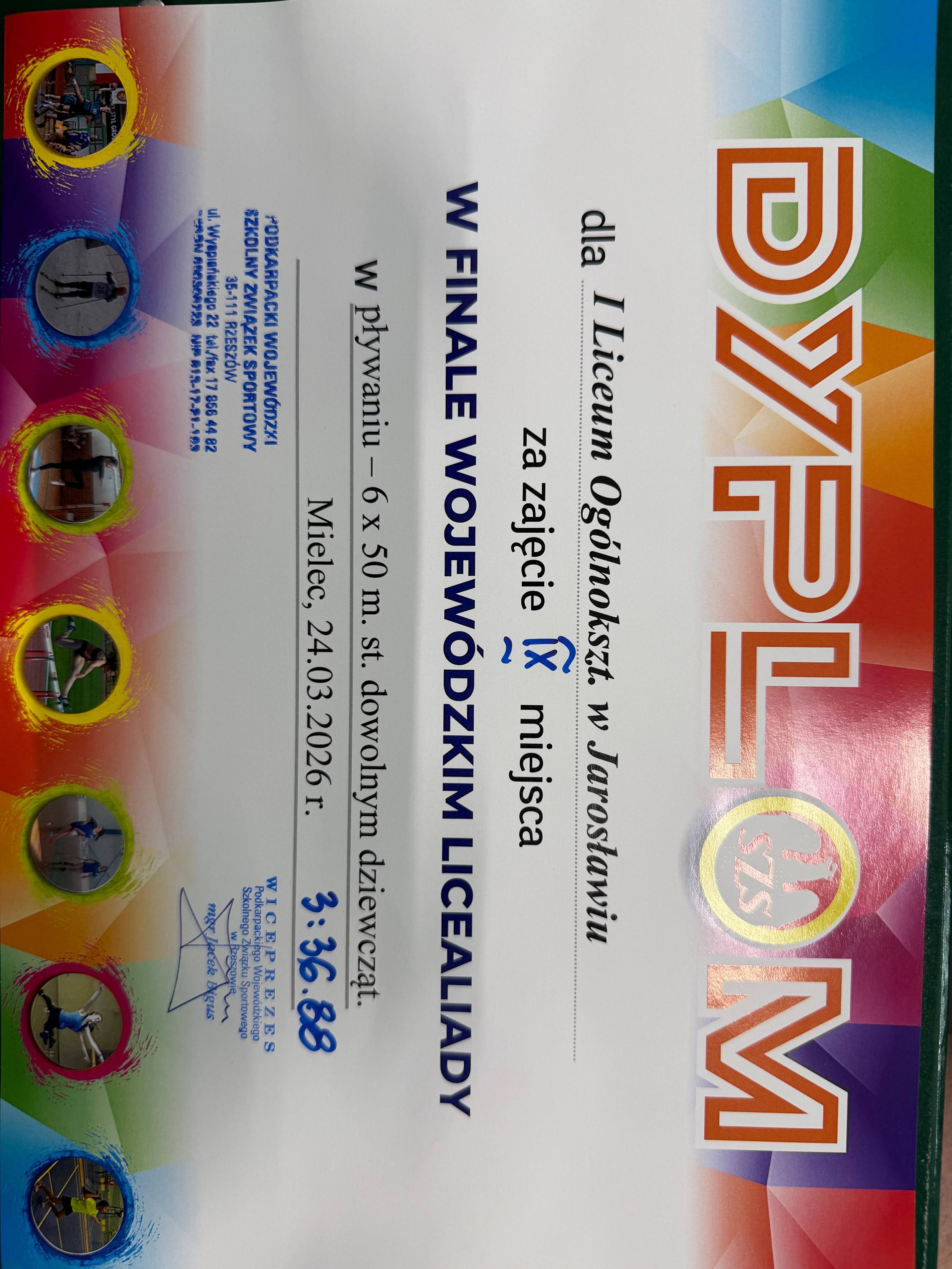 24 marca 2026 r., na basenie w Mielcu odbył się Finał Wojewódzki licealiady w pływaniu. I Liceum Ogólnokształcące im. Mikołaja Kopernika w Jarosławiu reprezentowane było przez sztafetę żeńską 6×50 m oraz występy indywidualne. Sztafeta dziewcząt zaprezentowała się bardzo dobrze, z czasem 3;36,88 zajęła IX miejsce w województwie.