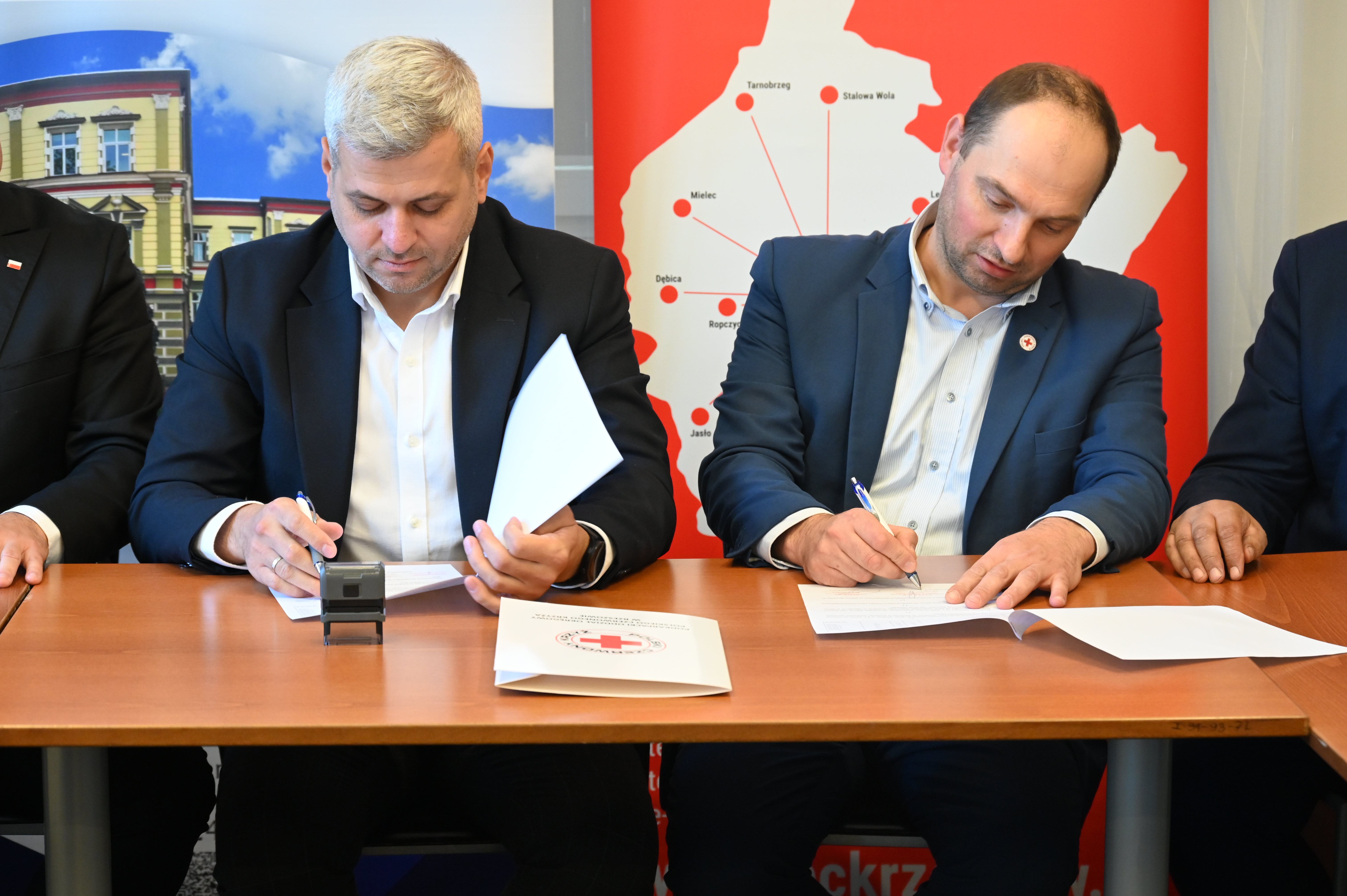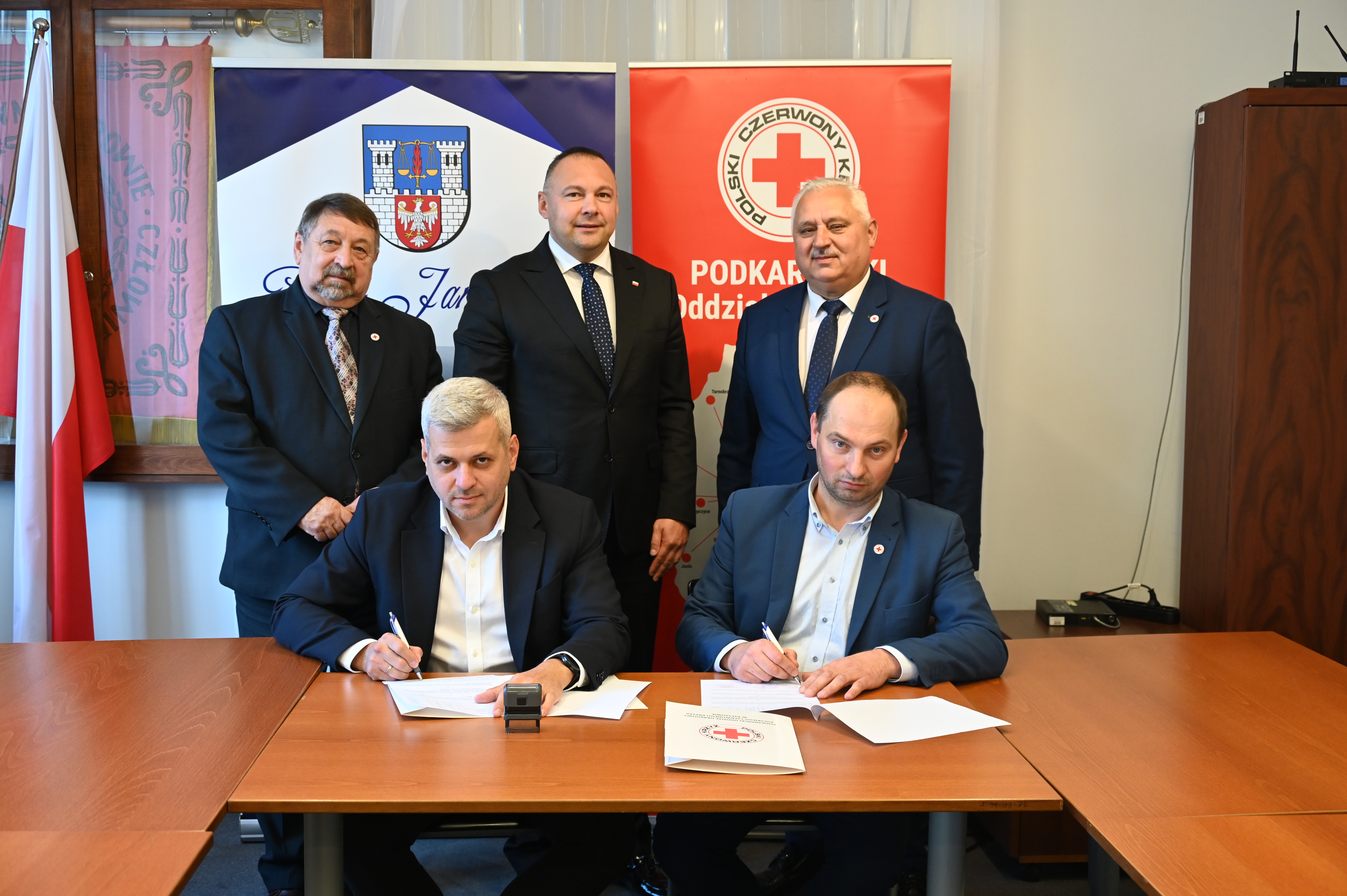 W przekazaniu udział wziąli starosta jarosławski Kamil Dziukiewicz, dyrektor COM Jarosław Piotr Pochopień, dyrektor Podkarpackiego Oddziału PCK Sławomir Stefański, prezes Zarządu Oddziału Rejonowego PCK w Jarosławiu Jan Potoniec oraz prezes Zarządu Podkarpackiego Oddziału Okręgowego PCK Antoni Olak.