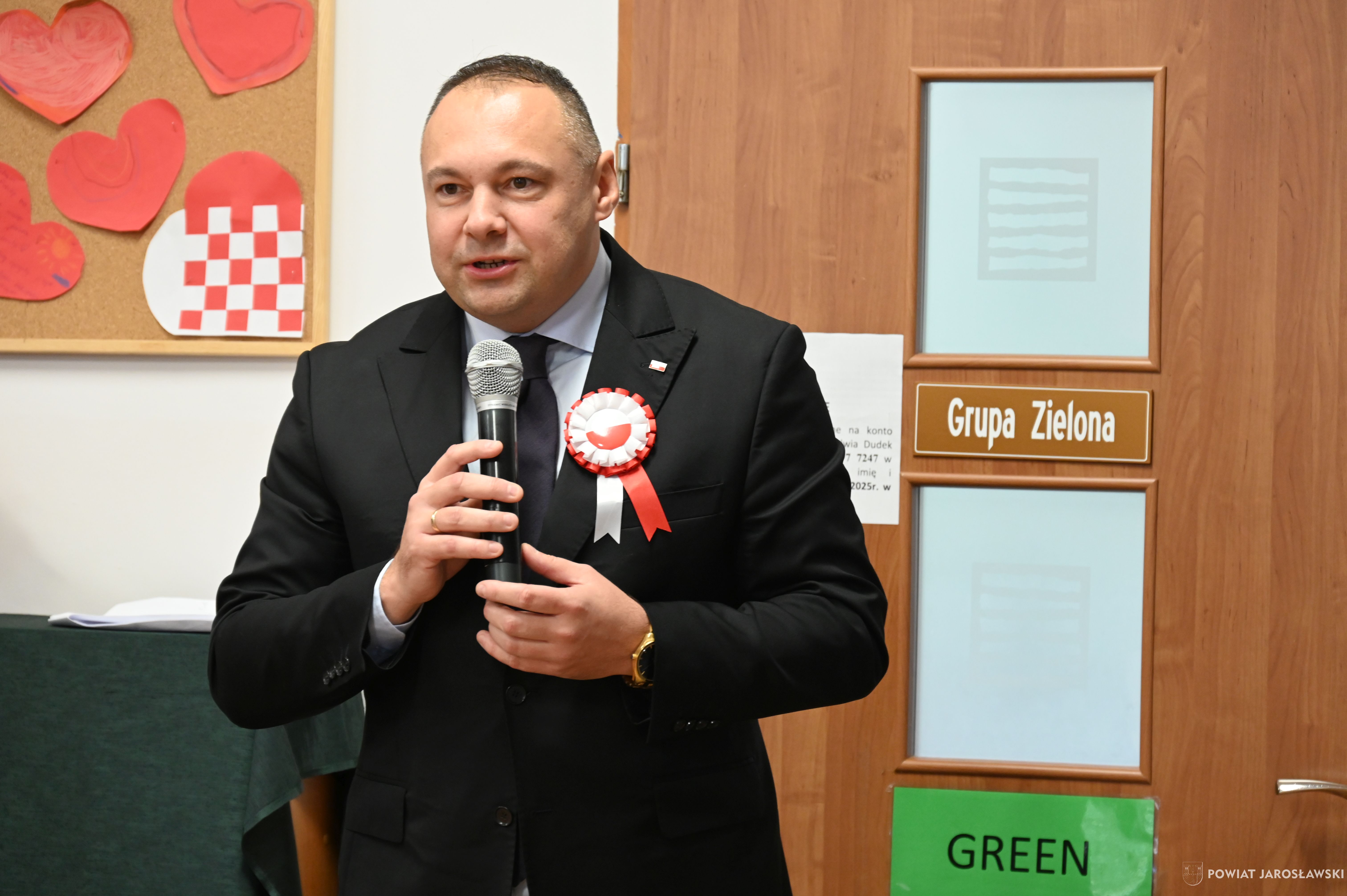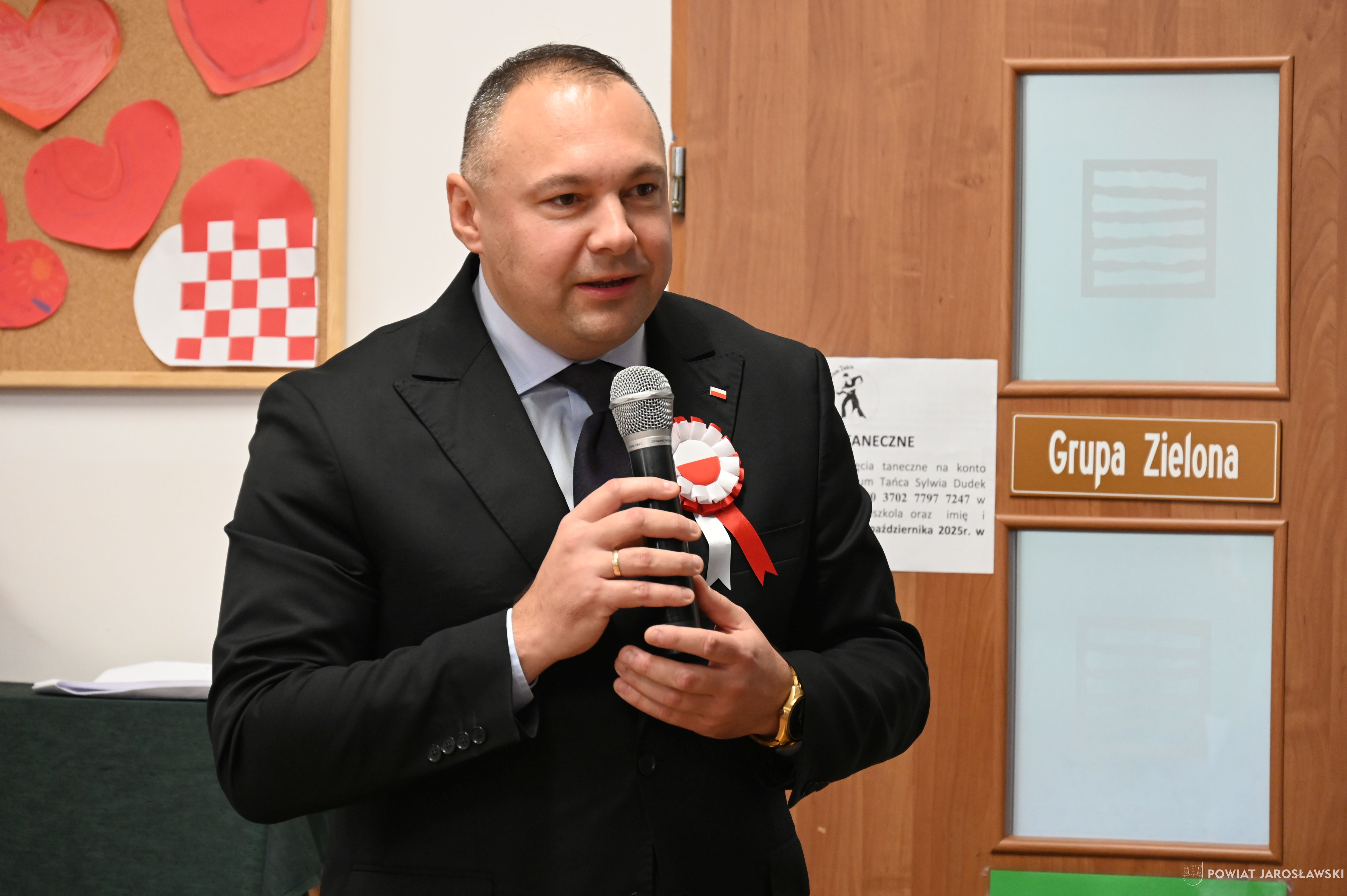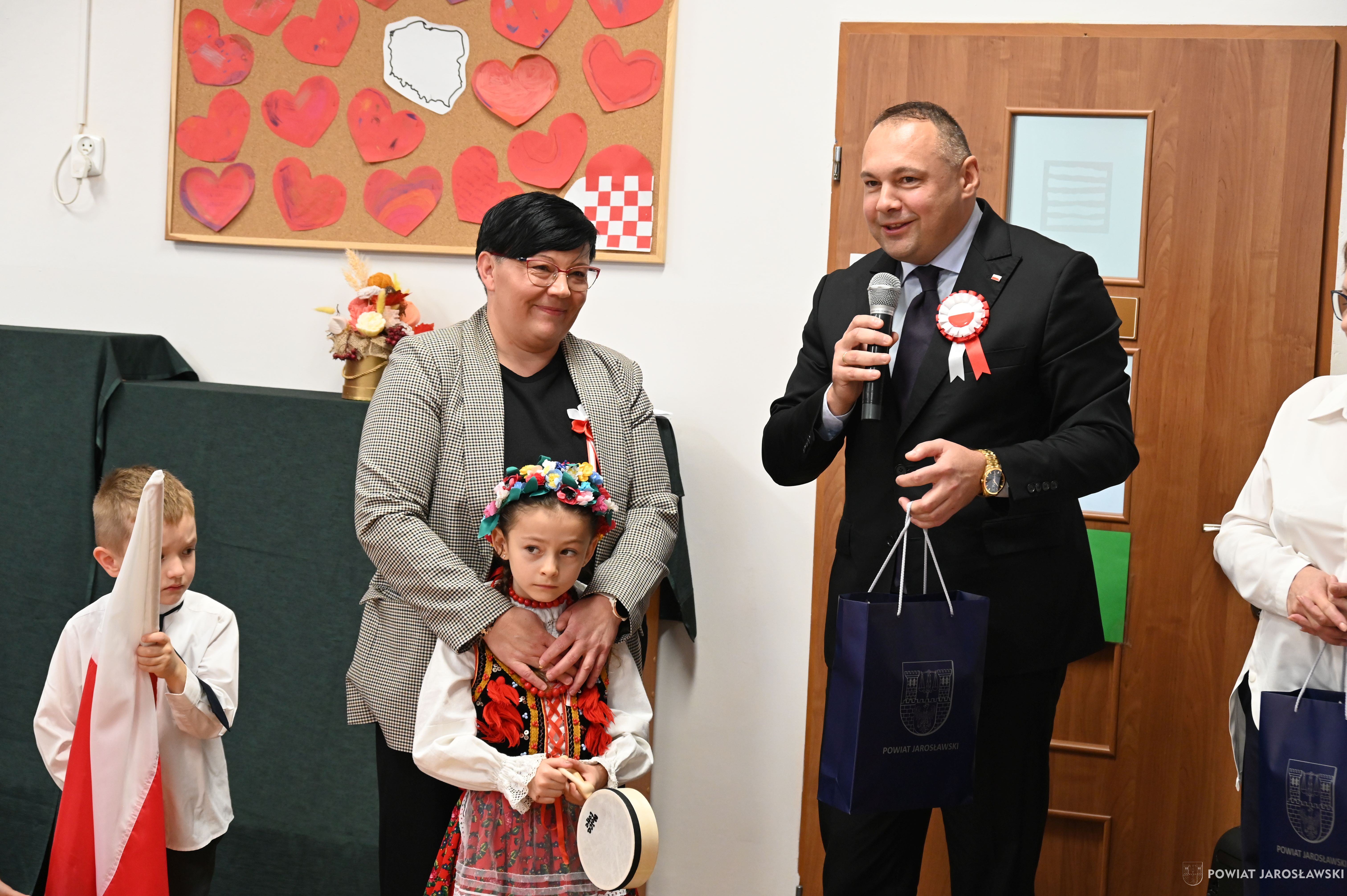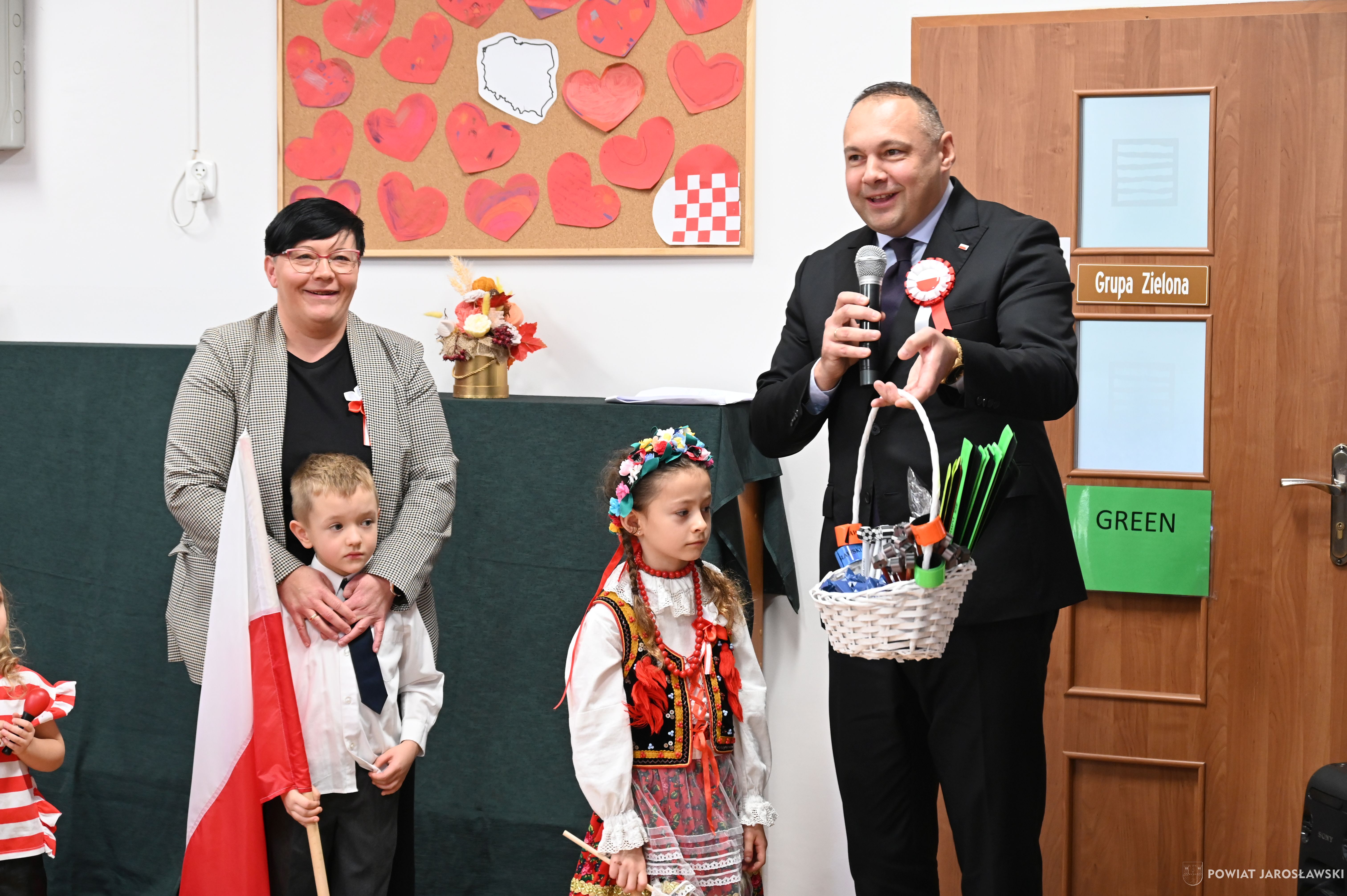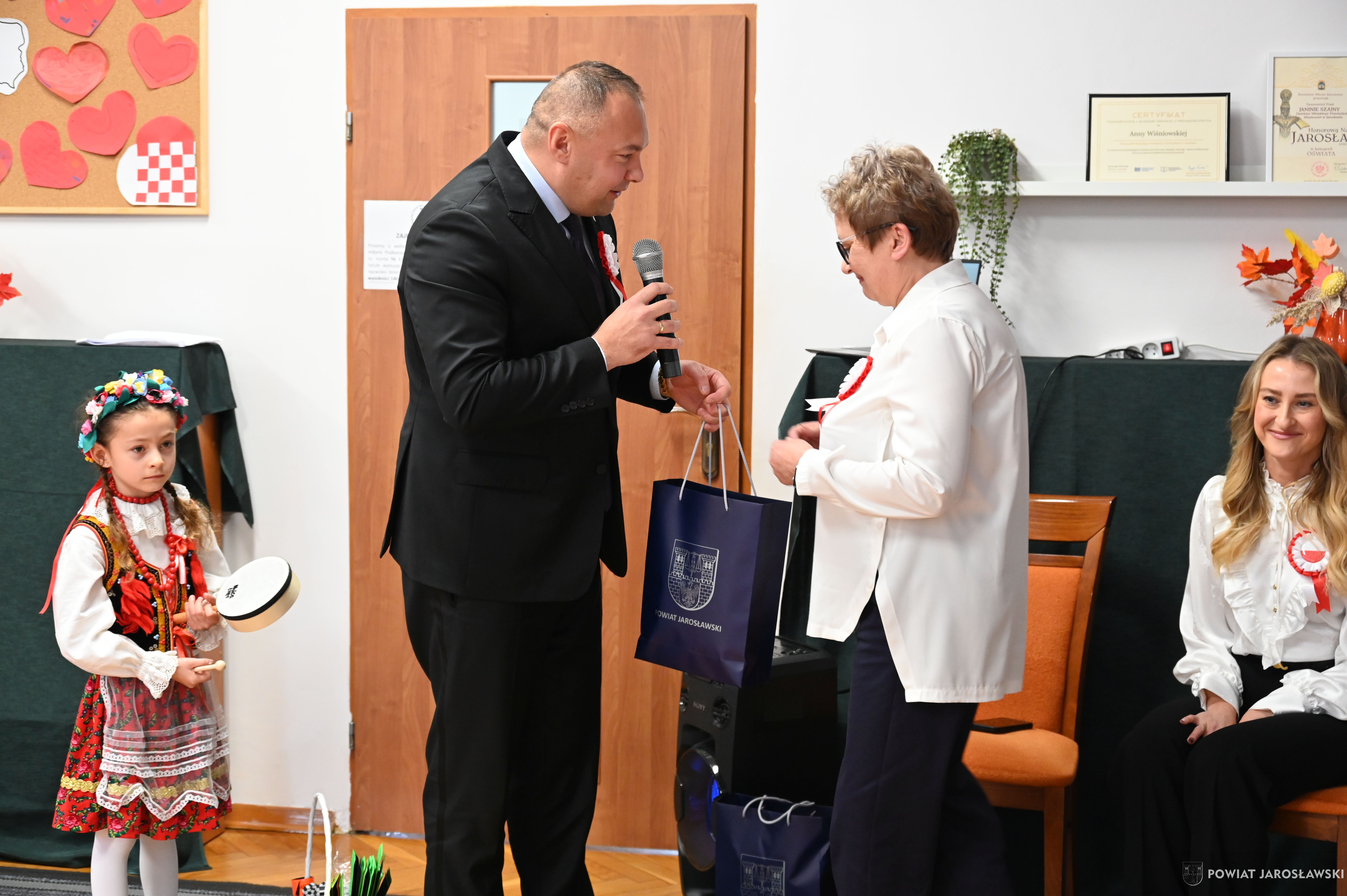 Włodarz powiatu Kamil Dziukiewicz podziękował dzieciom i nauczycielom za wspaniale przygotowaną uroczystość. Na ręce Pani Dyrektor Janiny Szajny złożył słodki upominek dla naszych przedszkolaków i serdeczne gratulacje.
