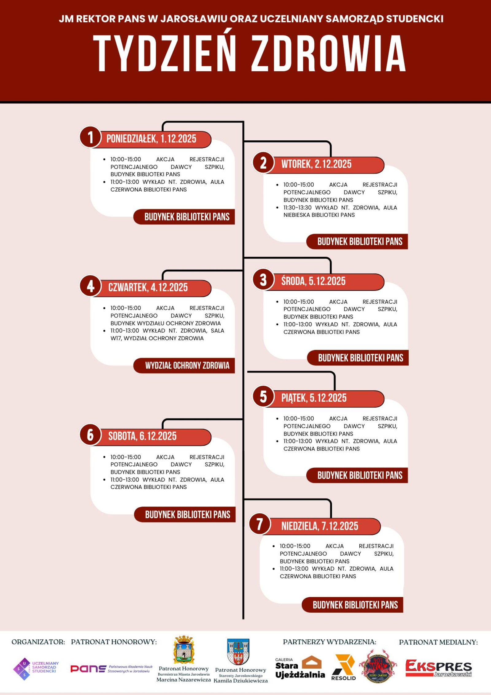 W imieniu Uczelnianego Samorządu Studenckiego PANS w Jarosławiu zapraszamy serdecznie na wyjątkowe wydarzenie – TYDZIEŃ ZDROWIA, który odbędzie się w dniach od 1 do 7 grudnia 2025 roku!