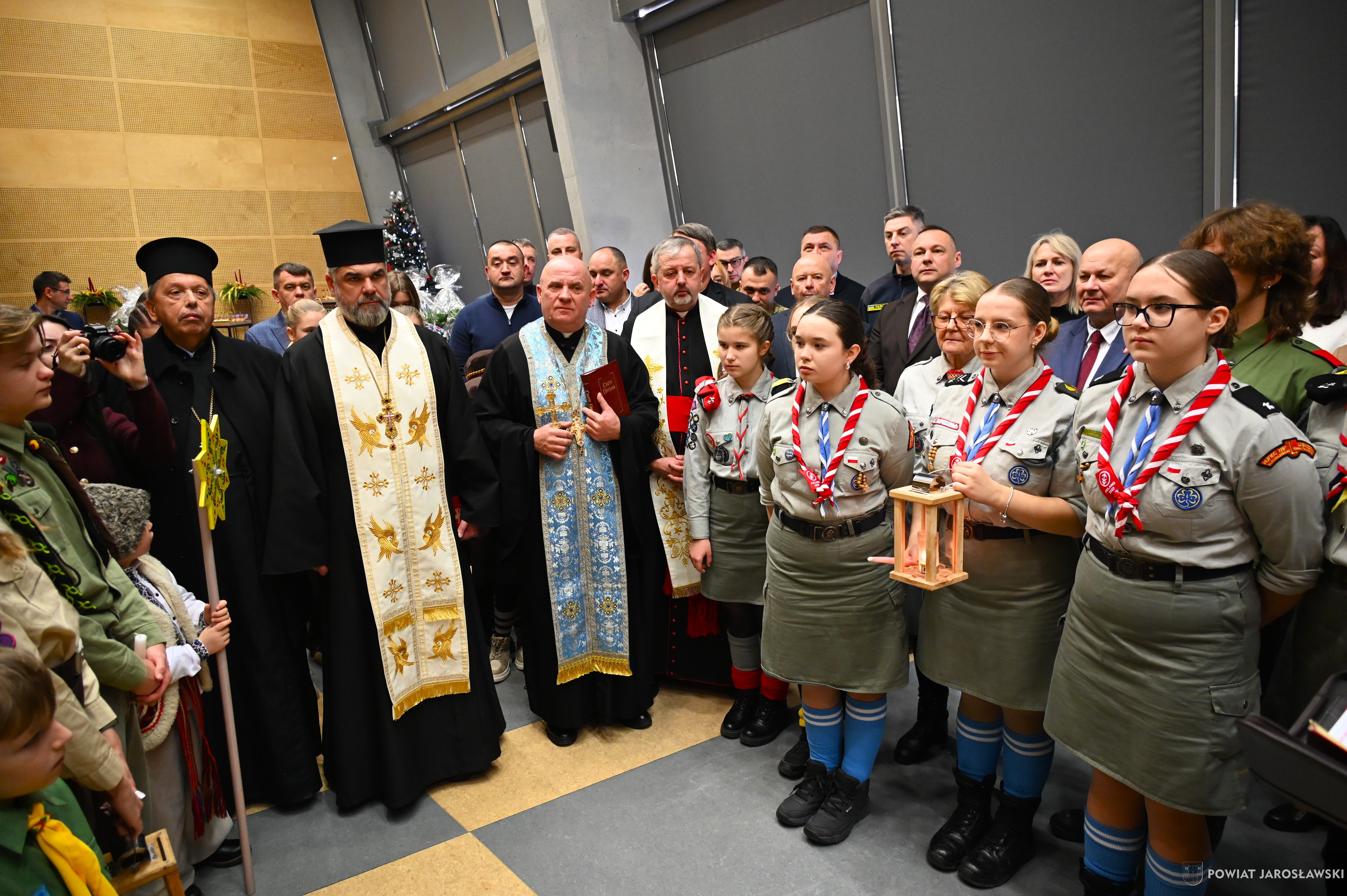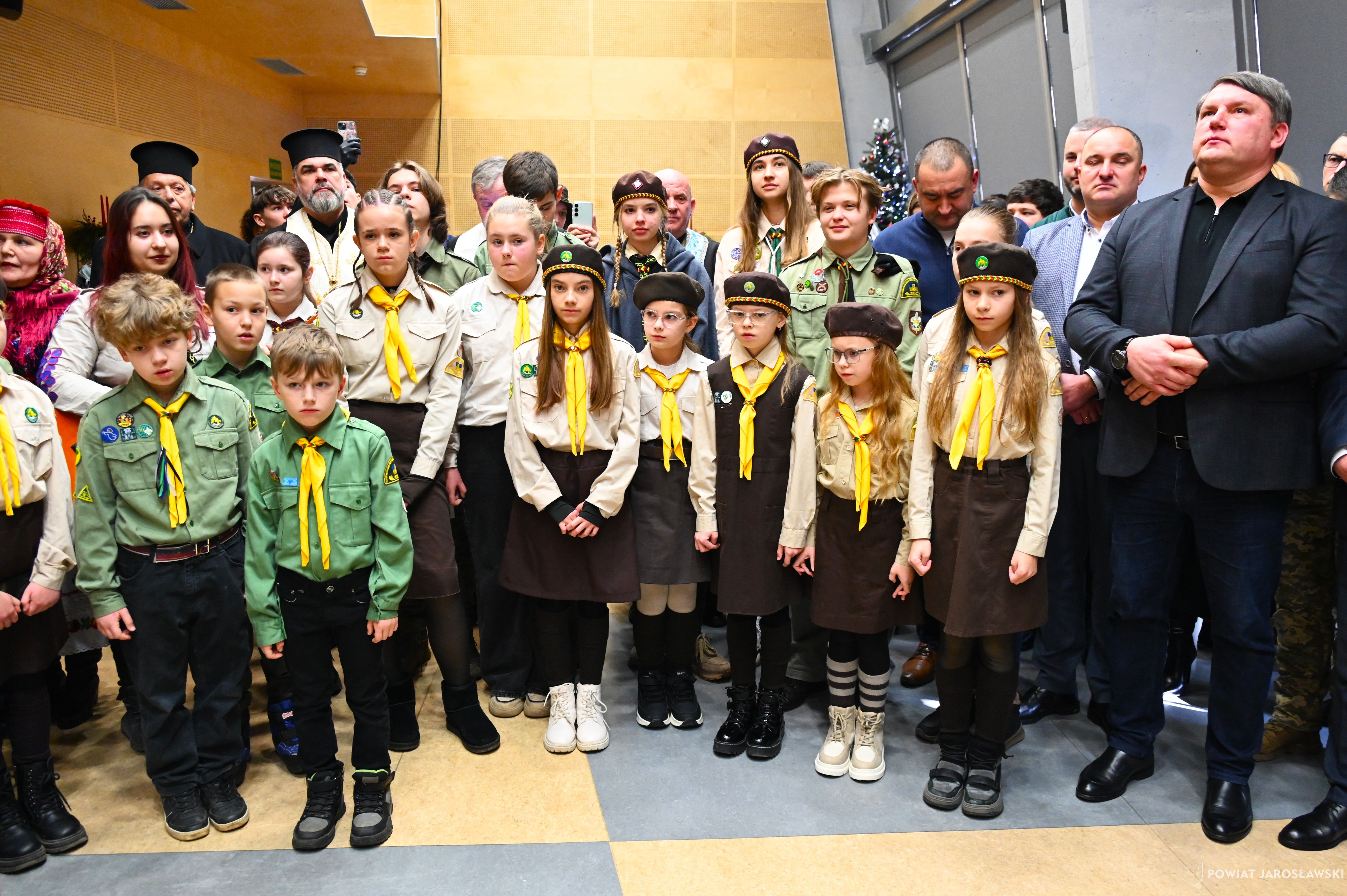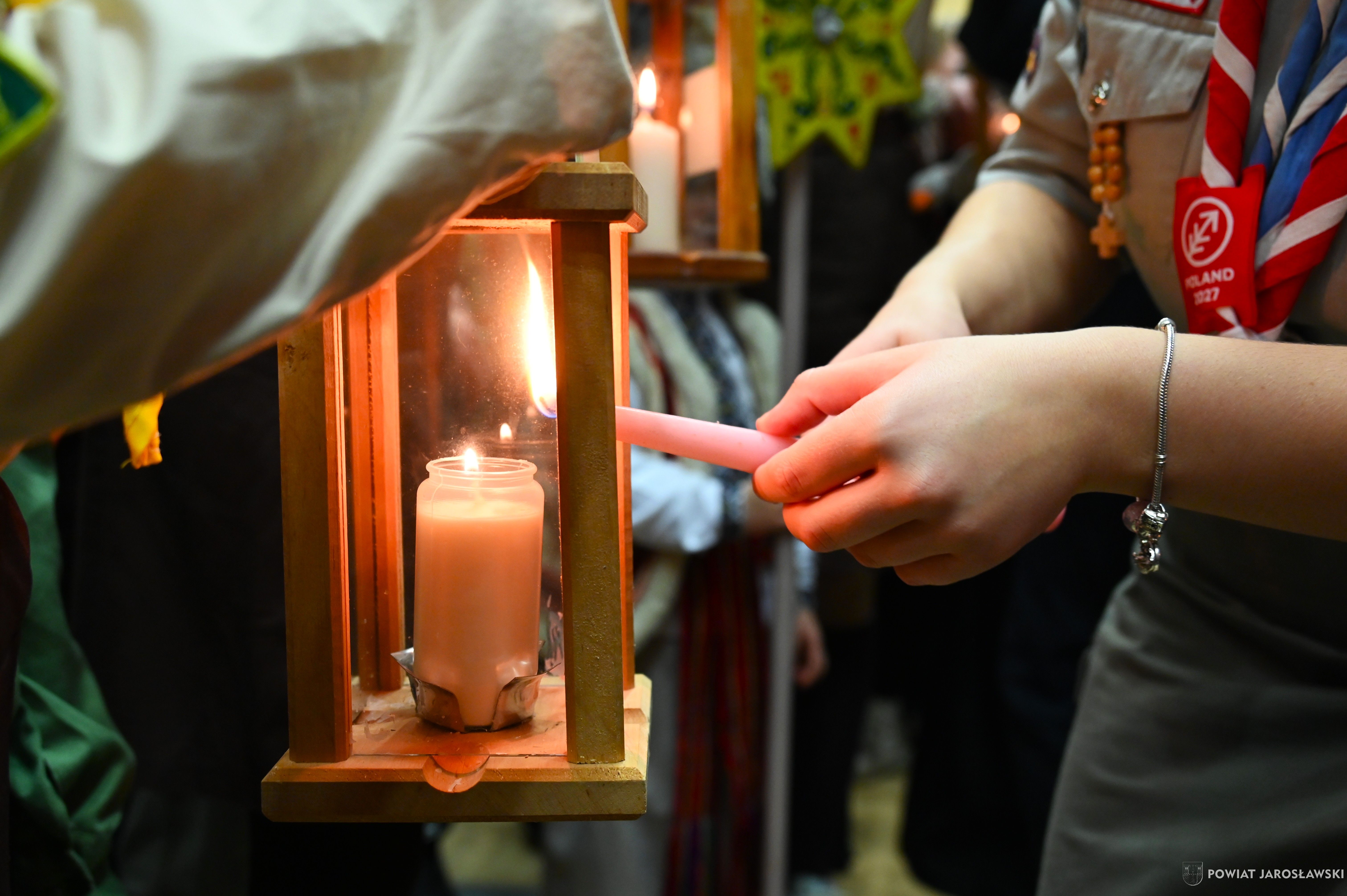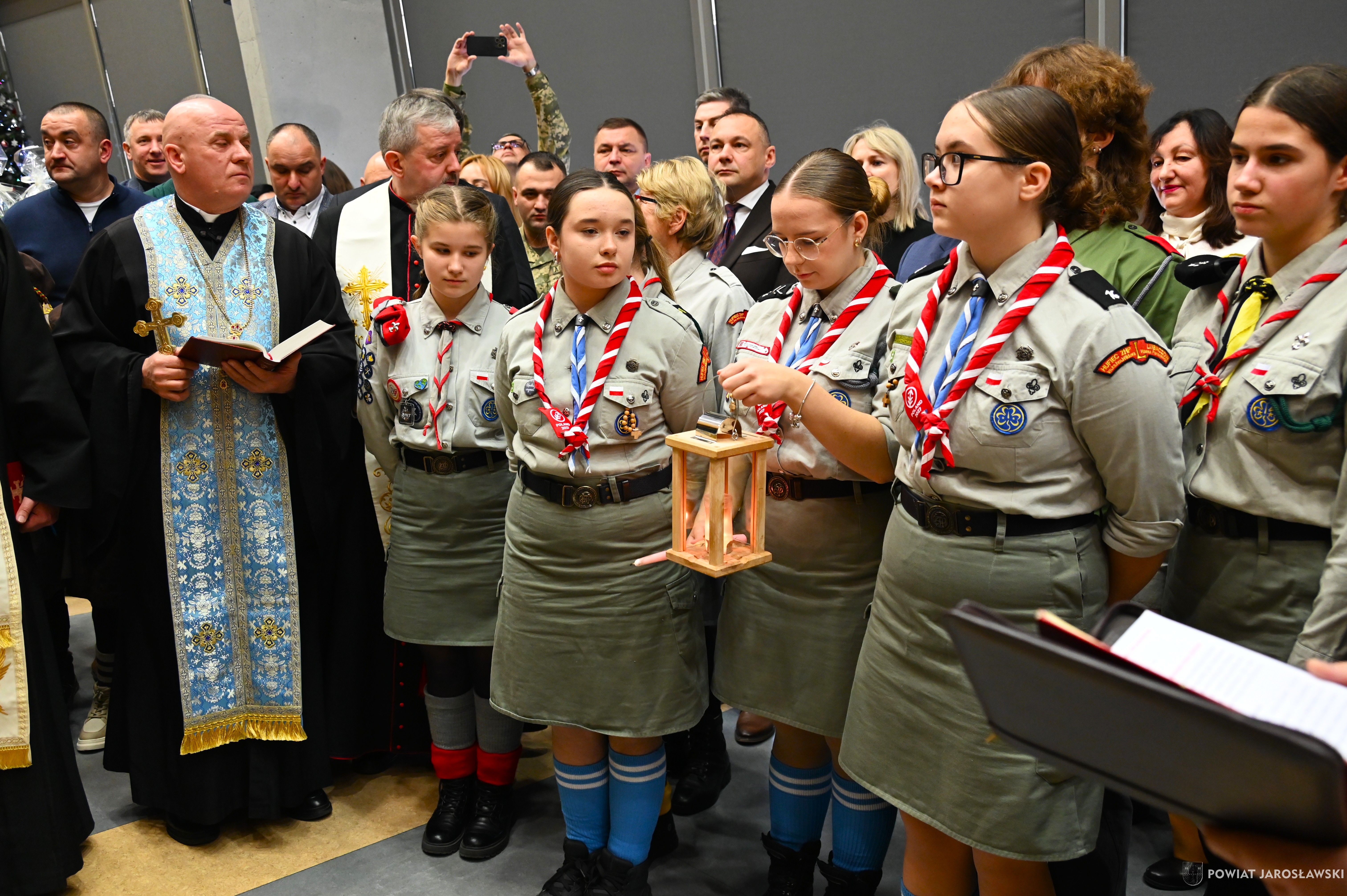 • Betlejemskie Światło Pokoju – dobro, które łączy ponad granicami. Historia Betlejemskiego Światła Pokoju od lat splata się z pograniczem, miejscem spotkania ludzi oraz kultur. To właśnie tutaj, na styku narodów, idea pokoju, braterstwa i wzajemnego zrozumienia nabiera szczególnego znaczenia. W tym roku powiatowa uroczystość przekazania Betlejemskiego Światła Pokoju odbyła się w Budomierzu, na granicy polsko-ukraińskiej, a jej gospodarzem był powiat lubaczowski. Tegoroczne wydarzenie przebiegało pod wymownym hasłem „Pielęgnuj dobro w sobie”, które w czasie trwających napięć i konfliktów wybrzmiewa wyjątkowo mocno... Betlejemskie Światło Pokoju zapalone w Grocie Narodzenia Pańskiego w Betlejem, od blisko 40 lat przemierza drogę przez Europę, niosąc przesłanie nadziei i pojednania. Niezmiennie, światło dociera do kolejnych krajów, przypominając, że pokój zaczyna się w sercu każdego z nas... Podczas uroczystości w Budomierzu polscy harcerze i skauci, samorządowcy, przedstawiciele służb oraz zaproszeni goście wspólnie przekazali płomień miłości i nadziei przyjaciołom z Ukrainy. Wydarzenie było wyrazem solidarności, wzajemnego wsparcia oraz kontynuacją wieloletniej tradycji współpracy transgranicznej. Powiat jarosławski reprezentował jego włodarz - starosta jarosławski Kamil Dziukiewicz, któremu towarzyszyła radna powiatu Agnieszka Pieniążek. Obecność przedstawicieli obu narodów była dowodem na to, że mimo różnic i trudnych doświadczeń, możliwe jest spotkanie oparte na szacunku i wspólnych wartościach. Tegoroczne hasło  „Pielęgnuj dobro w sobie”  stało się nie tylko mottem uroczystości, ale także cichym apelem do wszystkich uczestników, by dobro, empatia i wrażliwość na drugiego człowieka towarzyszyły codziennym decyzjom i działaniom. tekst, zdjęcia. Patrycja Strawa-Buryło