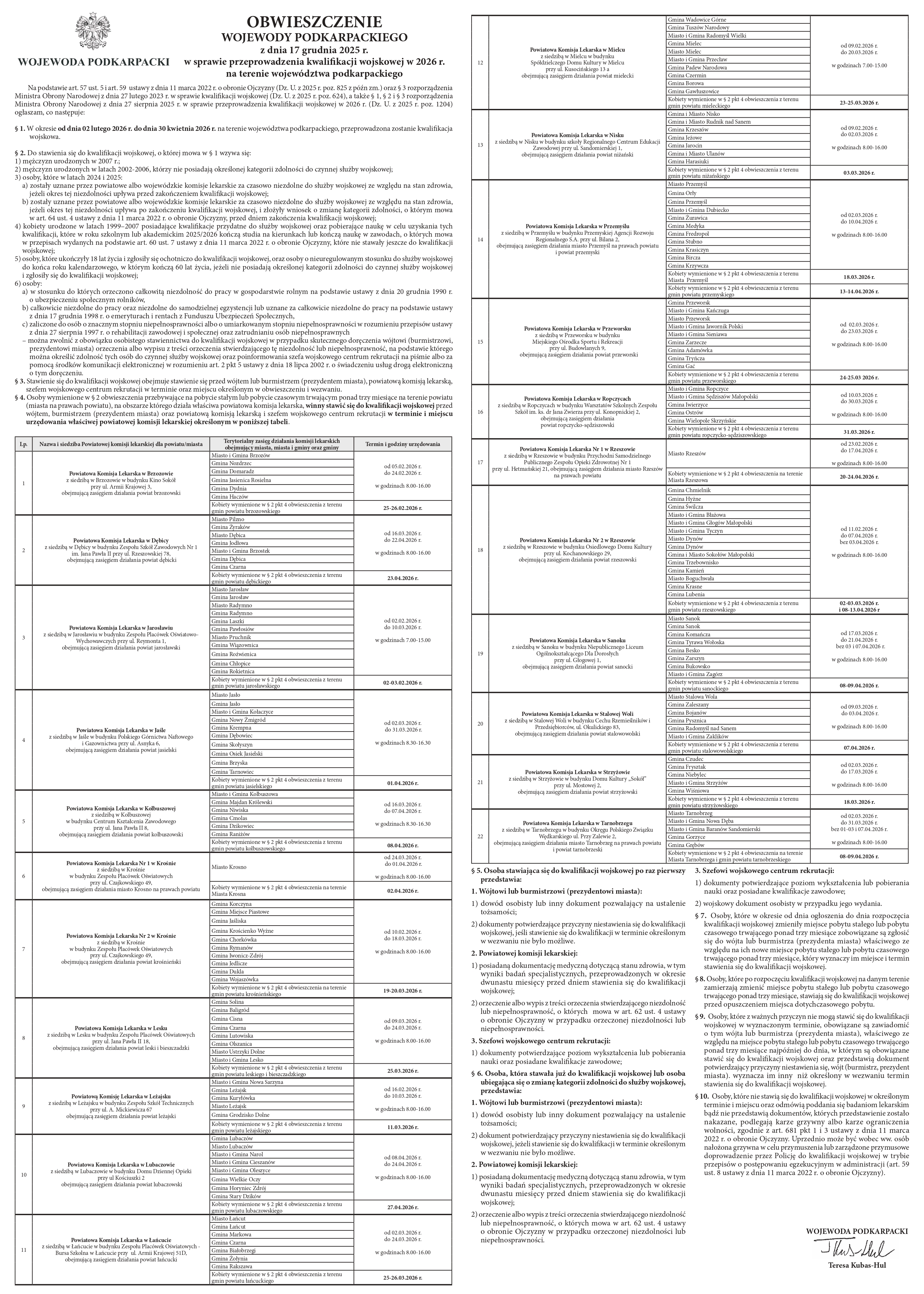 • Obwieszczenie wojewody podkarpackiego w sprawie przeprowadzenia kwalifikacji wojskowej w 2026 roku na terenie województwa podkarpackiego. Przedstawiamy obwieszczenie wojewody podkarpackiego w sprawie przeprowadzenia kwalifikacji wojskowej w 2026 r. na terenie województwa podkarpackiego. W załączniku obwieszczenie do pobranie w pliku .pdf.