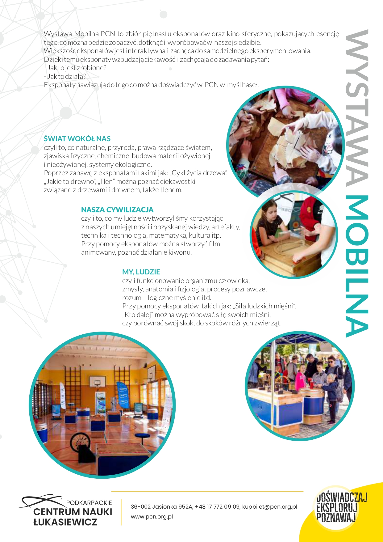Ekspozycje oraz warsztaty oferowane przez PCN zafascynują przedszkolaków, uczniów szkół podstawowych, szkół średnich, a także dorosłych. Z naszej oferty korzystają zarówno 3-latki, jak i grupy senioralne. To przestrzeń stymulująca do zdobywania wiedzy i osobistego rozwoju w oparciu o samodzielne doświadczanie nauki, kontakt z dziedzictwem Podkarpacia oraz odkrywanie złożoności i współzależności pomiędzy światem naturalnym, człowiekiem w nim żyjącym, jak i osiągnięciami naszej cywilizacji.