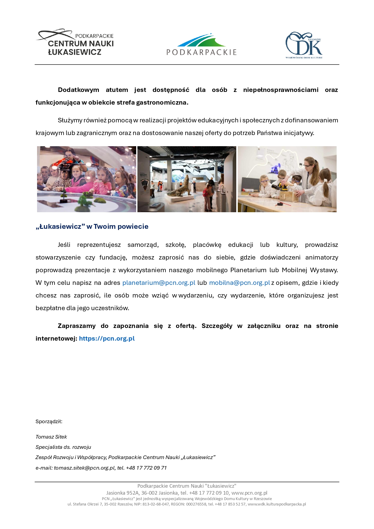 W imieniu Podkarpackiego Centrum Nauki "Łukasiewicz" zapraszamy mieszkańców powiatu, zorganizowane grupy dzieci i młodzieży, a także dorosłych i seniorów do skorzystania z wyjątkowej oferty Podkarpackiego Centrum Nauki "Łukasiewicz" w Jasionce k. Rzeszowa.