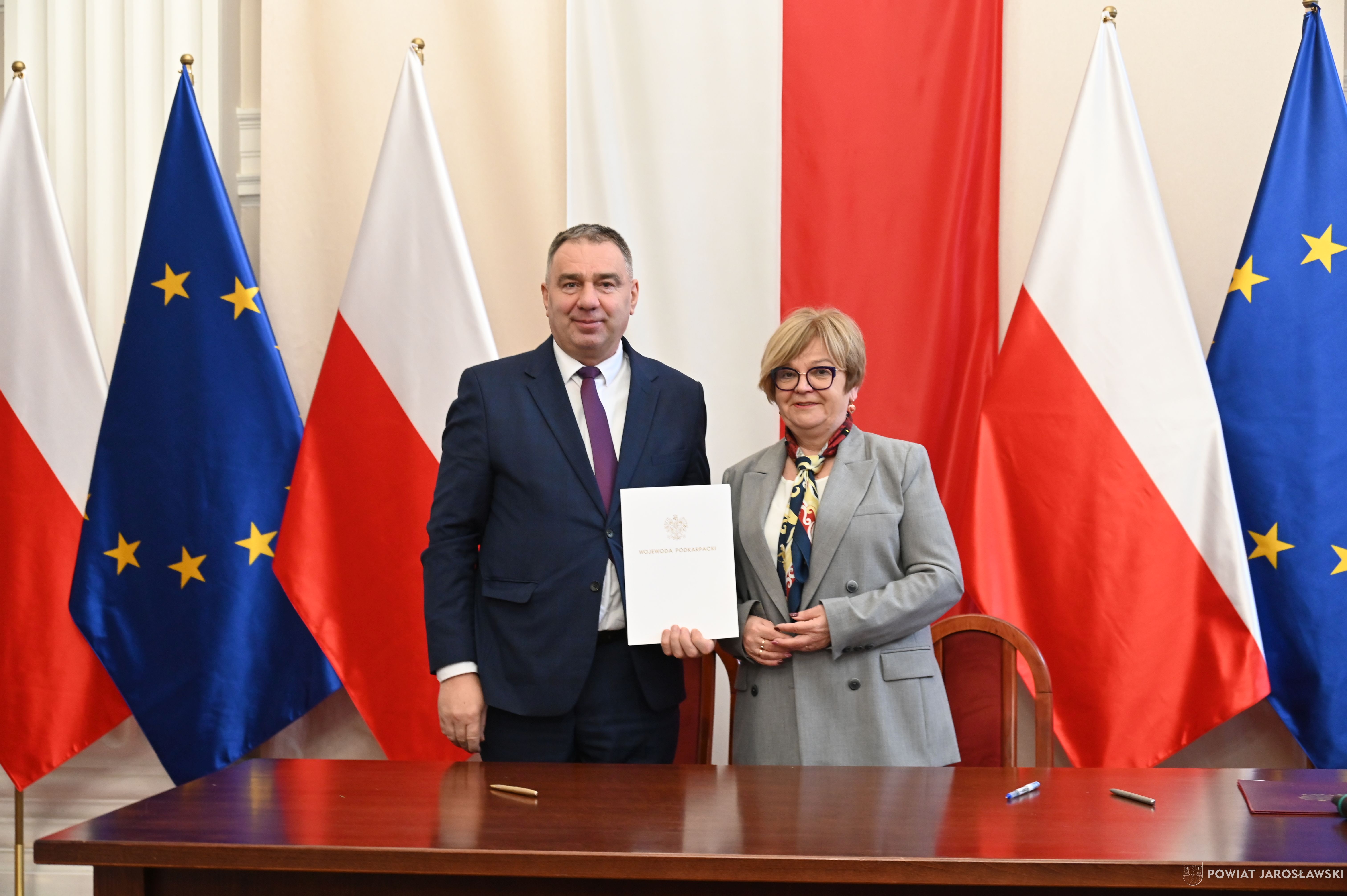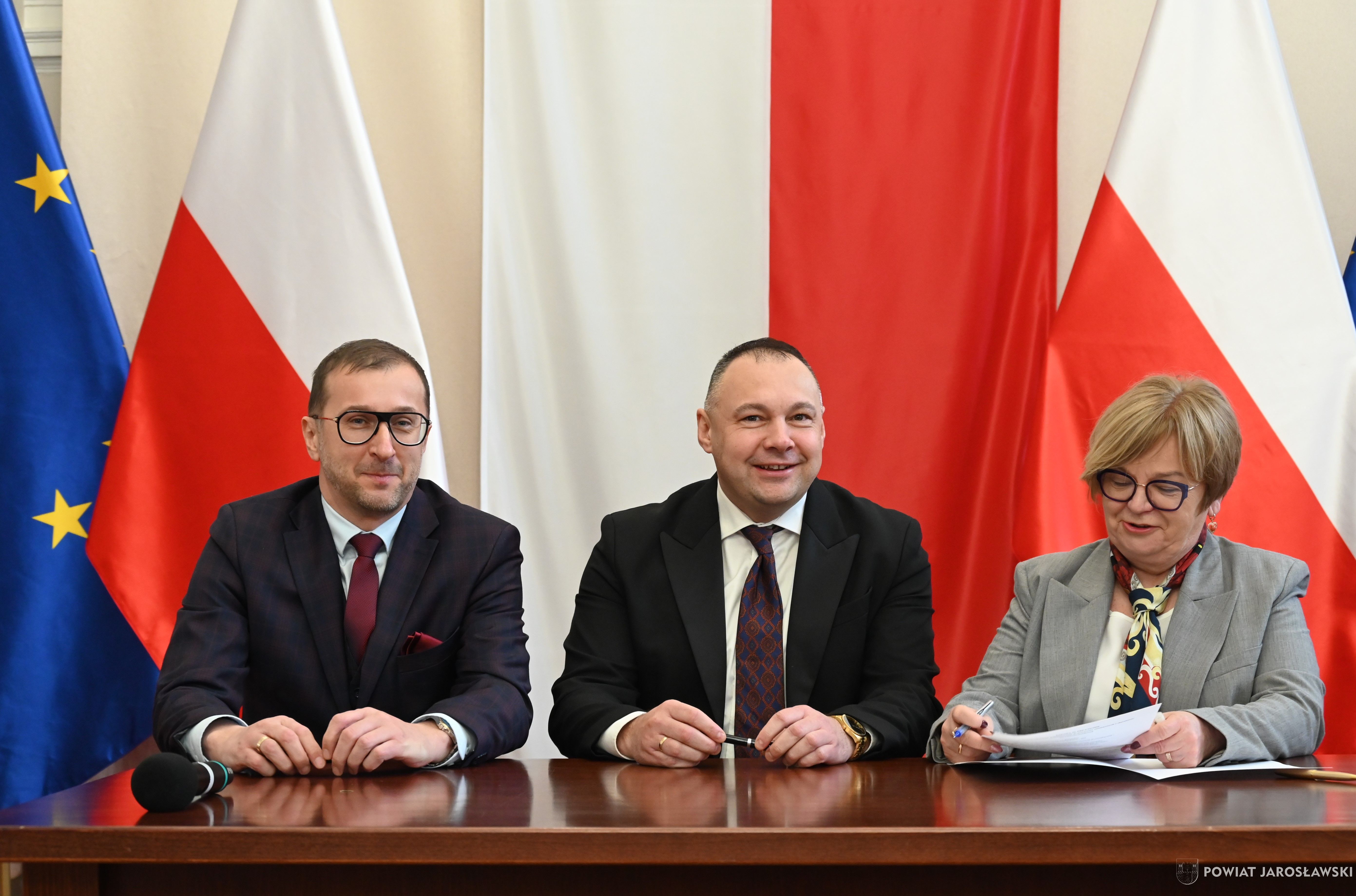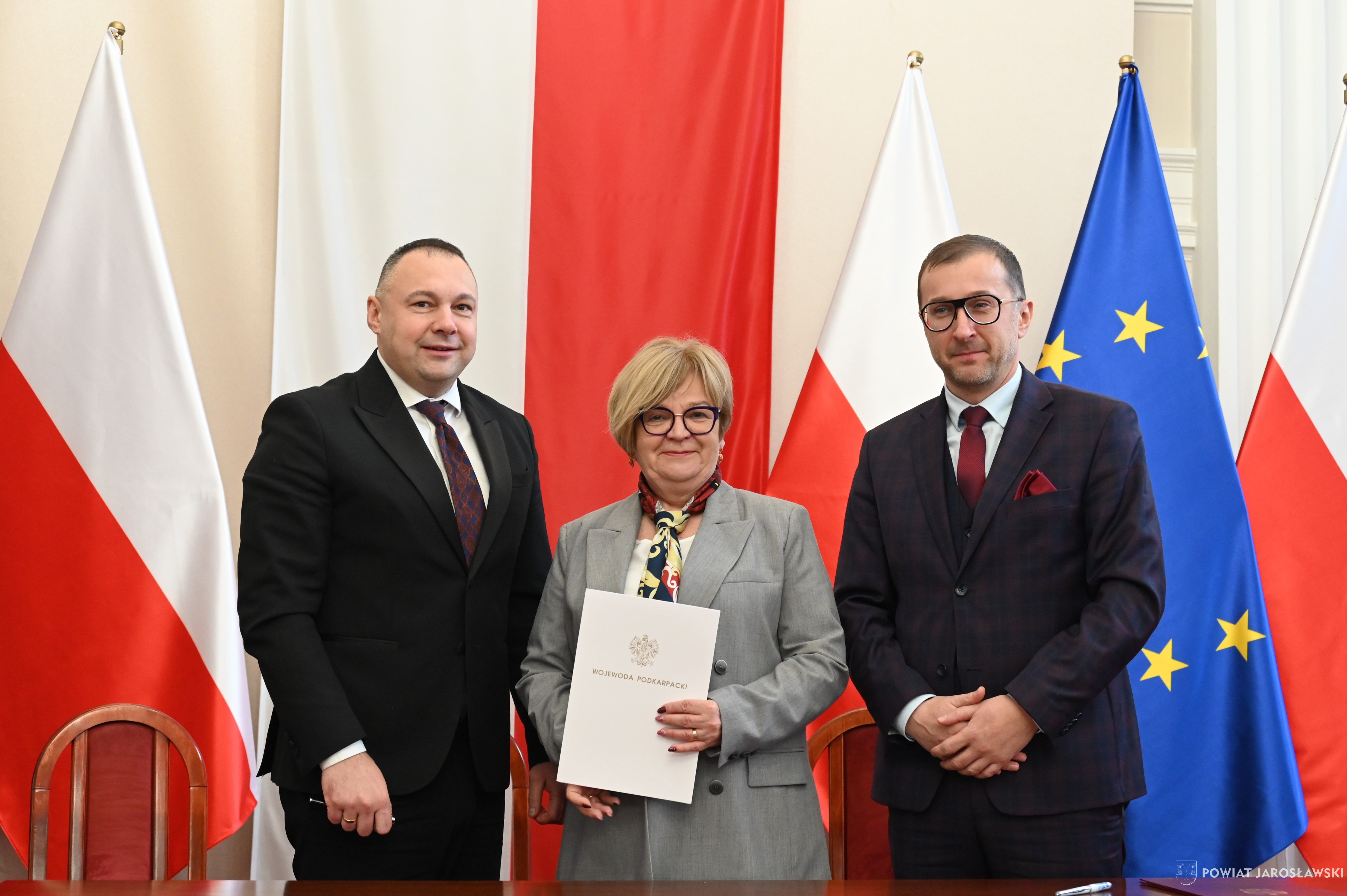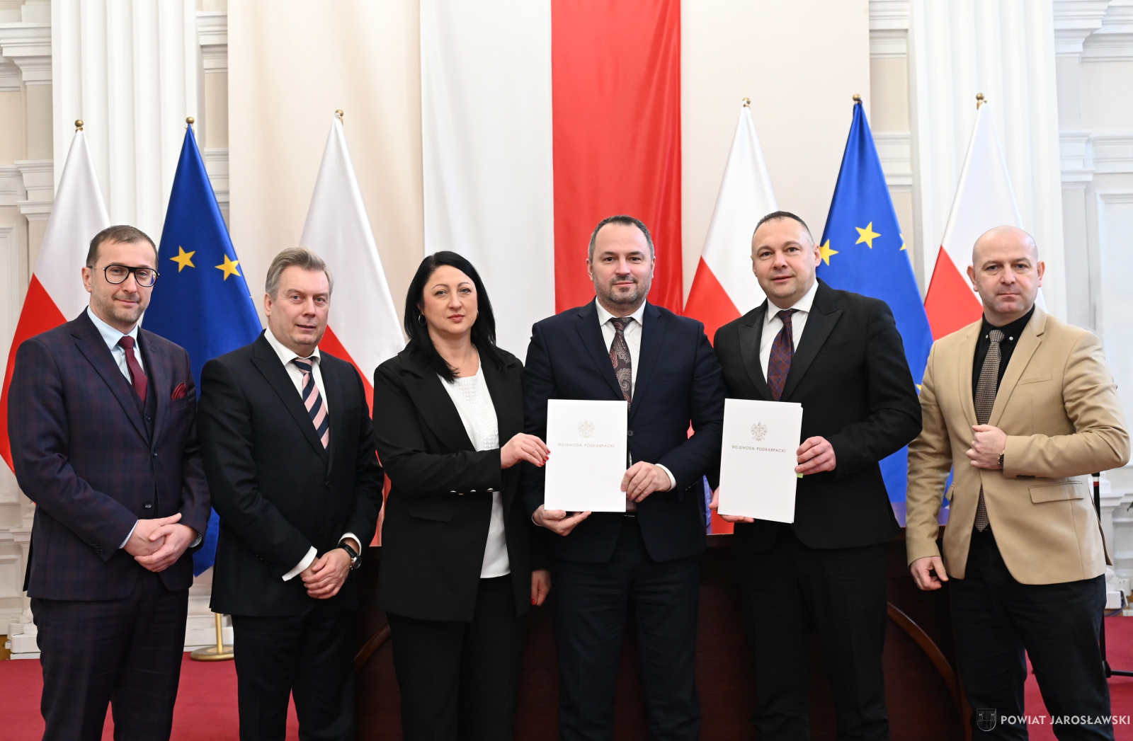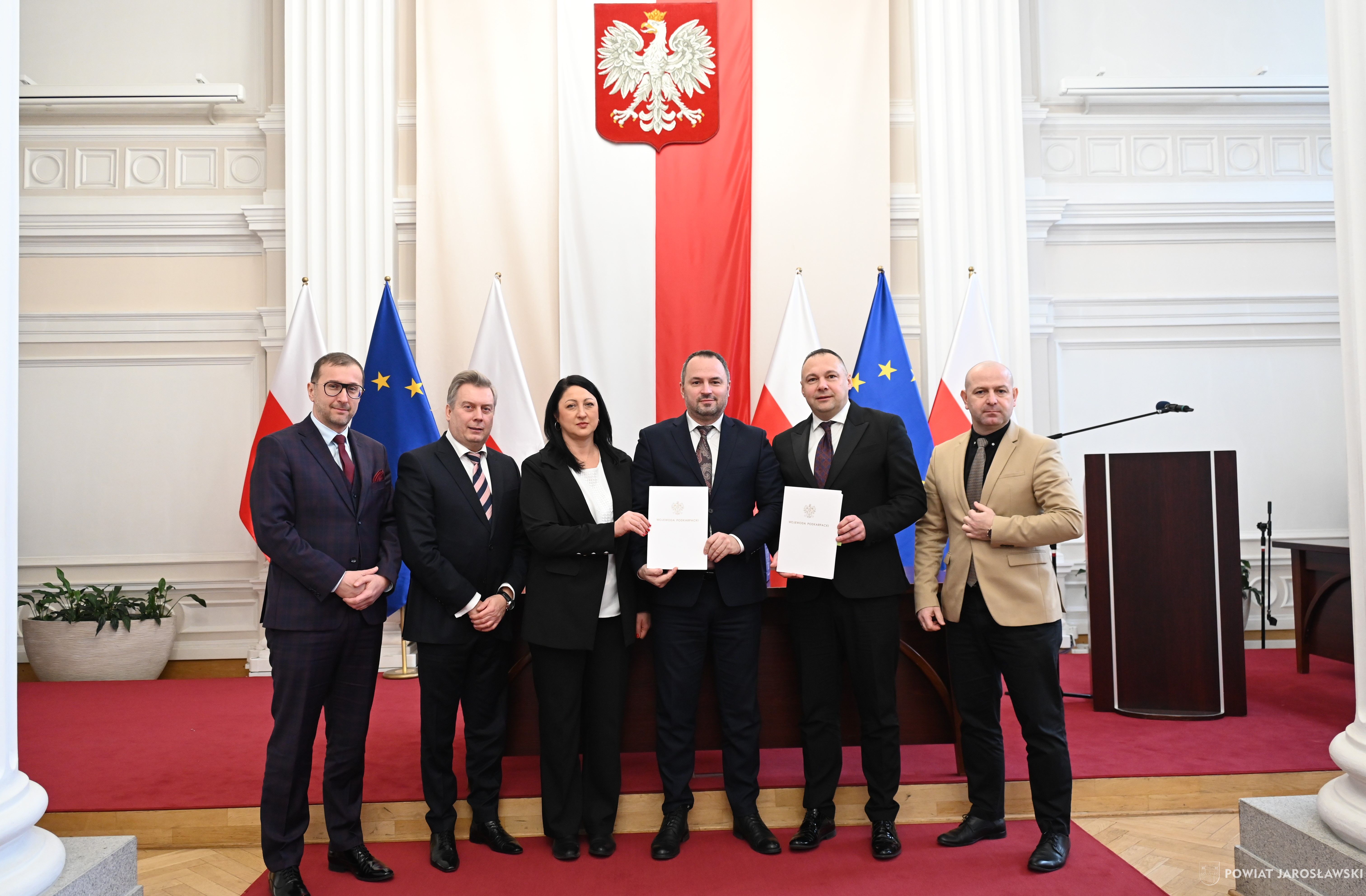 Wczesnym przedpołudniem, 22 stycznia br., w sali kolumnowej Podkarpackiego Urzędu Wojewódzkiego, starosta jarosławski Kamil Dziukiewicz, a zarazem przewodniczący zarządu związku wspólnie z wicestarostą Krzysztofem Cebulakiem (wiceprzewodniczącym zarządu), w towarzystwie prezesa PKS Jarosław S.A. Tomasza Deca, podpisali z wojewodą podkarpackim Teresą Kubas-Hul umowę na dofinasowanie realizacji przewozów autobusowych o charakterze użyteczności publicznej.