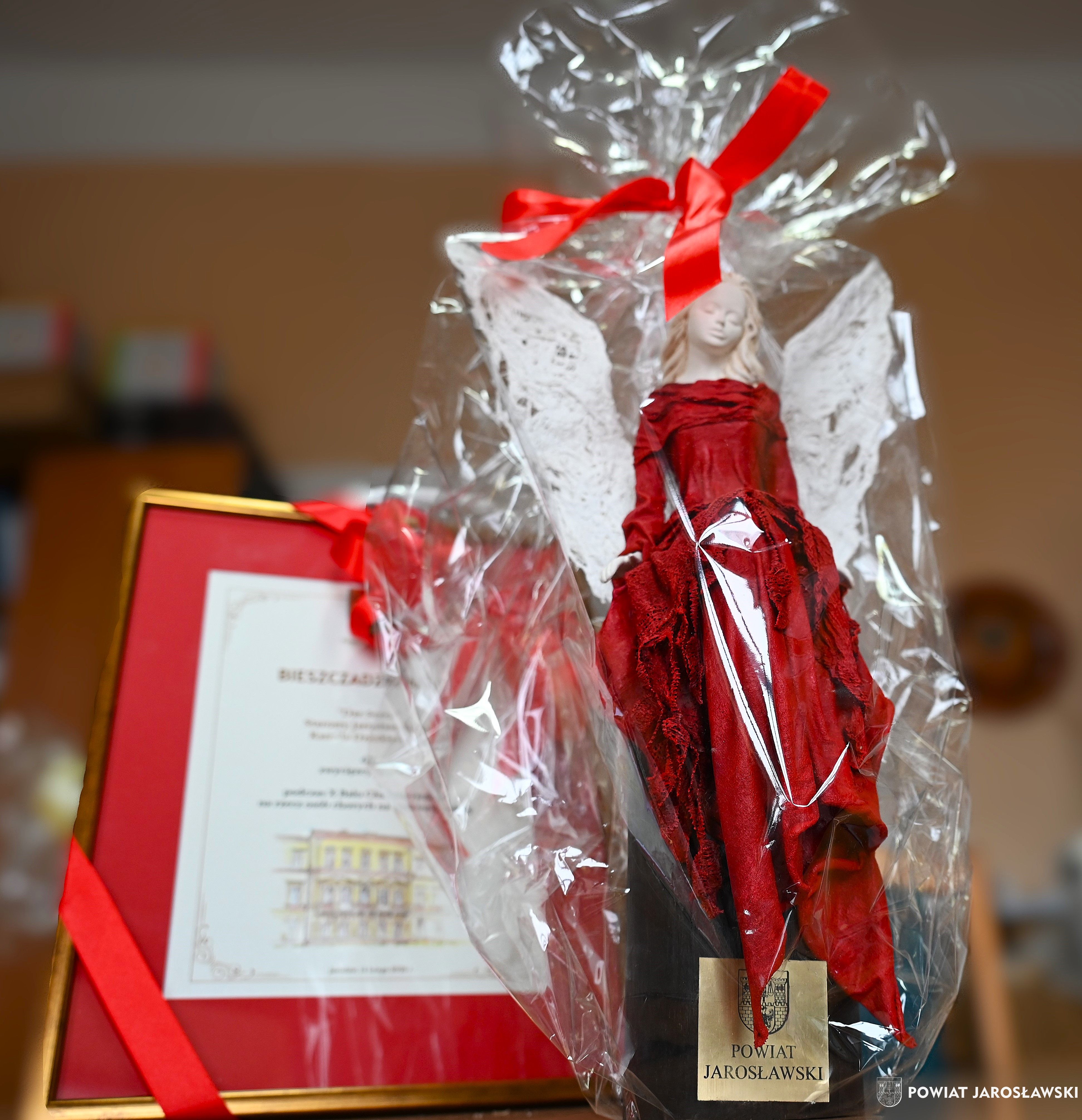4 lutego br., Kamil Dziukiewicz Starosta Powiatu Jarosławskiego spotkał się z reprezentantką fundacji Pomocy Chorym na Mukowiscydozę Mukohelp Karoliną Berezą i przekazał niezwykły „dar serca” - Bieszczadzkiego Anioła – który zostanie wystawiony na licytację podczas X Balu Charytatywnego na rzecz podopiecznych fundacji.