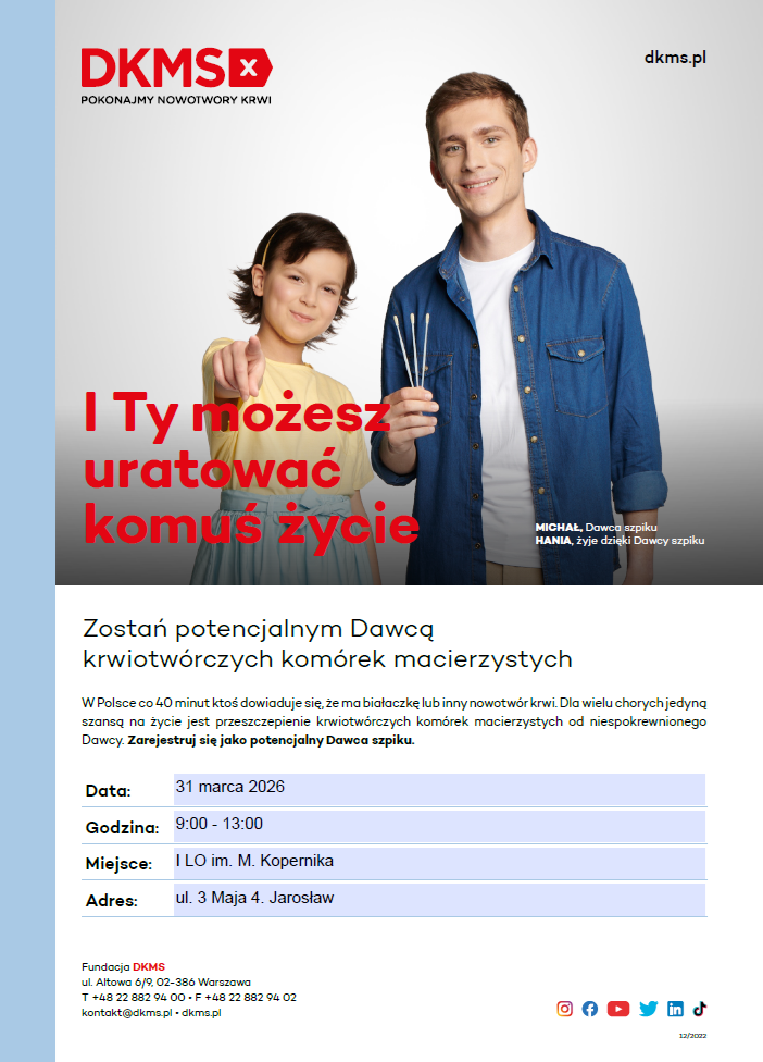 Społeczność I Liceum Ogólnokształcącego im. Mikołaja Kopernika w Jarosławiu wraz z uczniami - wolontariuszami fundacji DKMS i Samorządem Uczniowskim rozpoczyna kampanię #komórkomania.