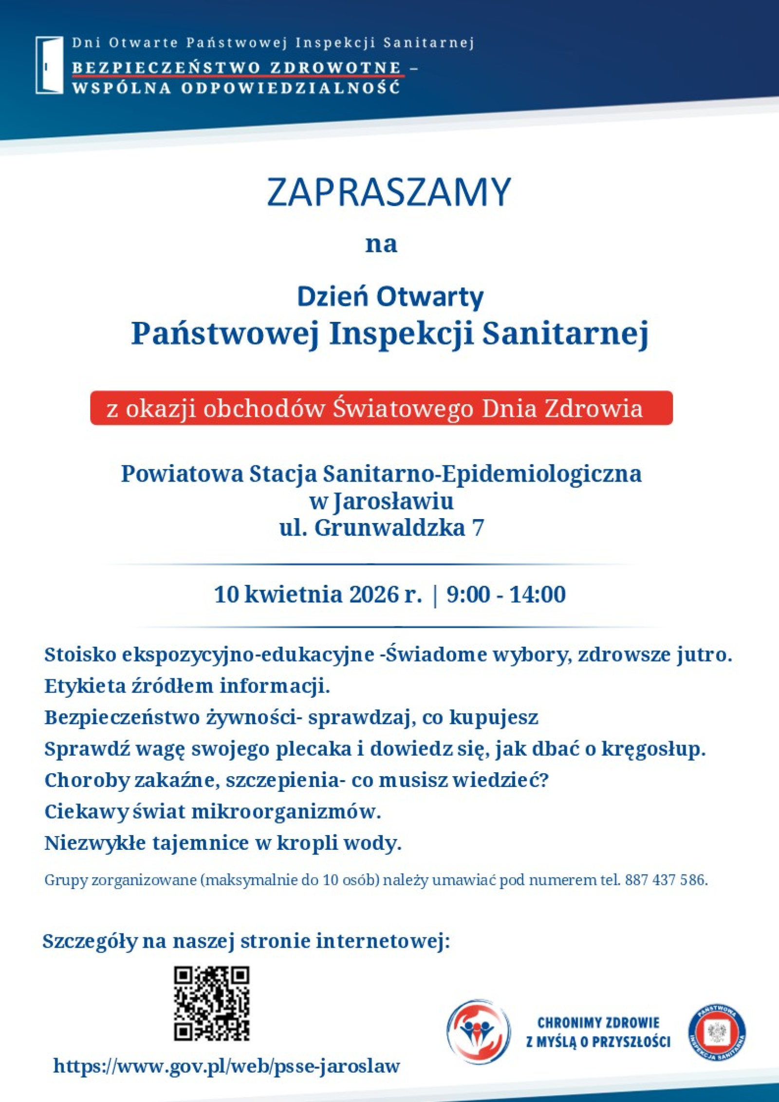 W imieniu Państwowego Powiatowego Inspektora Sanitarnego w Jarosławiu serdecznie zapraszamy na Dzień Otwarty Państwowej Inspekcji Sanitarnej, organizowany z okazji Światowego Dnia Zdrowia.