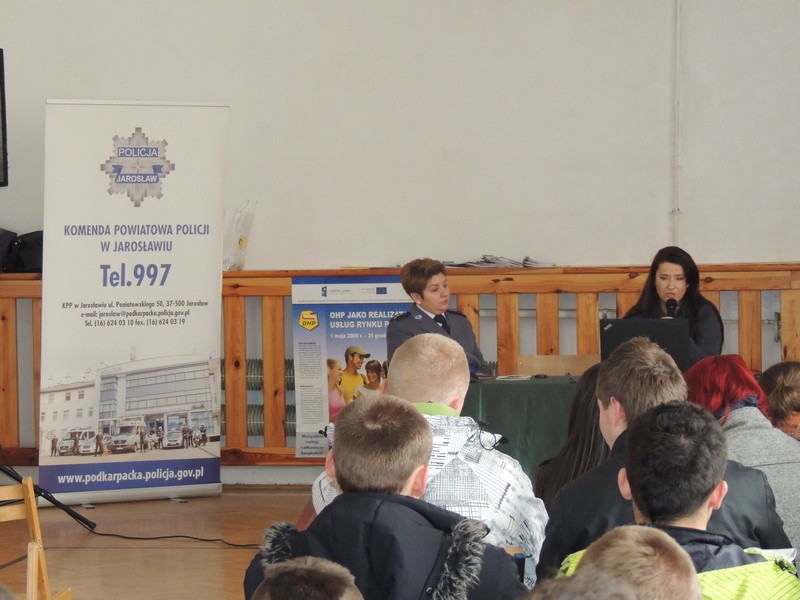 Zajęcia umożliwiły młodzieży uzyskanie pełnej informacji na temat świadczonych usług w zakresie pośrednictwa pracy w ramach sieci EURES, warunków życia i zatrudnienia w krajach Unii Europejskiej oraz aktualnych trendów na europejskim rynku pracy, przekazanych przez panią Katarzynę Paczkowską – doradcę EURES WUP w Rzeszowie. Ponadto pani Marta Gałuszka – oficer prasowa Komendanta Powiatowego Policji w Jarosławiu – przybliżyła uczniom problematykę związaną z bezpiecznym wyjazdem za granicę; omówiła między innymi błędy, jakie popełniają osoby wyjeżdżające do pracy w obcym kraju oraz zasady bezpieczeństwa i poszukiwania pomocy w sytuacjach zagrożenia.