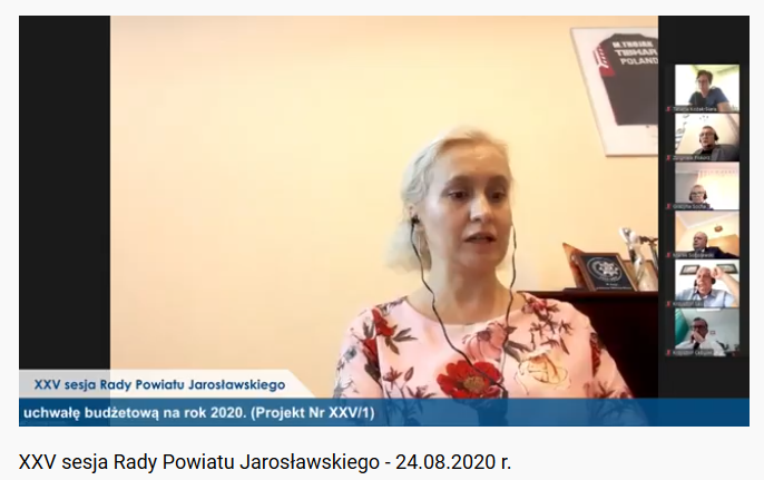 • Obrady XXV sesji Rady Powiatu Jarosławskiego. 25. sesja Rady Powiatu Jarosławskiego odbyła się 24 sierpnia 2020 r. W jej trakcie radni zapoznali się m.in. z informacją o  przebiegu wykonania budżetu za I półrocze 2020 roku. Sesja odbywała się w trybie zdalnym, za pośrednictwem internetu. Zarząd Powiatu, reprezentowany był podczas sesji przez wicestarostę Mariusza Trojaka, w zastępstwie starosty Stanisława Kłopota. Wśród podjętych decyzji była również uchwała w sprawie określenia rozkładu godzin pracy aptek ogólnodostępnych na terenie powiatu jarosławskiego oraz zapewnienia dostępności świadczeń przez apteki ogólnodostępne również w porze nocnej, w niedzielę, święta i inne dni wolne od pracy w 2020 roku. Uchwała dostępna jest w formie załącznika. Całość sesji dostępna jest pod adresem https://www.youtube.com/watch?v=kr4qMurLfAw