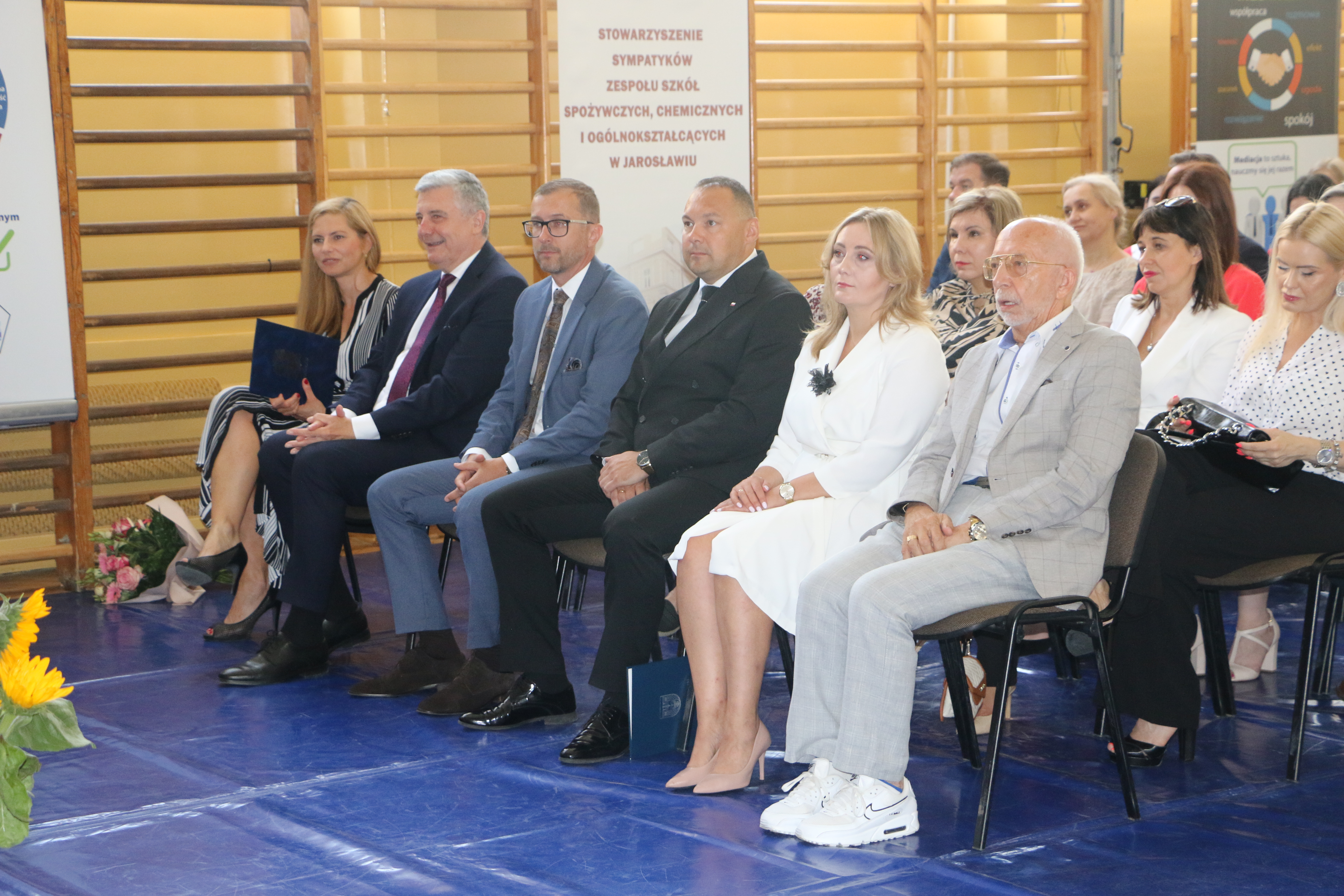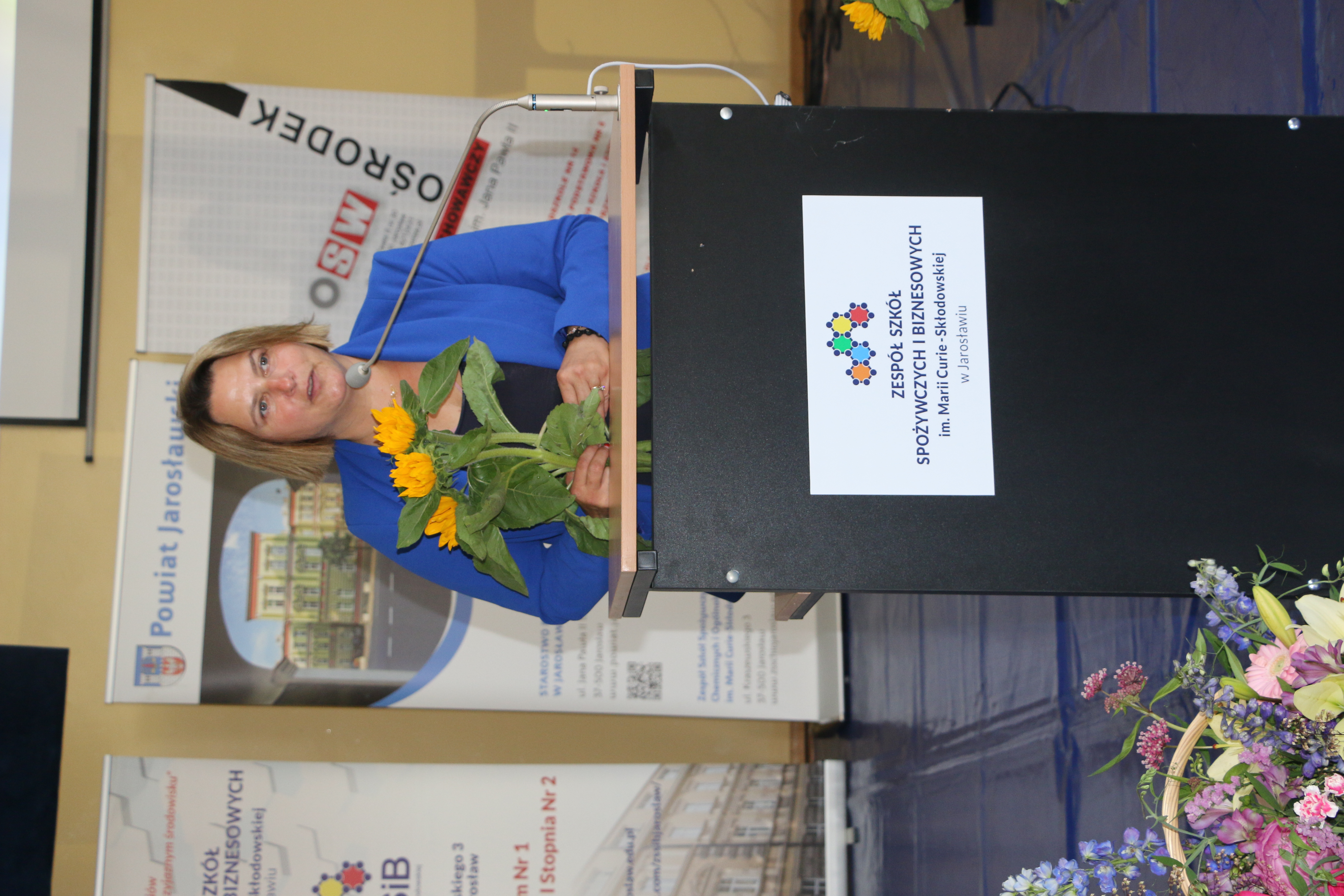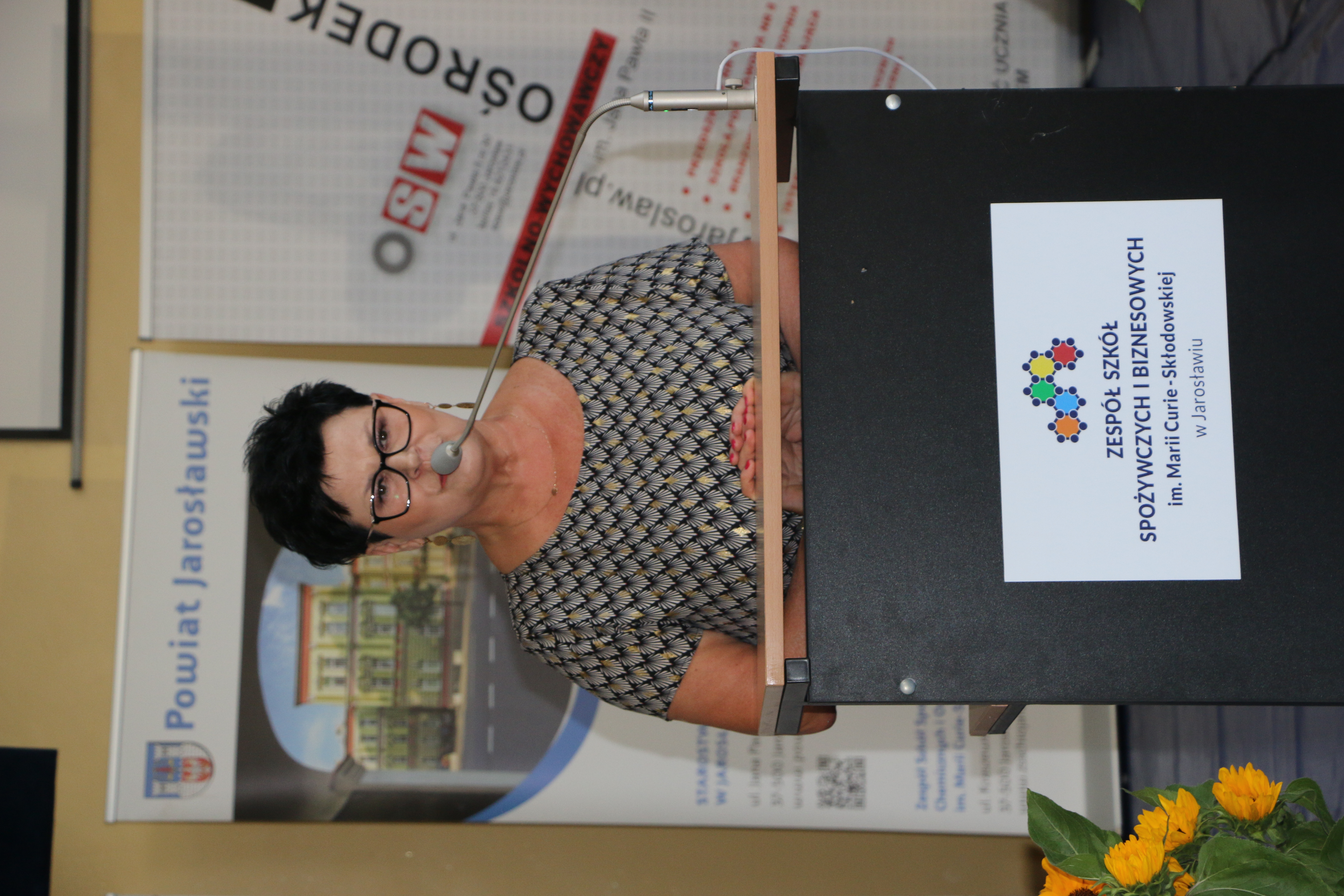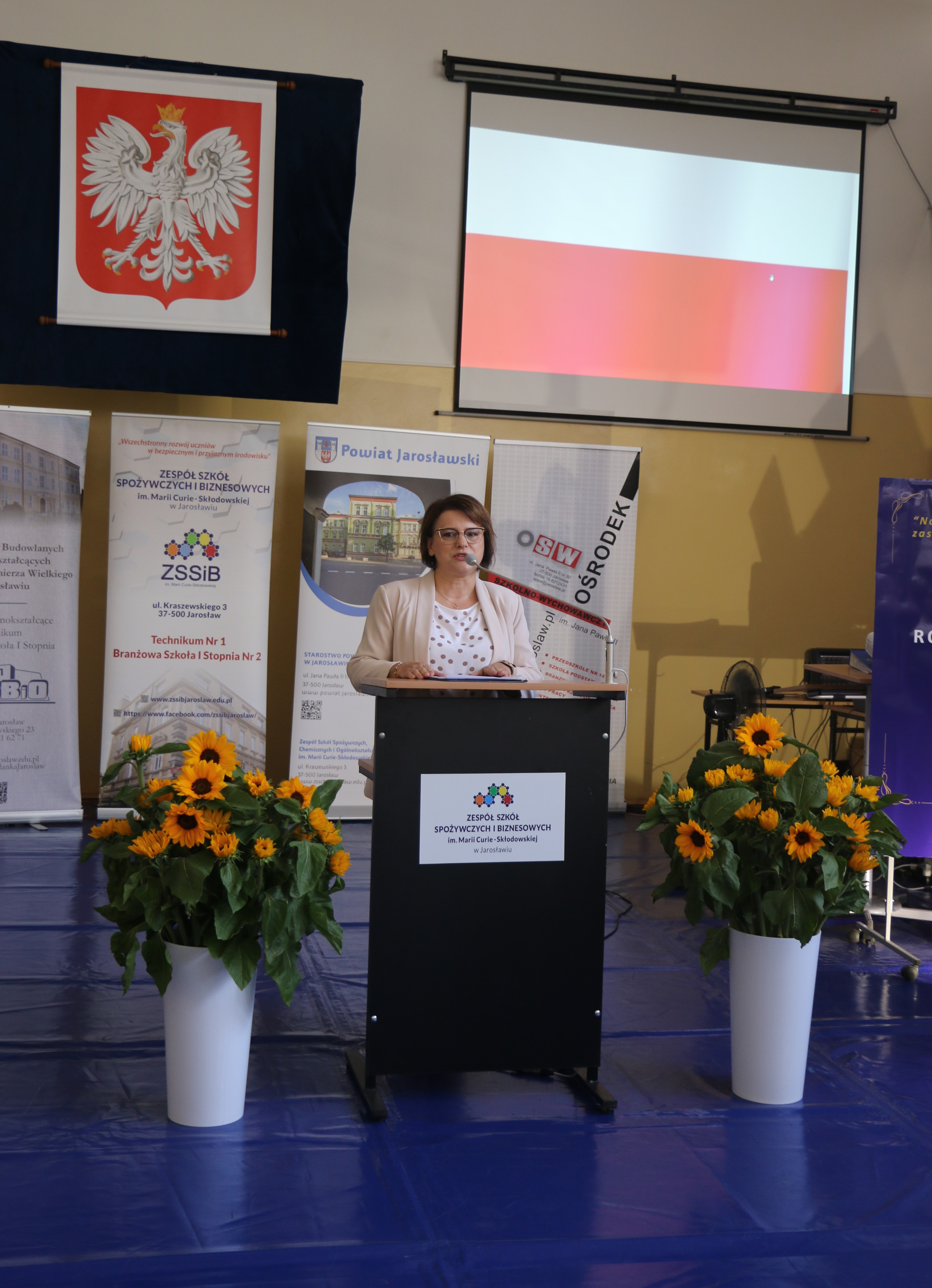 Dyrektor zabrała głos na początku uroczystości i powitała zebranych. Wśród gości byli, z ramienia Powiatu Jarosławskiego, Wicestarosta Jarosławski Krzysztof Cebulak, Wiceprzewodnicząca Rady Powiatu Magdalena Rożek, Przewodnicząca Komisji Oświaty Agnieszka Pieniążek, Etatowy Członek Zarządu Andrzej Wyczawski, Skarbnik Powiatu Agnieszka Mroczka, Naczelnik Wydziału Edukacji i Spraw Społecznych Marta Kurpiel oraz Naczelnik Wydziału Rozwoju i Promocji Monika Maj-Lichończak.