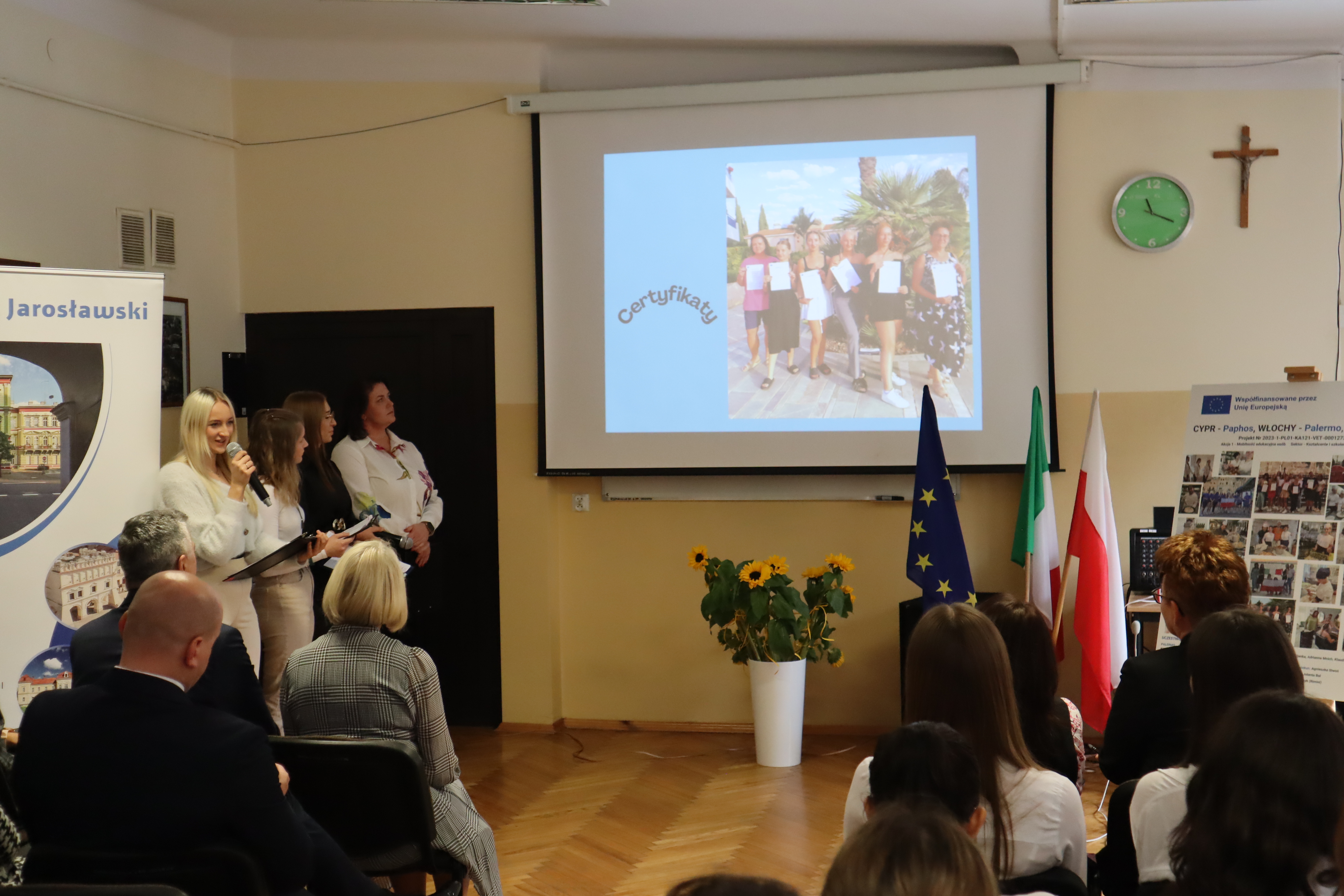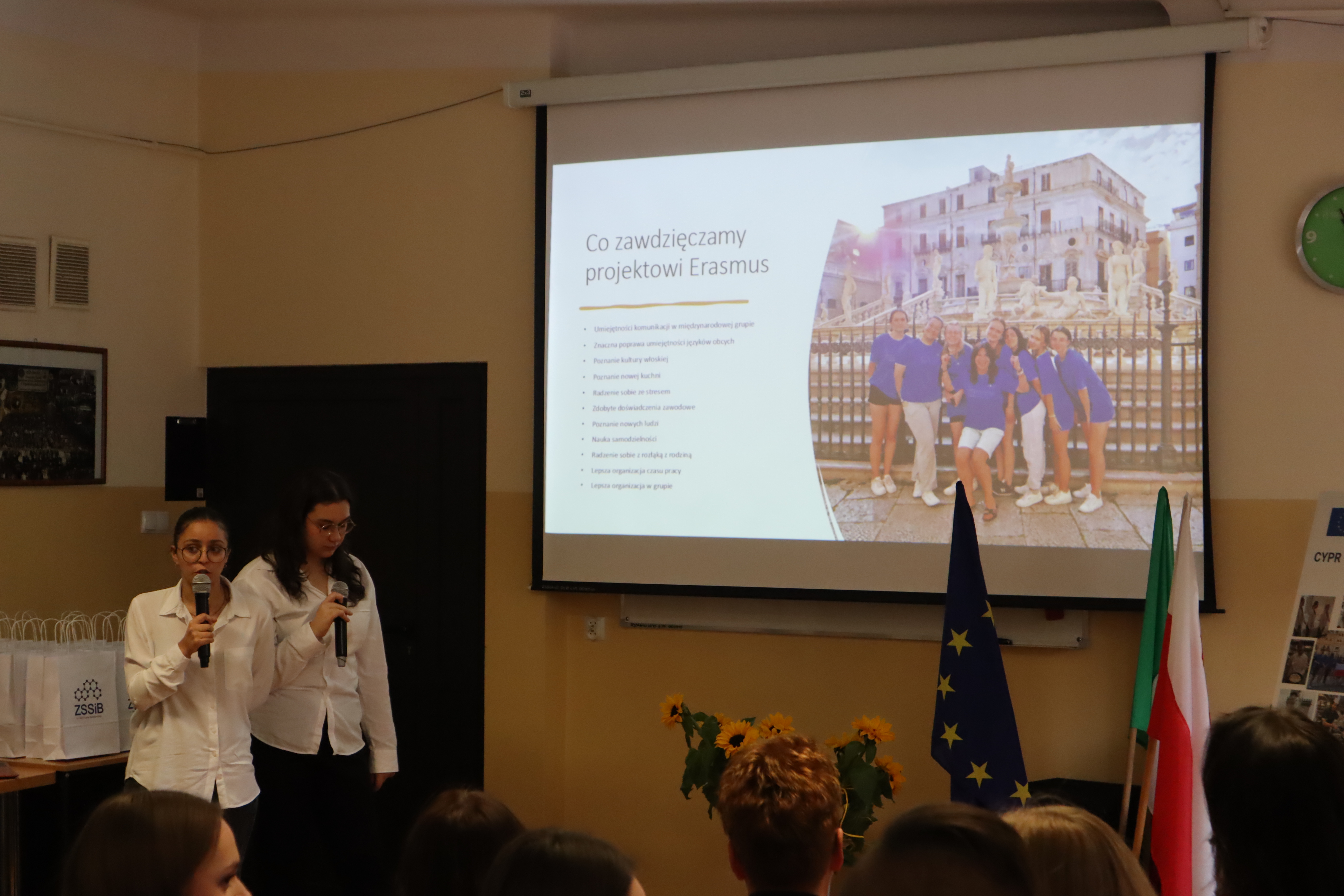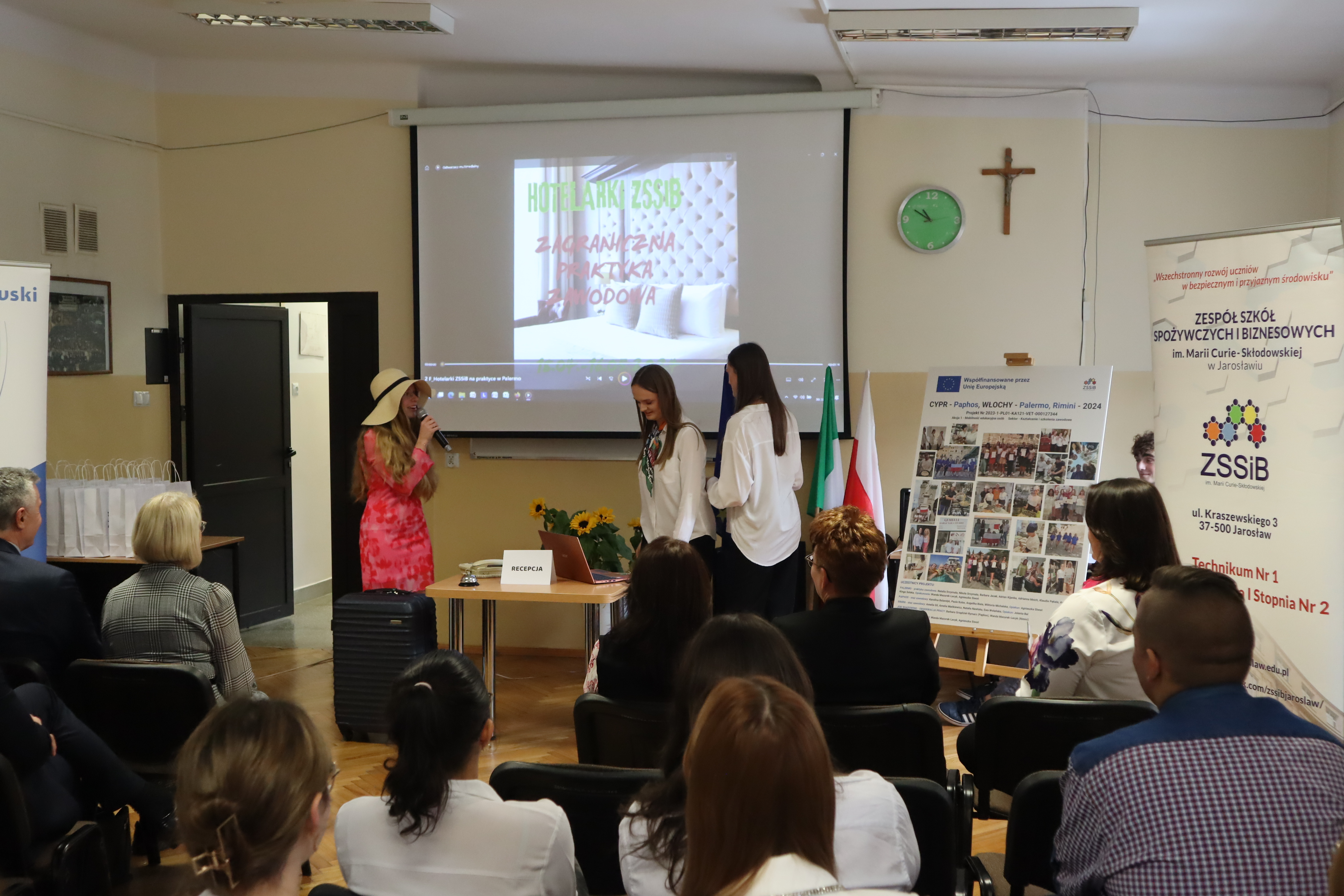 Podczas spotkania koordynatorzy wraz z uczestnikami projektu mieli okazję podzielić się z zaproszonymi gośćmi oraz pracownikami szkoły swoimi bogatymi doświadczeniami projektowymi. Uczestnicy zaprezentowali umiejętności zdobyte podczas realizacji projektu, pokazując gościom prezentacje, filmiki, a także przygotowaną specjalnie na tę okazję scenkę z recepcji hotelowej. Wspólnie spędzone środowe przedpołudnie wykorzystali także na ciepłe i sympatyczne wspominki z odbytych praktyk, ta temat towarzyszących im staży oraz nowopoznanych osób, programu kulturowego i wreszcie… czasu wolnego w słonecznym Palermo, Paphos i Rimini.