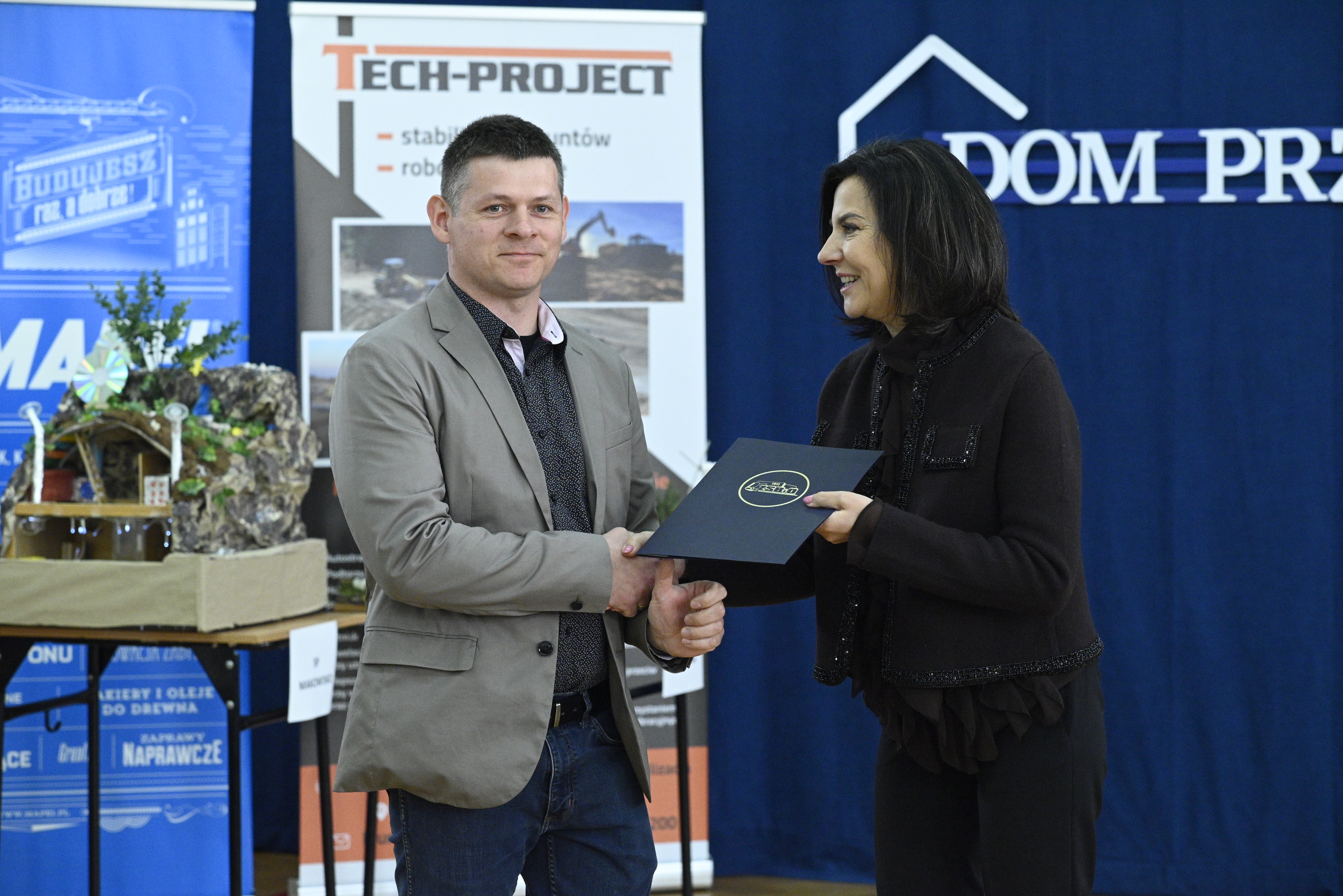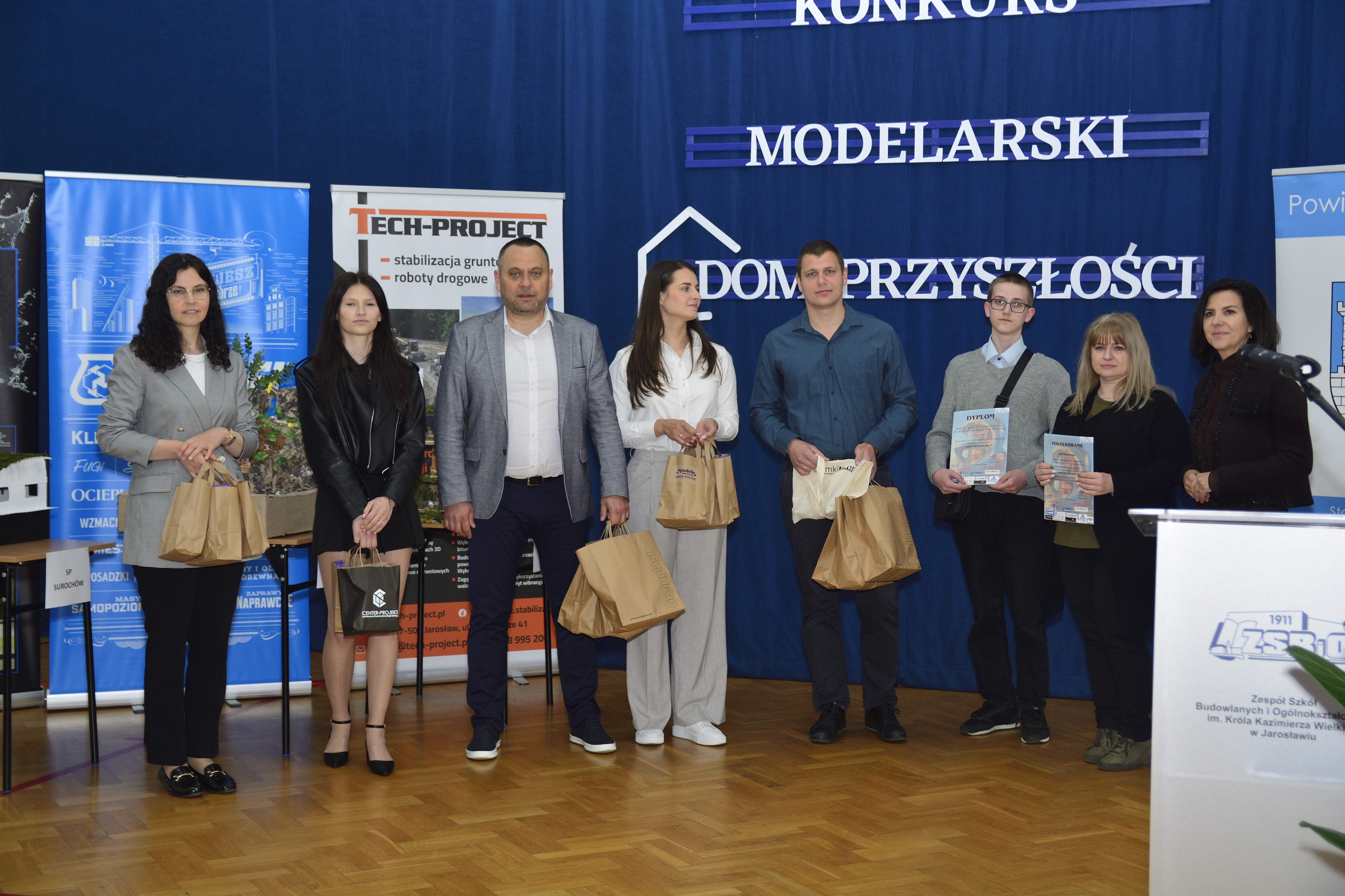 • Gala finałowa 2. edycji Powiatowego Konkursu Modelarskiego „Dom Przyszłości”. W piątek, 16 maja 2025 roku, w Zespole Szkół Budowlanych i Ogólnokształcących im. Króla Kazimierza Wielkiego w Jarosławiu odbyła się gala finałowa 2. edycji Powiatowego Konkursu Modelarskiego „Dom Przyszłości”. Wydarzenie, skierowane do uczniów klas VIII szkół podstawowych, miało na celu promocję kierunków kształcenia zawodowego w branży budowlanej oraz rozwijanie kreatywności i umiejętności projektowych młodych ludzi. Konkurs polegał na przygotowaniu przestrzennych makiet przedstawiających wizje domu przyszłości wraz z jego otoczeniem. Konkurs przebiegał pod honorowym patronatem starosty jarosławskiego Kamila Dziukiewicza. Włodarza podczas gali reprezentowała naczelnik Wydziału Edukacji i Spraw Społecznych Starostwa Powiatowego w Jarosławiu Monika Maziarz. Podczas gali finałowej jury, w skład którego weszli przedstawiciele sponsorów oraz nauczyciele związani z branżą budowlaną, nagrodziło najlepsze prace uczniów. Makiety oceniano pod kątem kreatywności, estetyki, funkcjonalności oraz zastosowania innowacyjnych rozwiązań architektonicznych. Galę otworzyła dyrektor szkoły Dorota Kaleta, która przywitała zaproszonych gości, w tym przedstawicieli sponsorów, nauczycieli, uczniów i ich opiekunów, dziękując za zaangażowanie w realizację konkursu. Uroczystość uświetniły zaś występy artystyczne (głównie popisy wokalne) w wykonaniu uczennic Zespołu Szkół Budowlanych. Nie jest żadnym zaskoczeniem, iż konkurs, podobnie jak w roku ubiegłym, cieszył się dużym zainteresowaniem, a wysoki poziom zgłoszonych prac potwierdził talent i zaangażowanie młodych uczestników. Wydarzenie zakończyło się wręczeniem dyplomów i nagród, a także podziękowaniami dla wszystkich, którzy przyczynili się do sukcesu tej inicjatywy. Serdecznie gratulujemy pomysłodawcom konkursu oraz jego laureatom! zdjęcia. Bartosz Buk tekst. Agata Godos