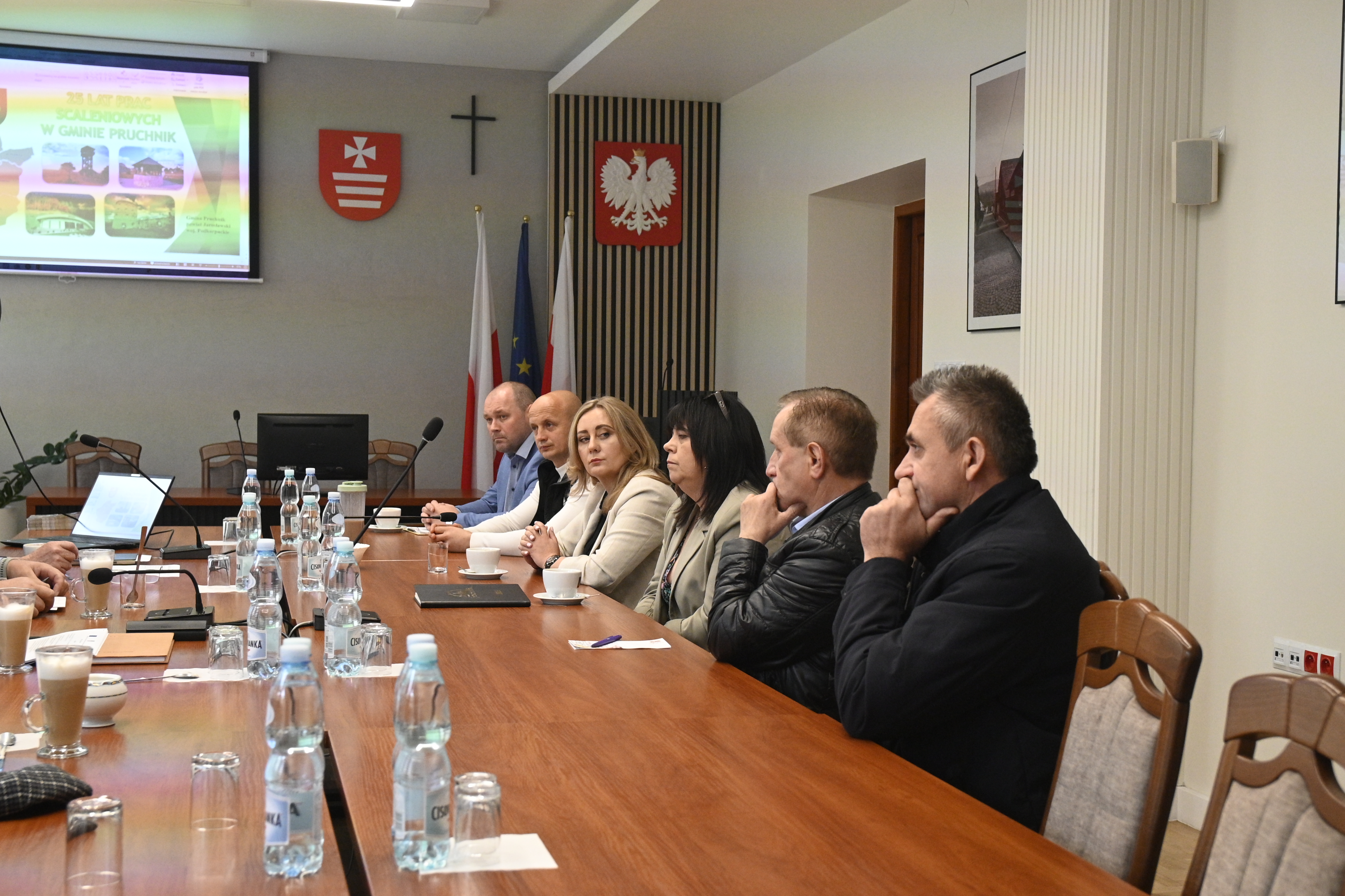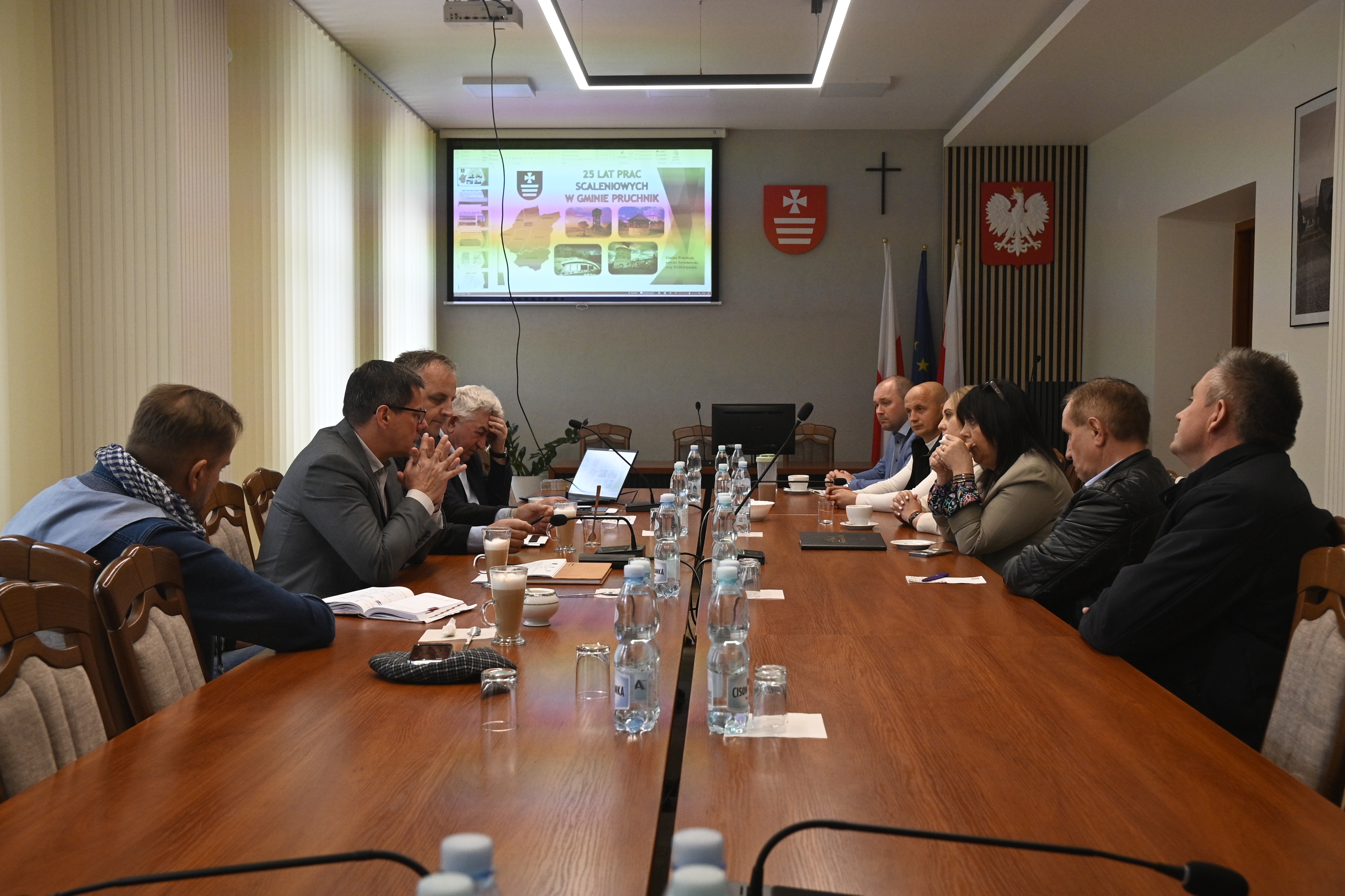 Posiedzenie rozpoczęło się od przedstawienia przez pracowników starostwa danych statystycznych oraz stanu zaawansowania prac poscaleniowych w miejscowościach na terenie gmin Pruchnik i Chłopice. Po prezentacji odbyła się szczegółowa dyskusja dotycząca kwestii technicznych związanych z realizowanymi inwestycjami, którą poprowadził inż. Mariusz Kic. Następnie Wacław Szkoła opowiedział o przebiegu i efektach prac scaleniowych na terenie gminy Pruchnik.