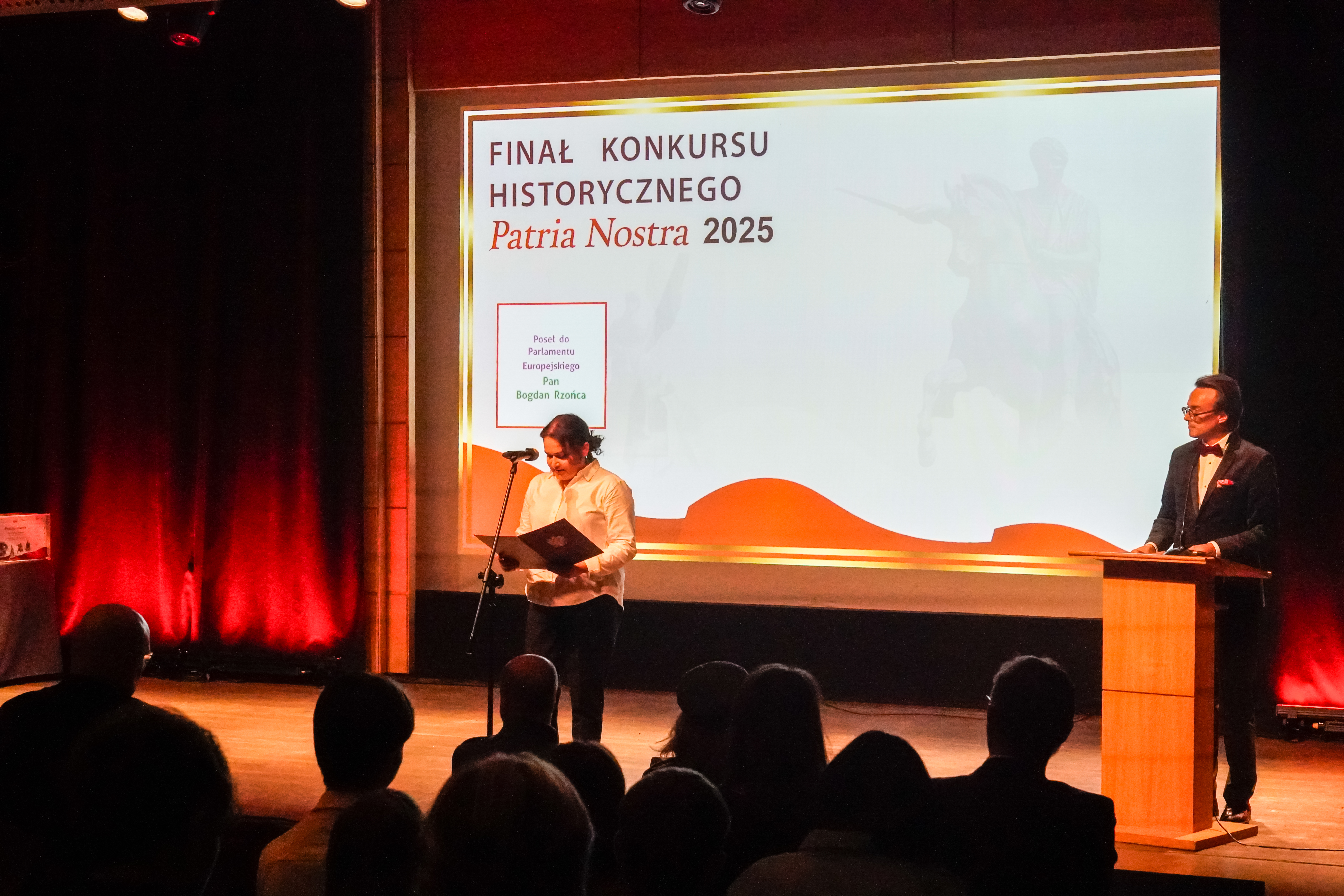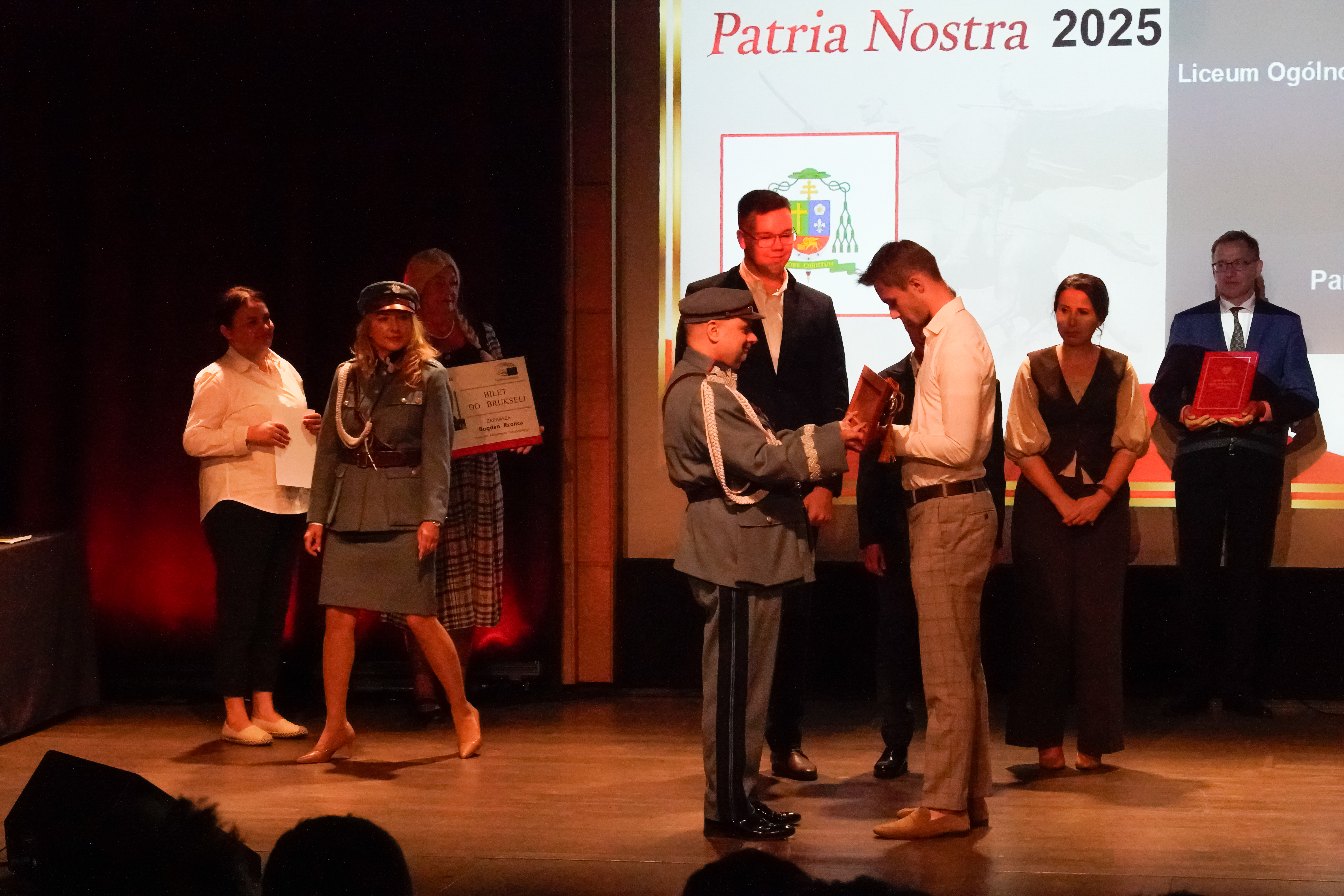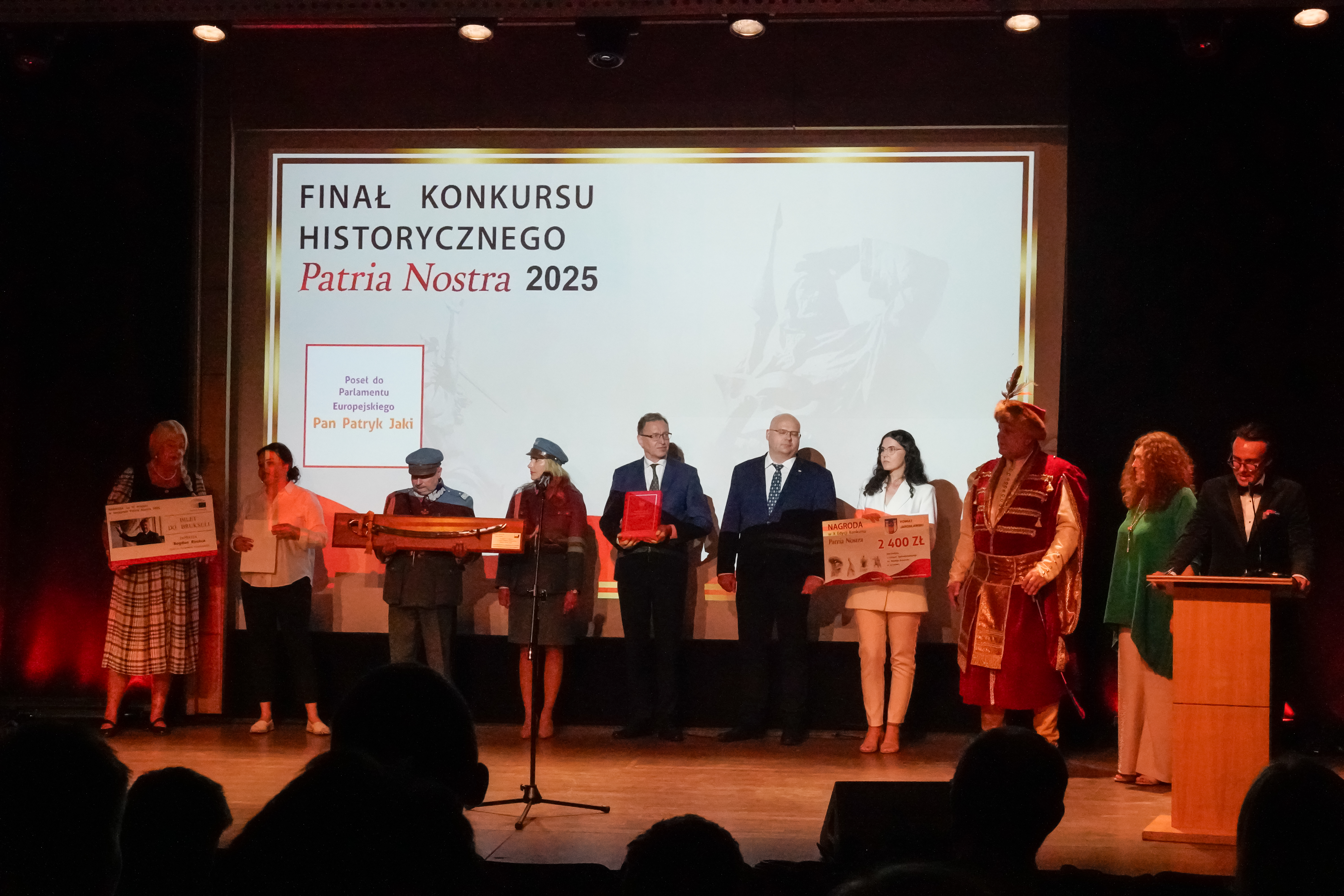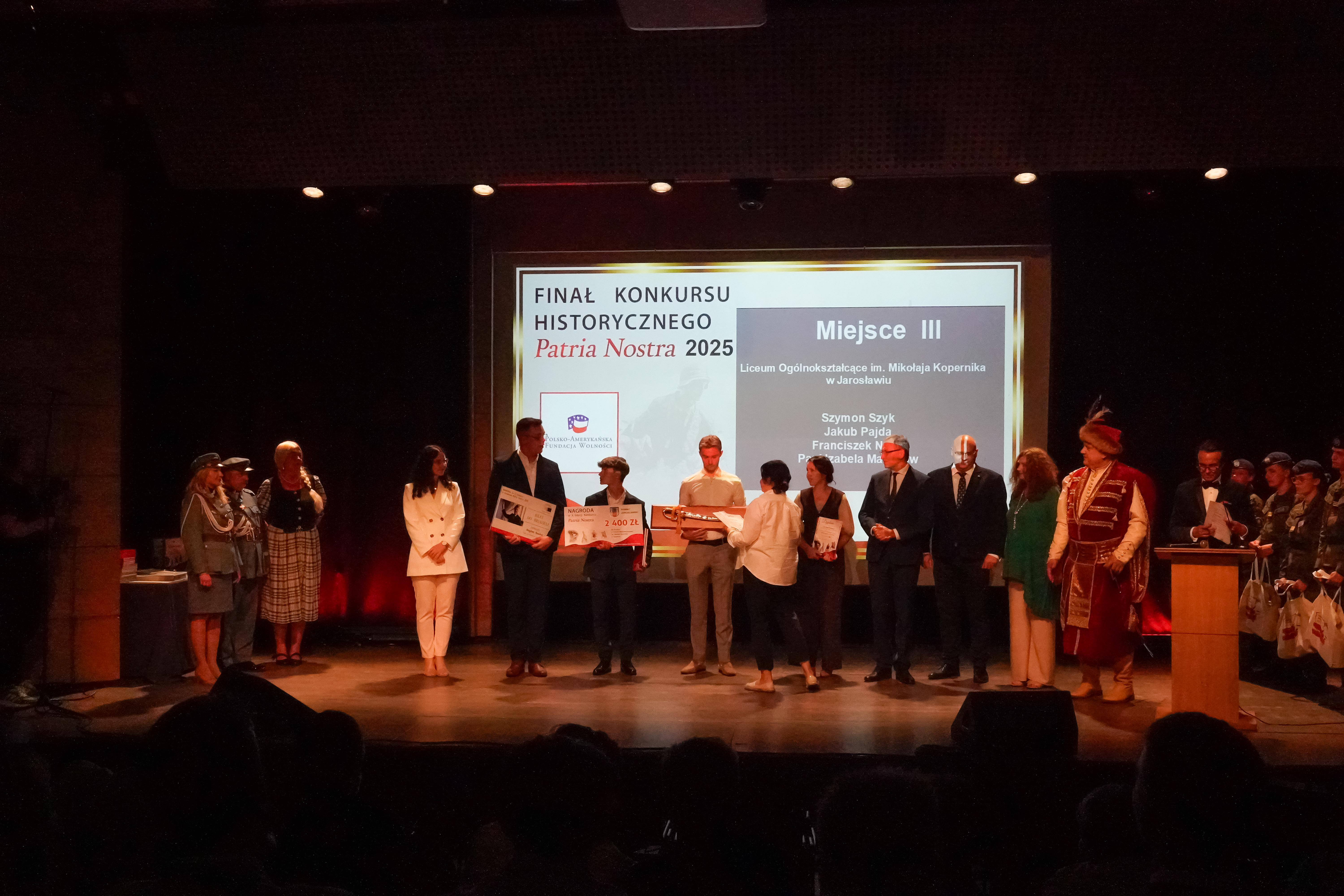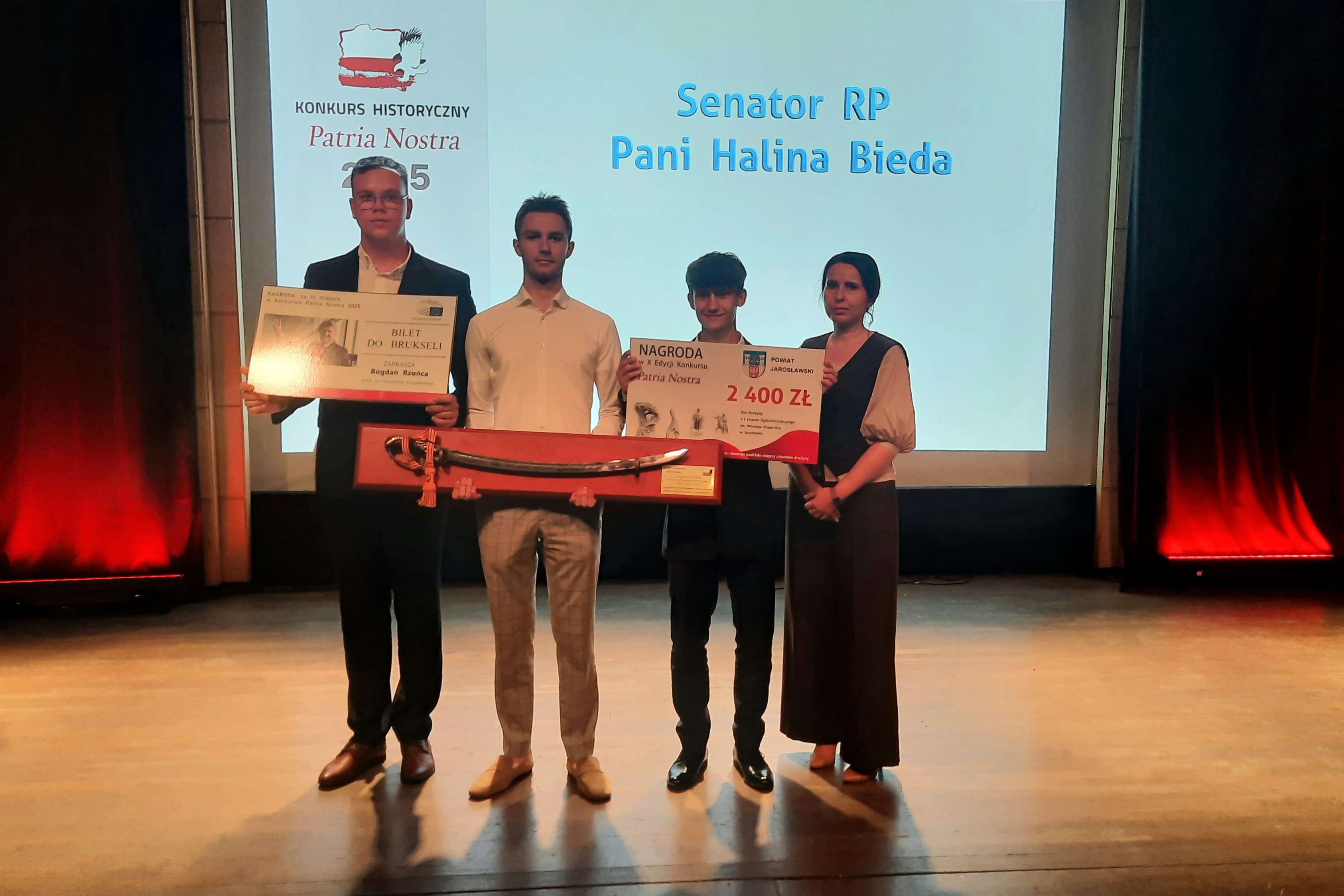 • Uczniowie Kopernika na Gali Finałowej Patria Nostra 2025 w Krakowie. Wczoraj Pisaliśmy Państwu o Franciszku Nodze, Jakubie Pajdzie i Szymonie Szyku, którzy pod opieką pani Izabeli Matwijów nagrali film pt. „Stanisław Swianiewicz”, który zgłosili do pewnego prestiżowego konkursu… Wymienieni uczniowie klasy III F w I Liceum Ogólnokształcącym im. Mikołaja Kopernika w Jarosławiu, w ubiegły poniedziałek uczestniczyli w Gali Finałowej X edycji Filmowego Konkursu Historycznego „Patria Nostra 2025”. Wydarzenie odbyło się w Muzeum Sztuki i Techniki Japońskiej Manggha w Krakowie. W 10. edycji Filmowego Konkursu Historycznego Patria Nostra – Region Południe udział wzięło 172 uczniów i nauczycieli z województw: małopolskiego, śląskiego, podkarpackiego, opolskiego oraz świętokrzyskiego. Do rywalizacji dołączyły także 4 drużyny polonijne – dwie z Litwy i dwie z Ukrainy. Łącznie w konkursie uczestniczyło 45 drużyn. Nasi uczniowie – o czym z radością i dumą będziemy głośno się chwalić – zajęli III miejsce w konkursie, zdobywając uznanie jury oraz publiczności. W tym jakże ważnym wydarzeniu, naszym nagrodzonym towarzyszyły naczelnik Wydziału Edukacji i Spraw Społecznych Monika Maziarz oraz opiekun drużyny Izabela Matwijów. Wśród nagród, które trafiły do ekipy z Kopernika, znalazła się m.in. edukacyjna wycieczka do Brukseli  ufundowana przez posła do Parlamentu Europejskiego Bogdana Rzońcę, nagroda finansowa w wysokości 2400 zł przekazana przez starostę powiatu jarosławskiego Kamila Dziukiewicza, a także wyjątkowa replika polskiej szabli oficerskiej, ufundowana przez marszałka województwa małopolskiego. Serdecznie gratulujemy naszym uczniom tego wspaniałego sukcesu! Jesteśmy dumni z ich zaangażowania i talentu, a także cieszymy się, że mogli reprezentować naszą szkołę w tak prestiżowym konkursie. Życzymy powodzenia w dalszych wyzwaniach! tekst. Patrycja Strawa-Buryło