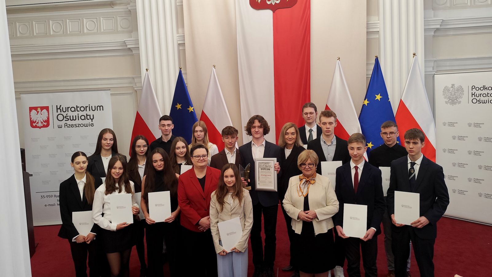 Dyplomy stypendystom wręczali: Minister Edukacji Narodowej Katarzyna Lubnauer, wojewoda podkarpacki Teresa Kubas-Hul, podkarpacki kurator oświaty Dorota Nowak-Maluchnik.