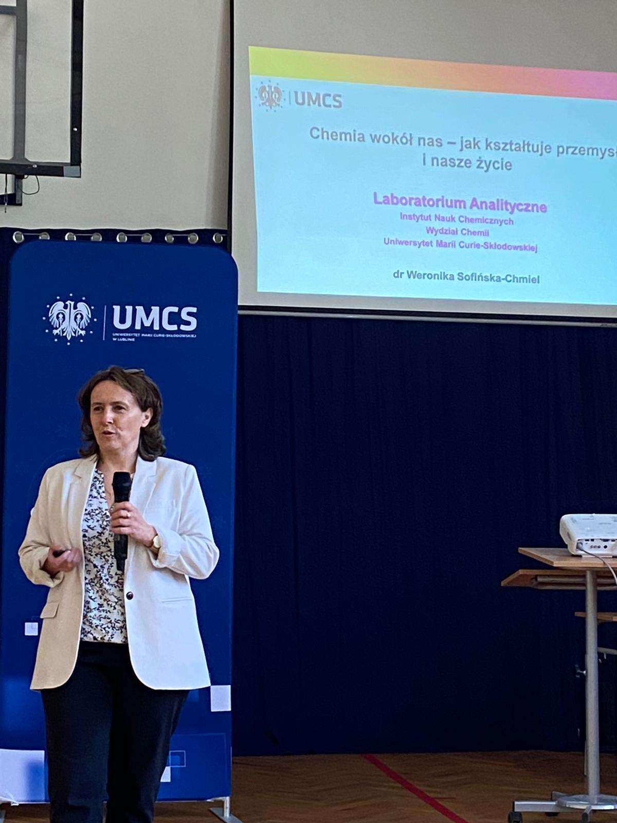 Dziękujemy za obecność dr Weronice Sofińskiej z UMCS w Lublinie, która wygłosiła wykład „Chemia wokół nas. Jak kształtuje przemysł i nasze życie?”, skierowany do uczestników konkursu oraz uczniów naszej szkoły z kierunków technik analityk i technik technologii żywności.