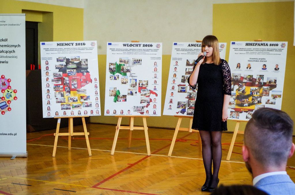 Następnie odbyło się podsumowanie projektu „MOBILNOŚĆ UCZNIÓW – SPOSOBEM NA LEPSZY START ZAWODOWY I ŻYCIOWY” Nr 2014-1-PL01-KA102-001443 realizowanego w placówce w latach 2014-2016. Tę część spotkania poprowadziła wicedyrektor Pani Lidia Sobczyńska przedstawiając na początku najistotniejsze informacje na temat projektu.