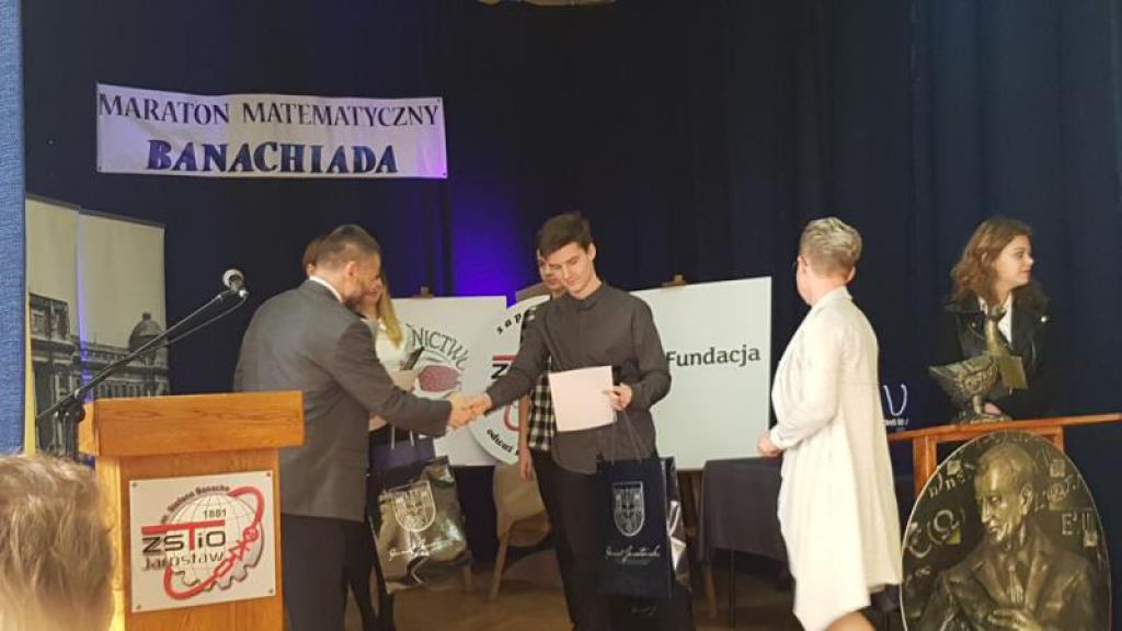 - V Ogólnopolski Maraton Matematyczny – Banachiada w ZSTiO zakończony. 31 marca 2017, podczas obchodów 125 rocznicy urodzin Patrona Szkoły – wybitnego matematyka - Stefana Banacha, odbyło się uroczyste podsumowanie Banachiady i wręczenie zwycięzcom atrakcyjnych nagród: laptopów, czytników e-booków, tabletów. Cenne nagrody młodzież otrzymała dzięki Fundacji mBanku oraz Nadleśnictwu Jarosław. Natomiast Starosta Jarosławski ufundował statuetki dla laureatów konkursu oraz gadżety promujące miasto Jarosław. Zespół, który zwyciężył otrzymał tytuł „Banachmistrza”, zaś szkoła, z której pochodzi - statuetkę „Gęsi”. Wszyscy uczestnicy maratonu otrzymali dyplomy. Na uroczystość przybyli goście: Stanisław Sopel – Sekretarz Powiatu, Dorota Dejniak- prorektor ds. dydaktycznych PWSTE w Jarosławiu, prof. Ewa Swoboda, specjalista do spraw dydaktyki informatyki oraz Hubert Balicki – przedstawiciel Nadleśnictwa Jarosław. Obecni byli także laureaci i finaliści Banachiady wraz z opiekunami. Uroczystość rozpoczął swym przemówieniem dyrektor szkoły Adam Tomaszewski. Podkreślił, że od 5 lat konkurs cieszy się ogromną popularnością wśród młodzieży szkół gimnazjalnych z regionu Podkarpacia. Ponadto celem konkursu jest próba przełamania stereotypów sugerujących, że matematyka jest przedmiotem trudnym i zrozumiałym tylko dla nielicznej grupy wybrańców. Dodał także, że konkurs ukazuje w sposób niekonwencjonalny piękno królowej nauk, zachęca do twórczego i kreatywnego myślenia, a także pobudza wśród młodzieży ducha zdrowej rywalizacji. Następnie pan dyrektor poprosił przybyłych gości o zabranie głosu. Przemawiający: doc. dr Renata Dejniak i Stanisław Sopel podkreślili rangę i szczególne miejsce Maratonu Matematycznego, jakim jest Banachiada w życiu młodych ludzi. Parę dni wcześniej, bo 17 marca 2017 uczniowie przez 5 godzin mieli do rozwiązania ponad 120 zadań matematycznych o różnym stopniu trudności. O zwycięstwie decydowała ilość zdobytych punktów. Maraton został rozstrzygnięty. Spośród uczestników wyłoniono trzy zwycięskie dwuosobowe zespoły (laureaci) i siedem zespołów z tytułem finalisty. Są to: Gimnazjum Miejskie im. Władysława Jagiełły w Leżajsku Gimnazjum nr 2 im. Jana Pawła II w Kolbuszowej Publiczne Gimnazjum nr 2 im. ks. Stanisława Konarskiego w Jarosławiu Gimnazjum w Muninie Gimnazjum Katolickie im. bł. Ks. J. Popiełuszki w Stalowej Woli Gimnazjum Nr 1 w Przeworsku im. Kardynała Stefana Wyszyńskiego Gimnazjum Publiczne im. Ks. Bronisława Markiewicza w Pruchniku Publiczne Gimnazjum nr 1 im. św. Królowej Jadwigi w Jarosławiu Gimnazjum nr 1 im. Kardynała Stefana Wyszyńskiego w Nisku Zespół Szkół nr 1 w Kolbuszowej - Gimnazjum nr 1 im. 11 Listopada Po ogłoszeniu wyników miała miejsce część artystyczna. Wszystkim zebranym: gościom, nauczycielom, uczniom zaprezentowała się młodzież z naszej szkoły, która w programie artystycznym przybliżyła postać patrona ZSTiO – Stefana Banacha. Występ miał charakter wspomnień. O Banachu „mówili” jego szkolni koledzy, przyjaciele i współpracownicy. Tekst i zdj. ZSTiO w Jarosławiu