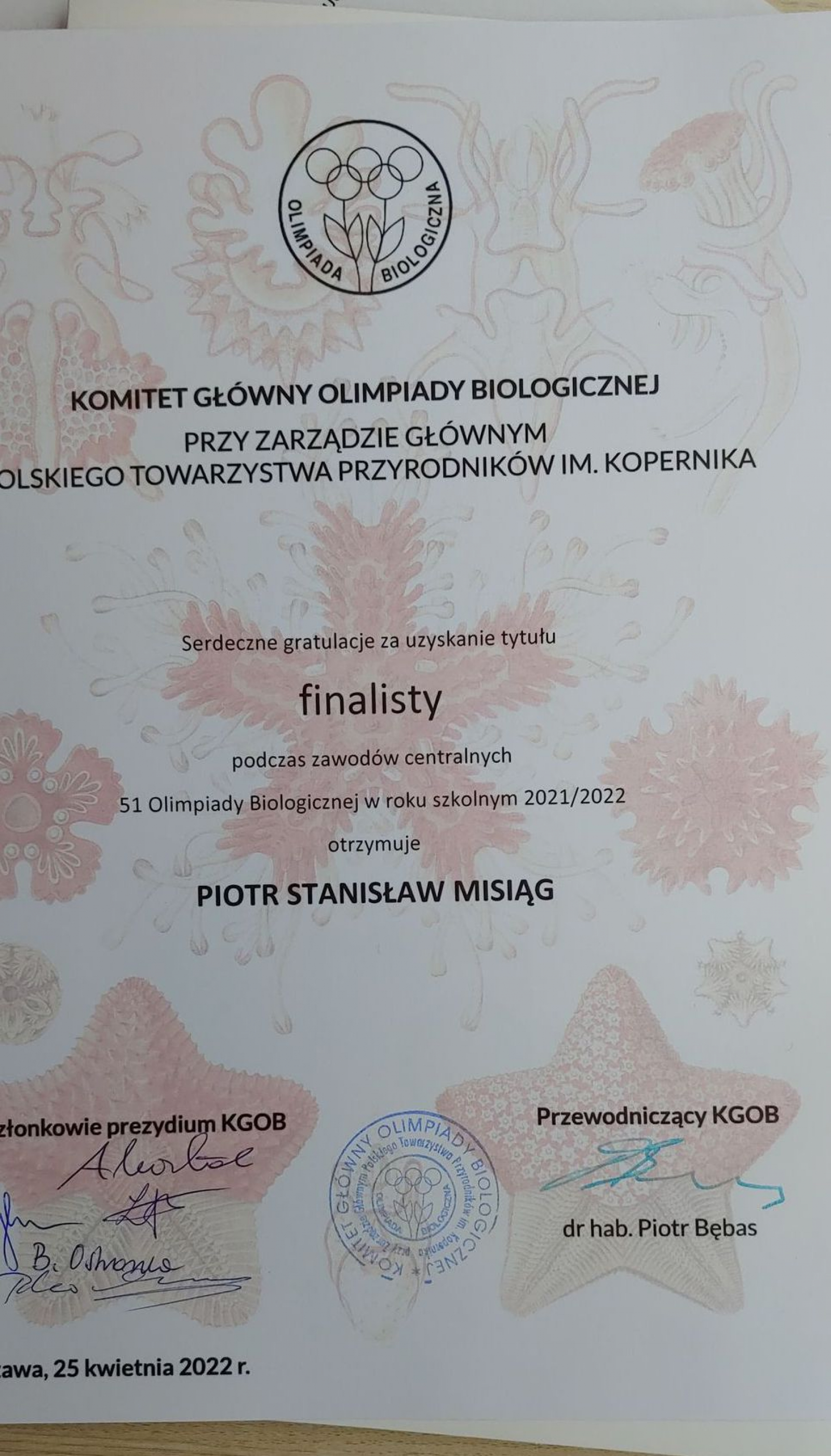 25 kwietnia 2022 r. w Warszawie zakończył się finał centralny 51 Olimpiady Biologicznej. Jesteśmy ogromnie dumni z osiągnięcia tytułu finalisty przez Piotra Misiąga, ucznia Zespołu Szkół Drogowo-Geodezyjnych i Licealnych. Ta bardzo trudna olimpiada na etapie centralnym składała się z trzech części: praktycznej w pracowniach botanicznej, zoologicznej, biochemicznej i statystyczno-bioinformatycznej. Ponadto Piotr przystąpił do egzaminu pisemnego oraz bronił swojej pracy badawczej, ocenianej przez dwóch, niezależnych recenzentów.